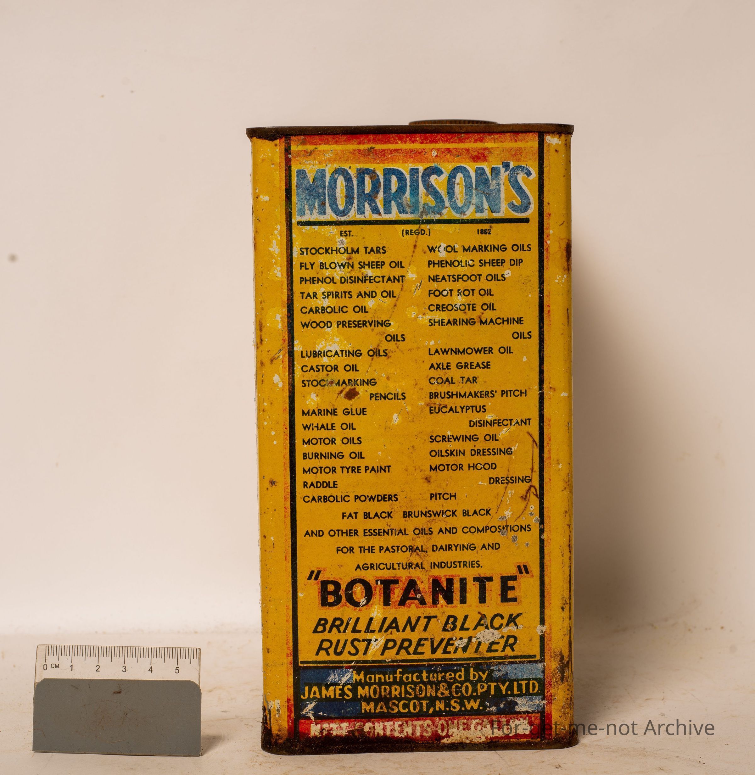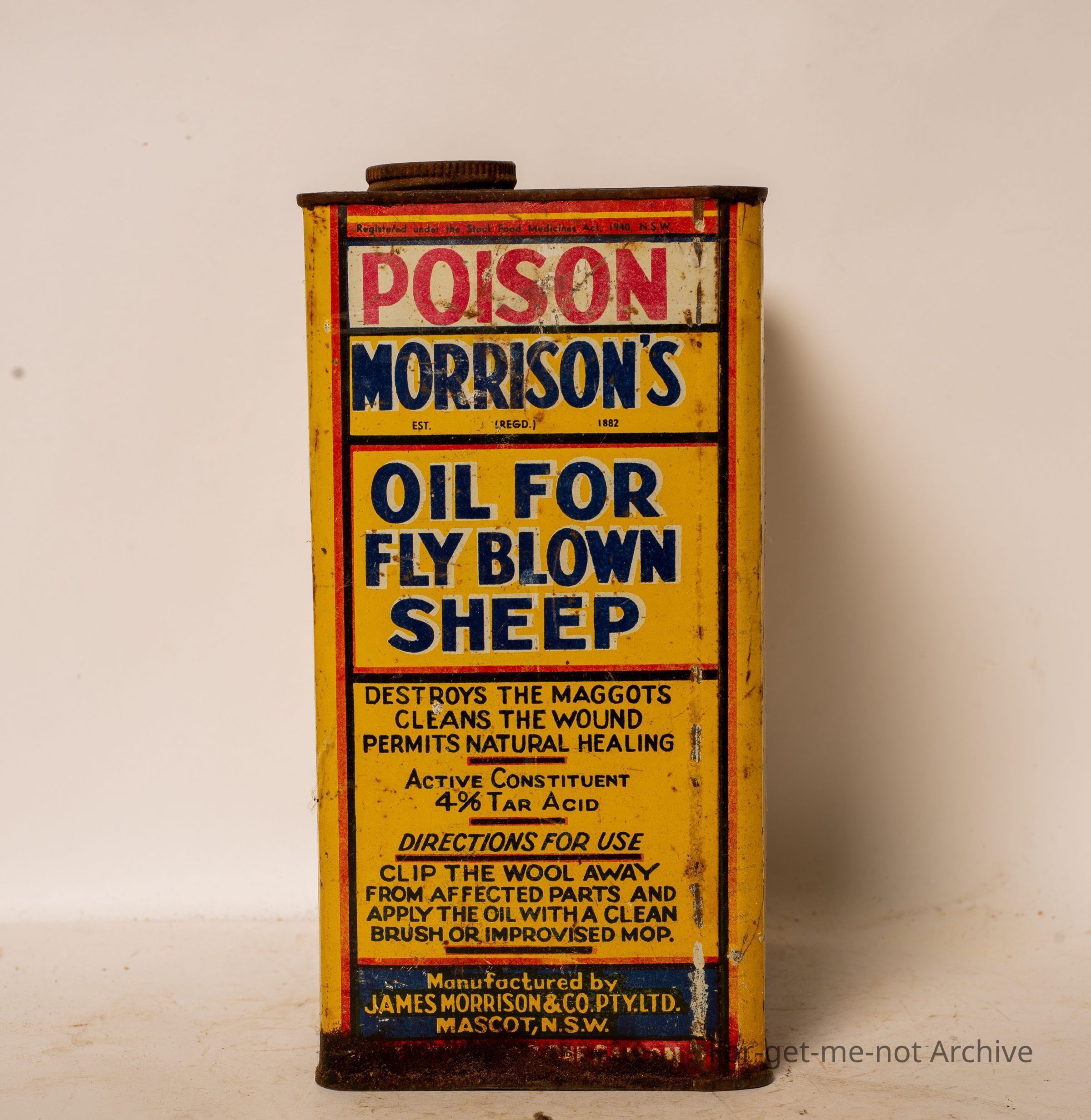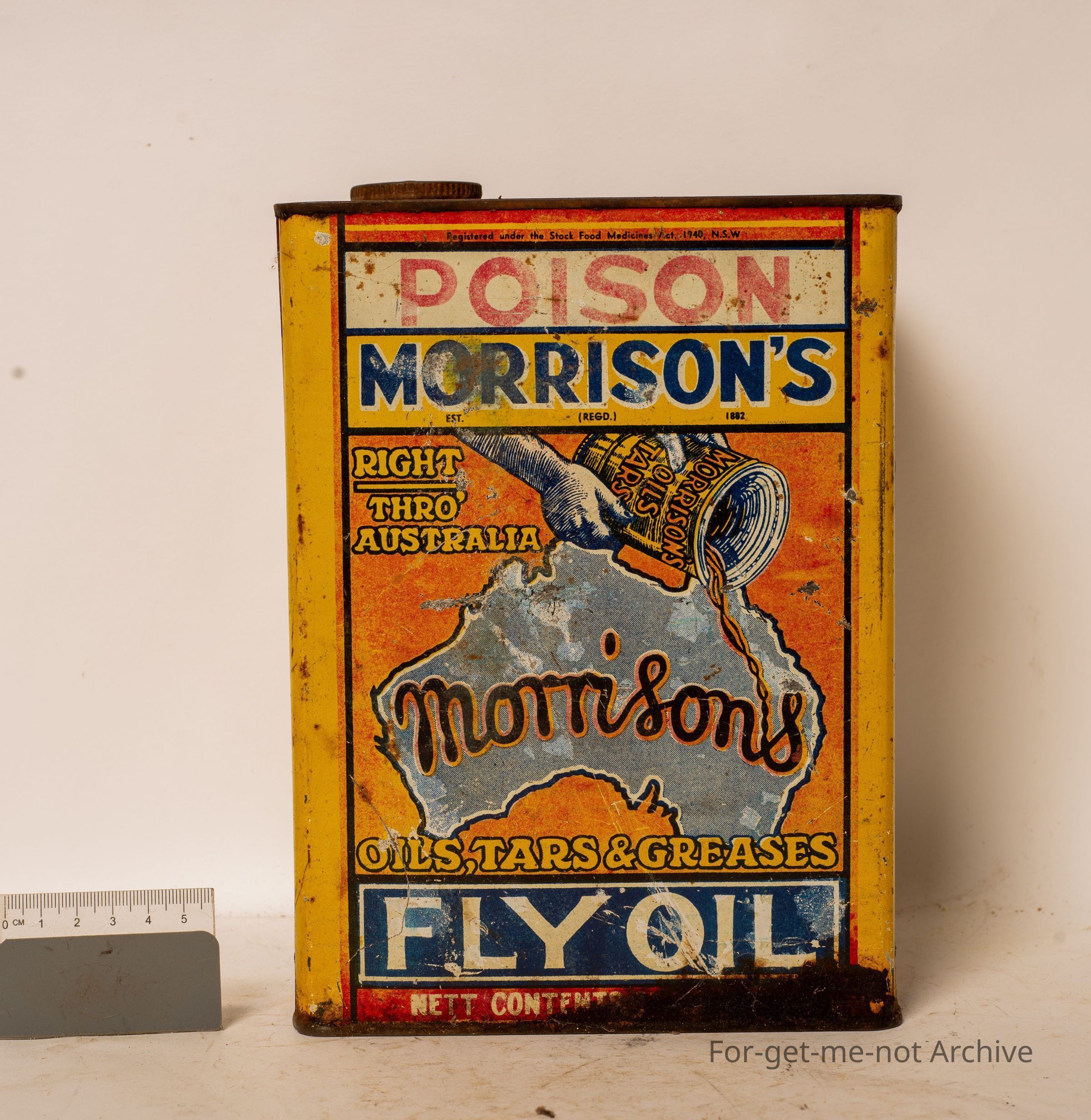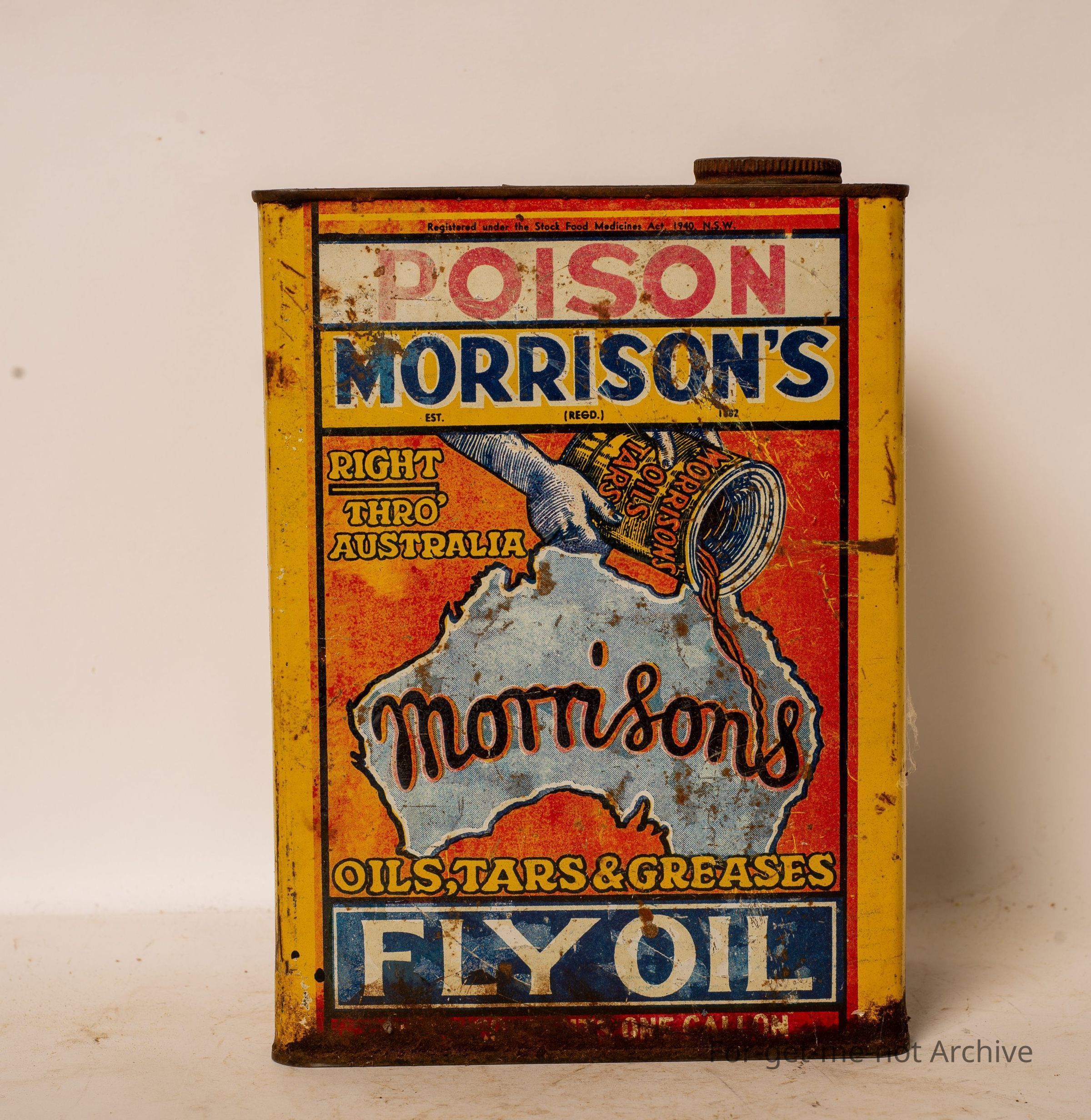 Is another Morrison's tin. This time, "Morrison's fly oil", oils, tars and greases. The image of Australia, this is once again in pretty good condition.
