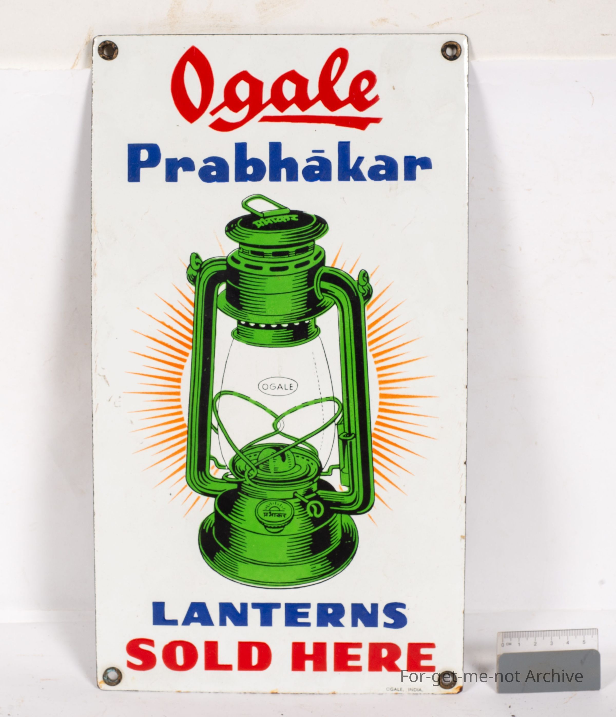 Sangeet Collection. This is a sign advertising O'Gale, lanterns sold here with an image of a hurricane lamp. Quite colourful, decorative, in good order. India