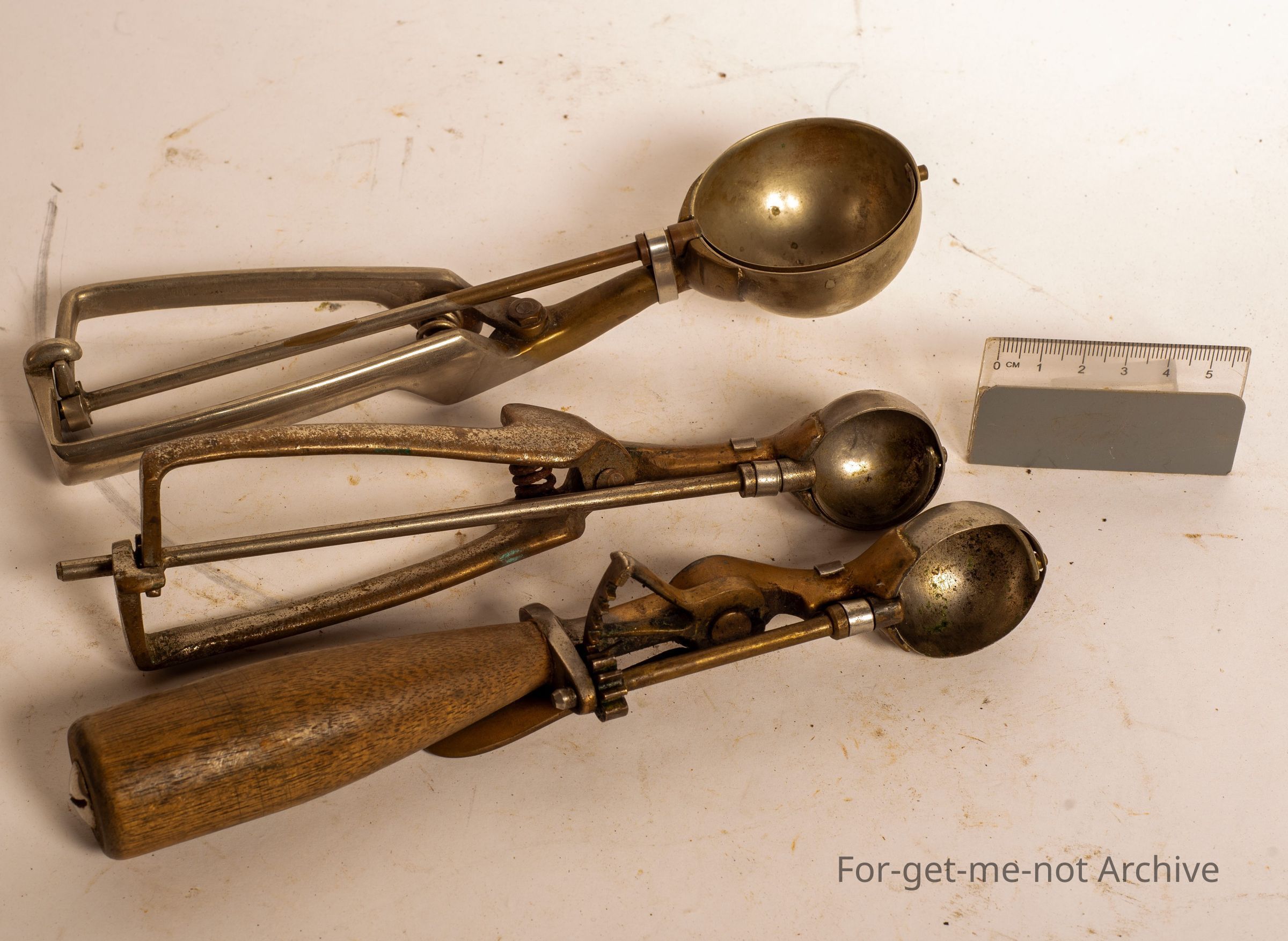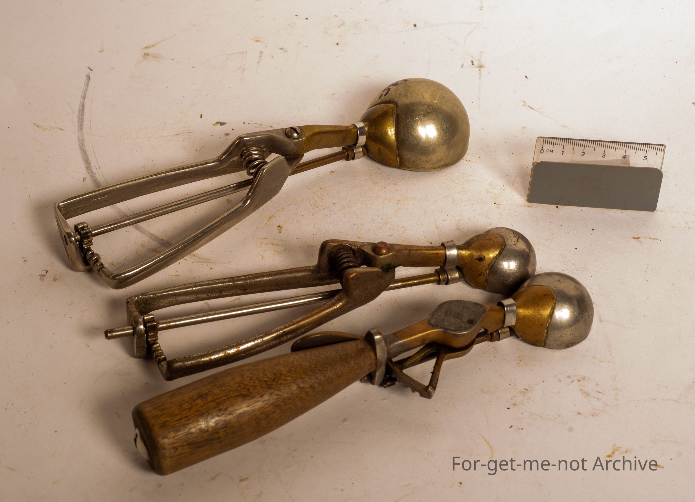 A group of 3 different size ice cream scoops, wooden handles,