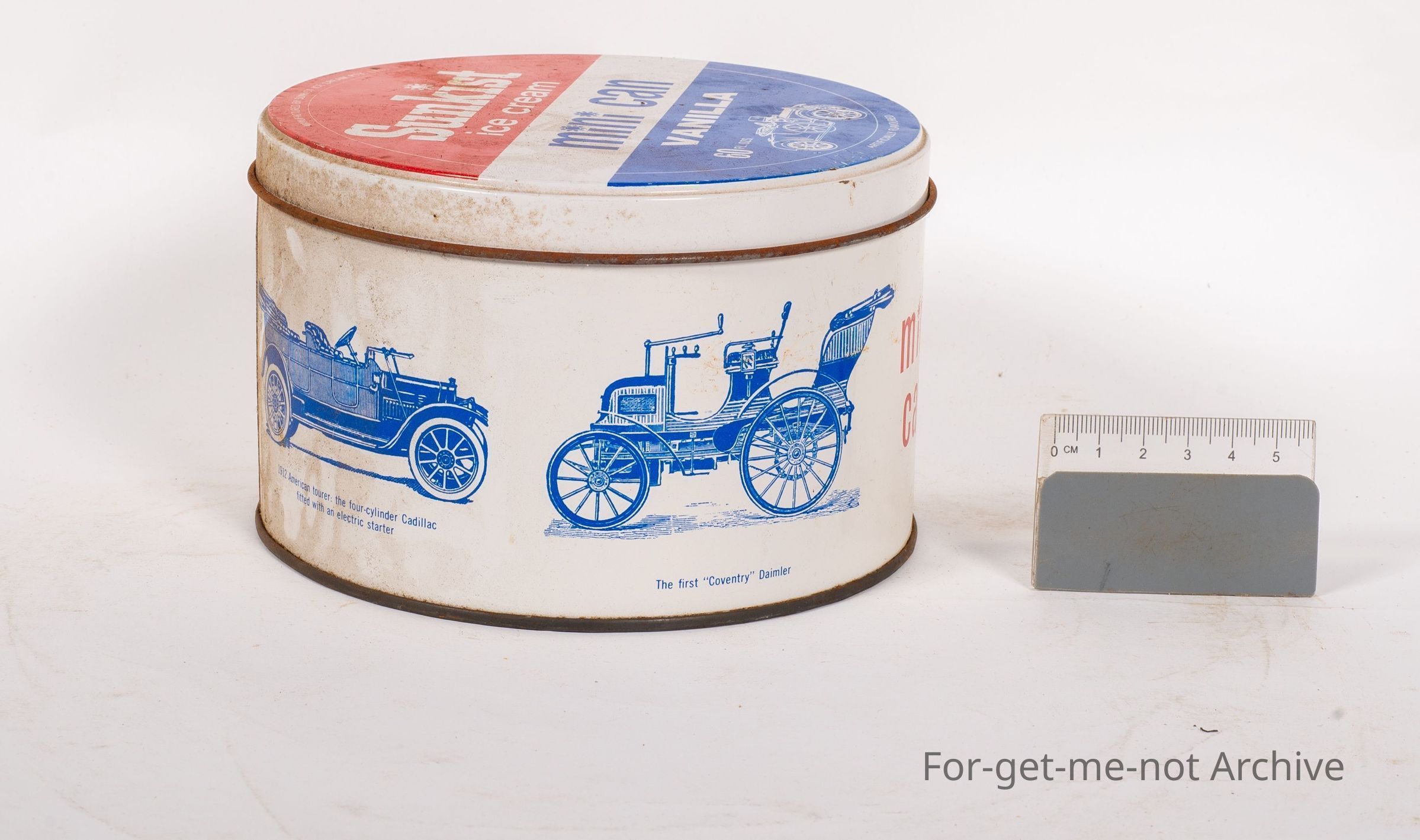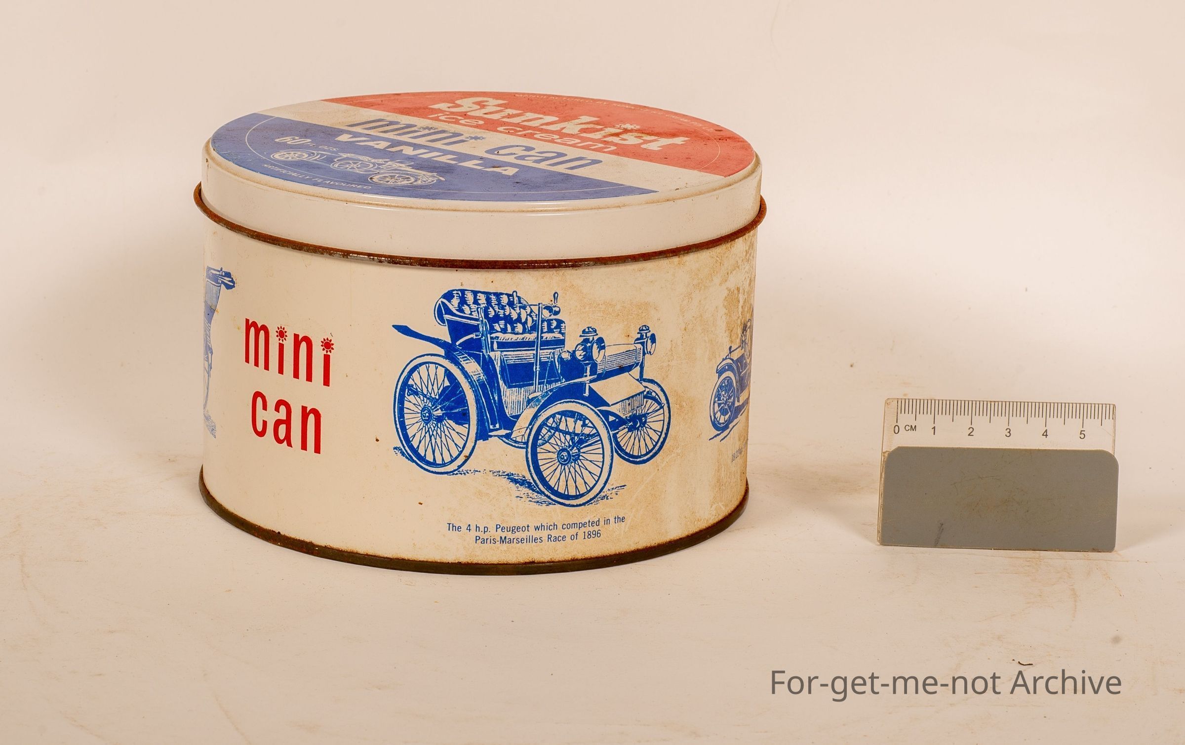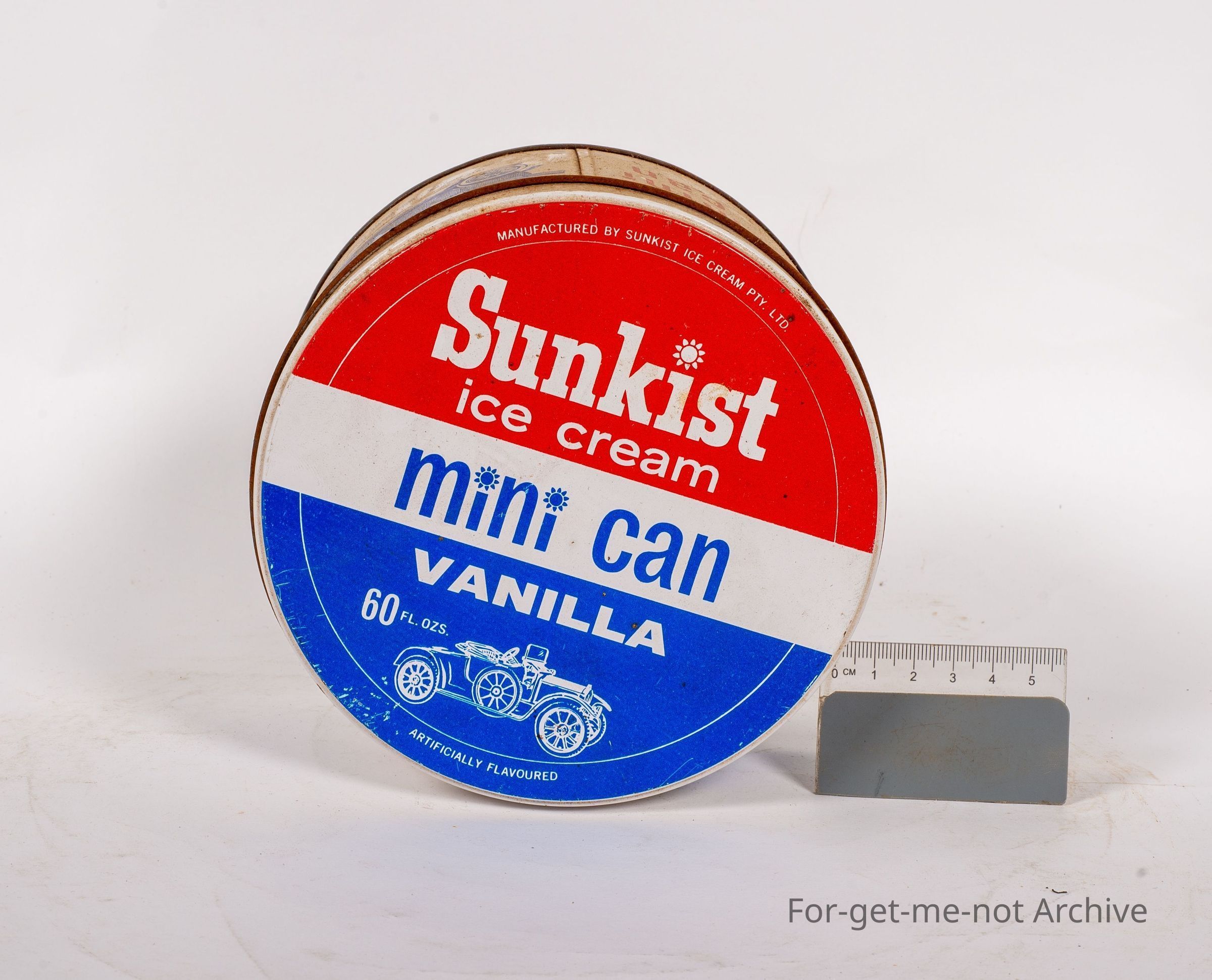 This is a Sunkissed Ice Cream Mini Can Vanilla 60 Fluid Ounces and this has a series of vintage cars printed around the outside of the tin. In very good order.