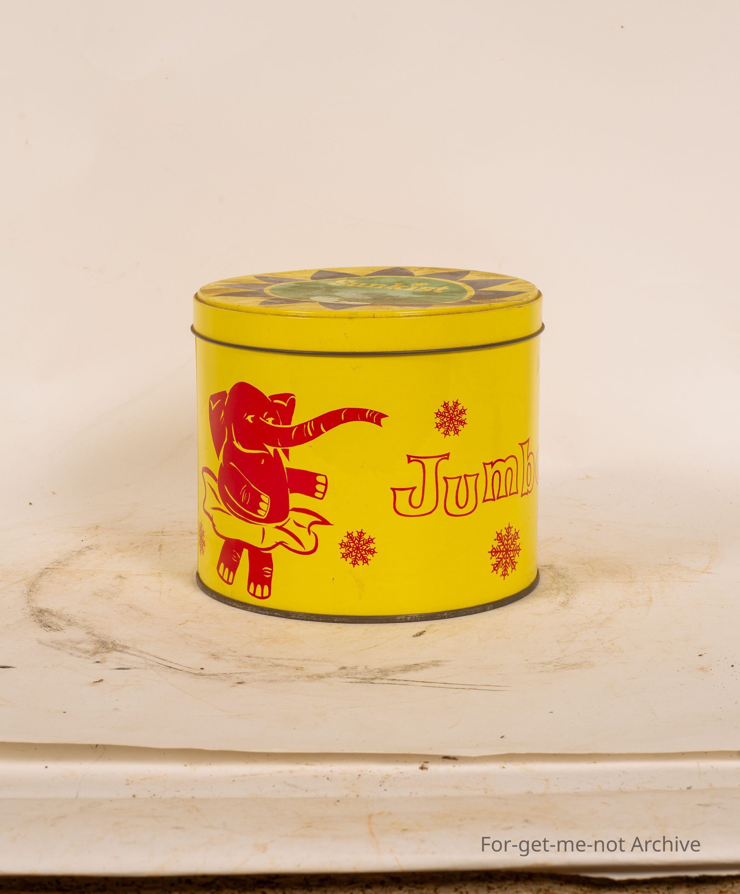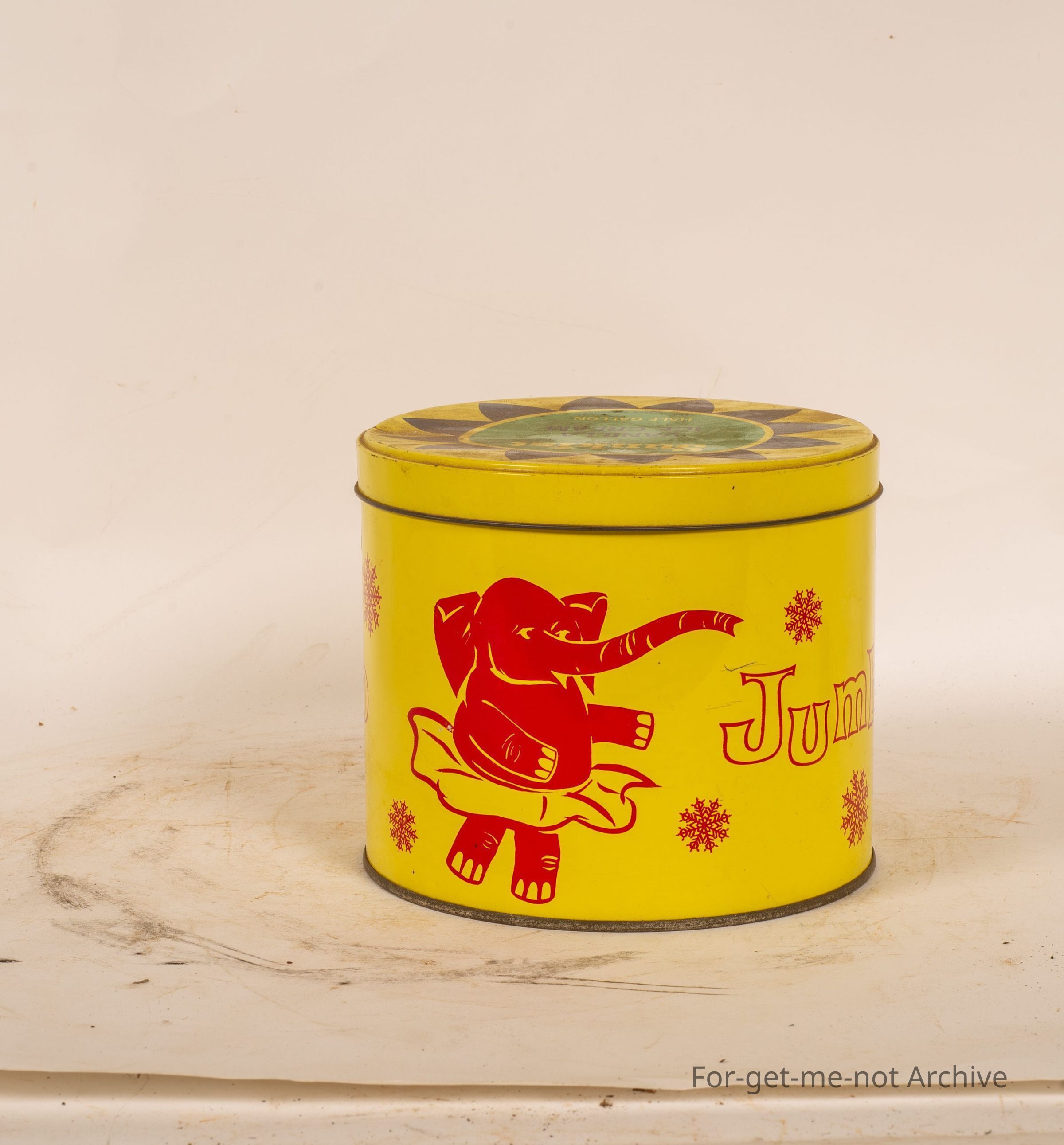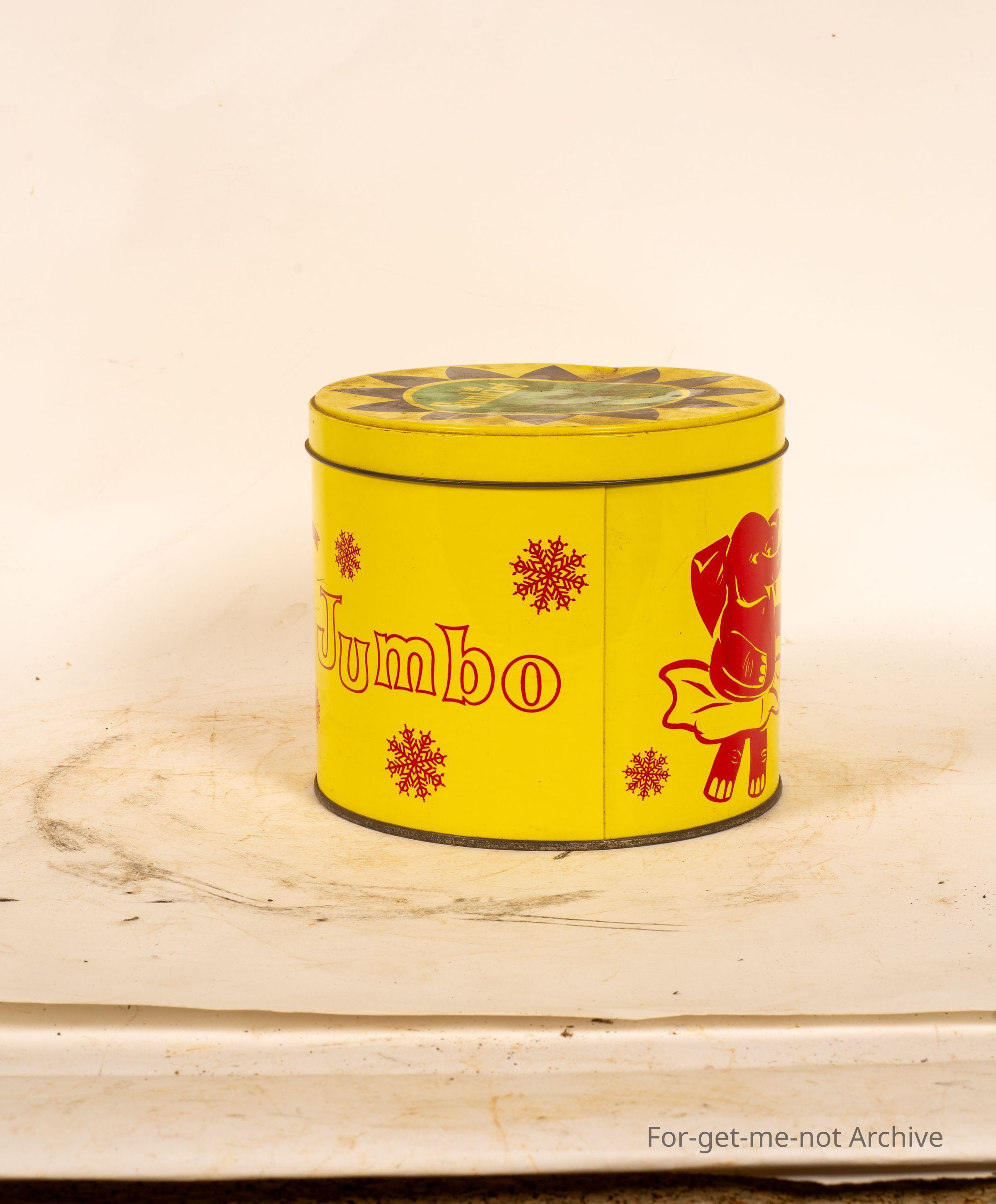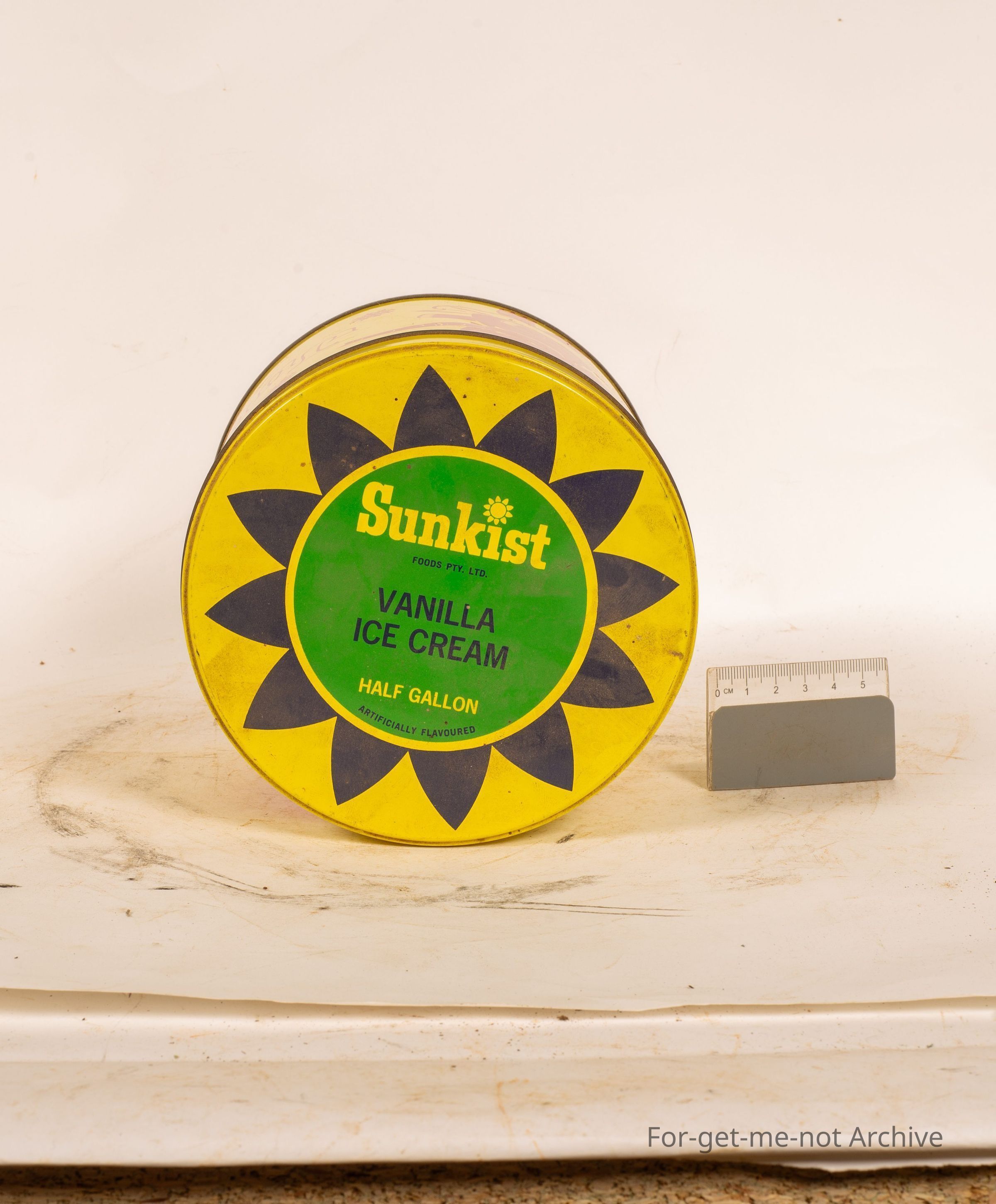 This is a half gallon tin of Sunkist vanilla ice cream, artificially flavoured. The tin has images of dancing elephants. Jumbo.