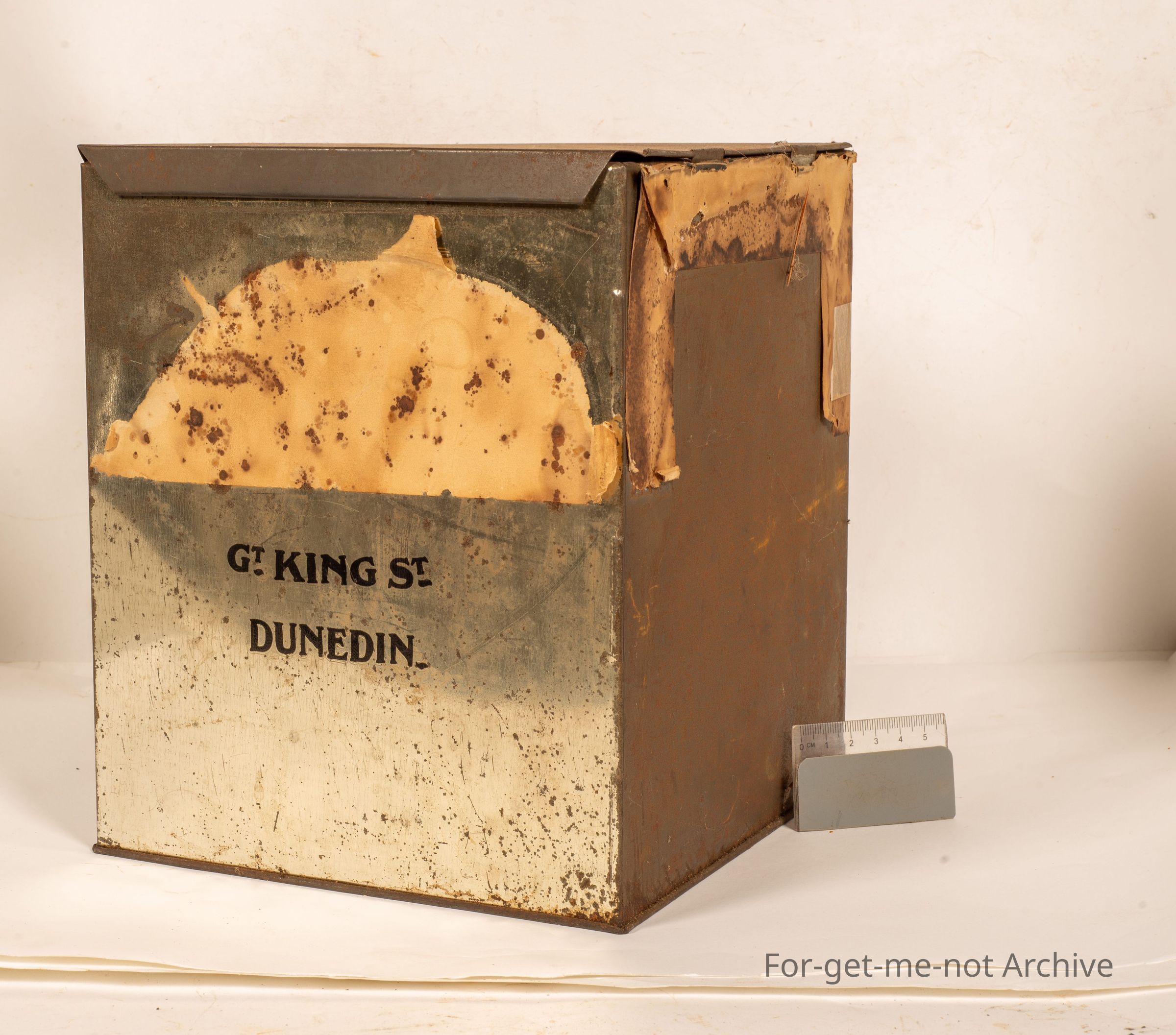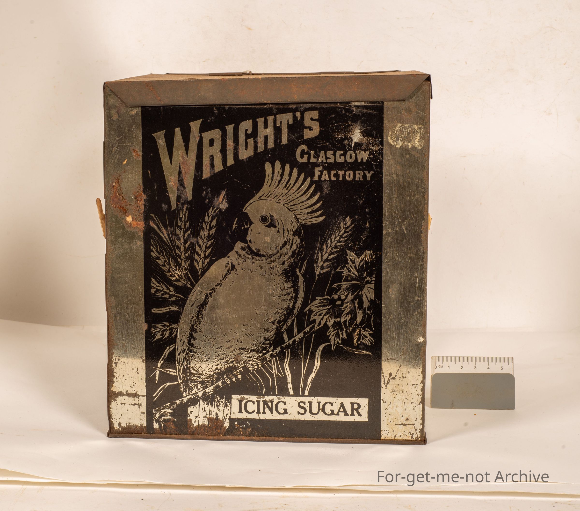 This is from White's Icing Sugar Glasgow factory with a image of a cockatoo, sprigs of wheat, made for an Australian market. It says Great King Street, Dunedin.