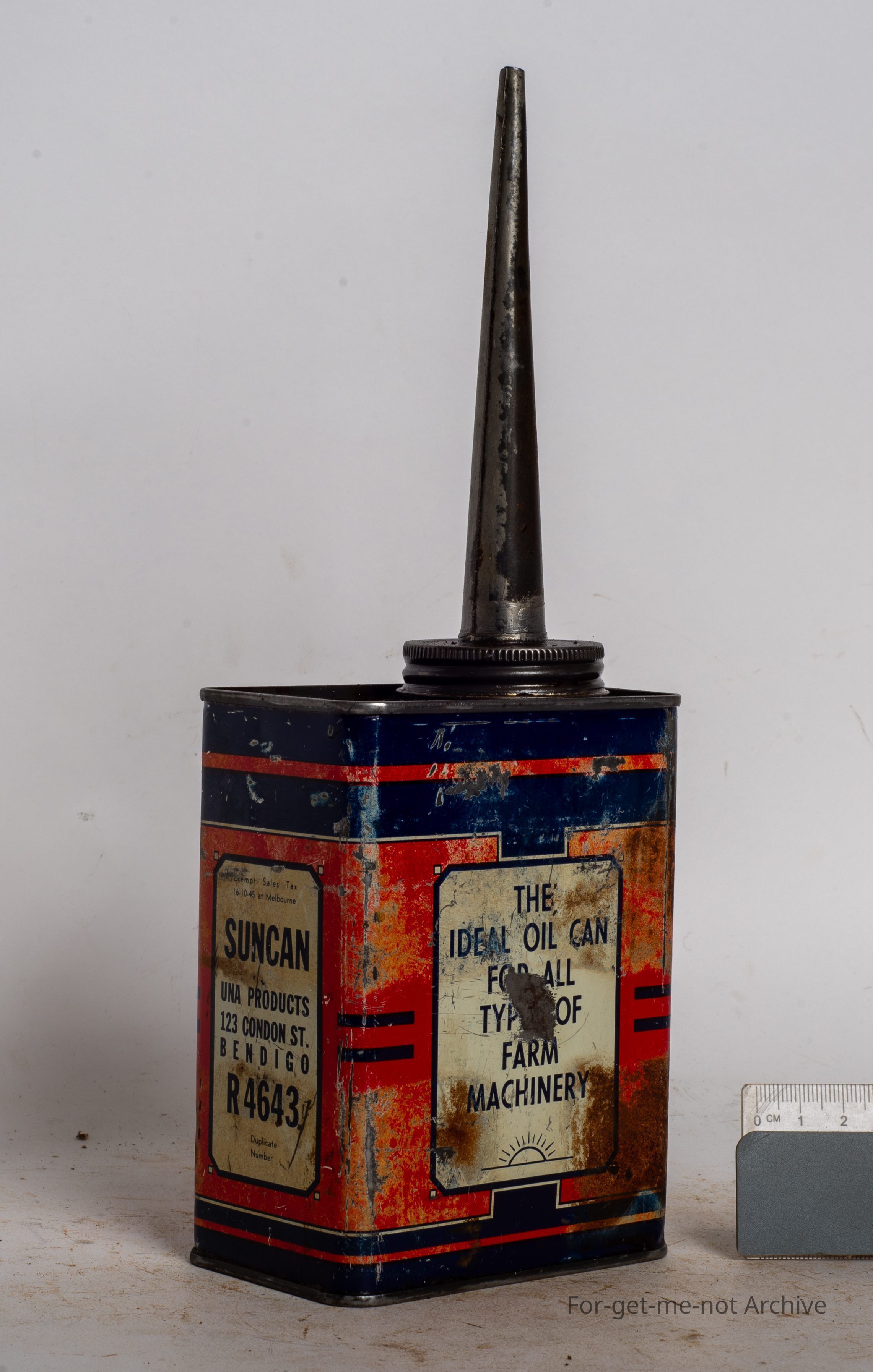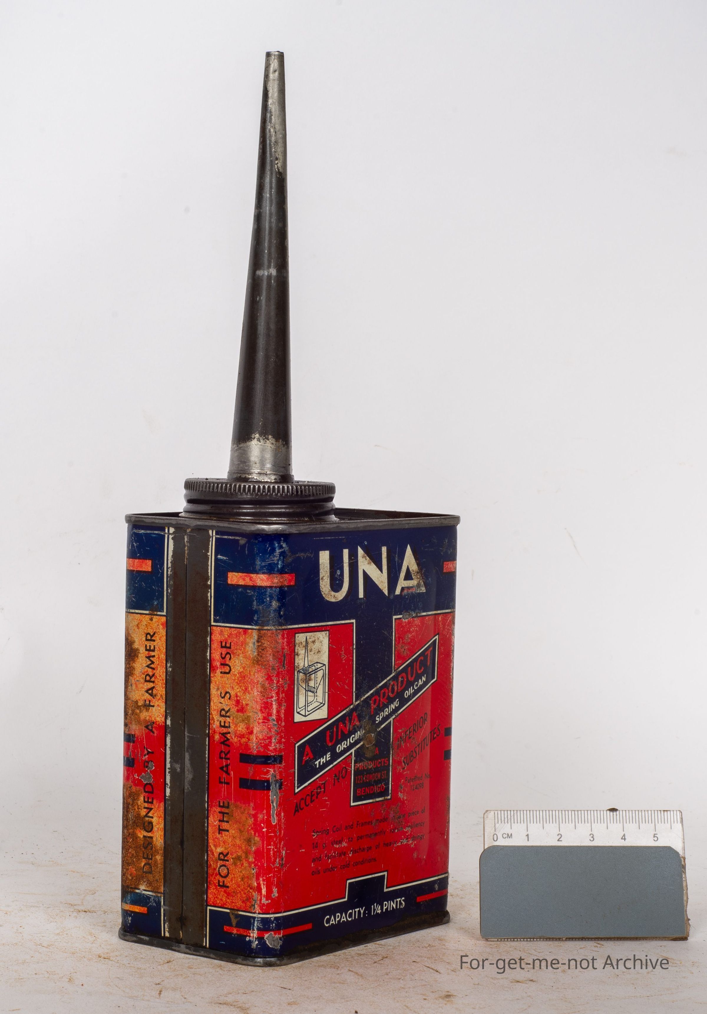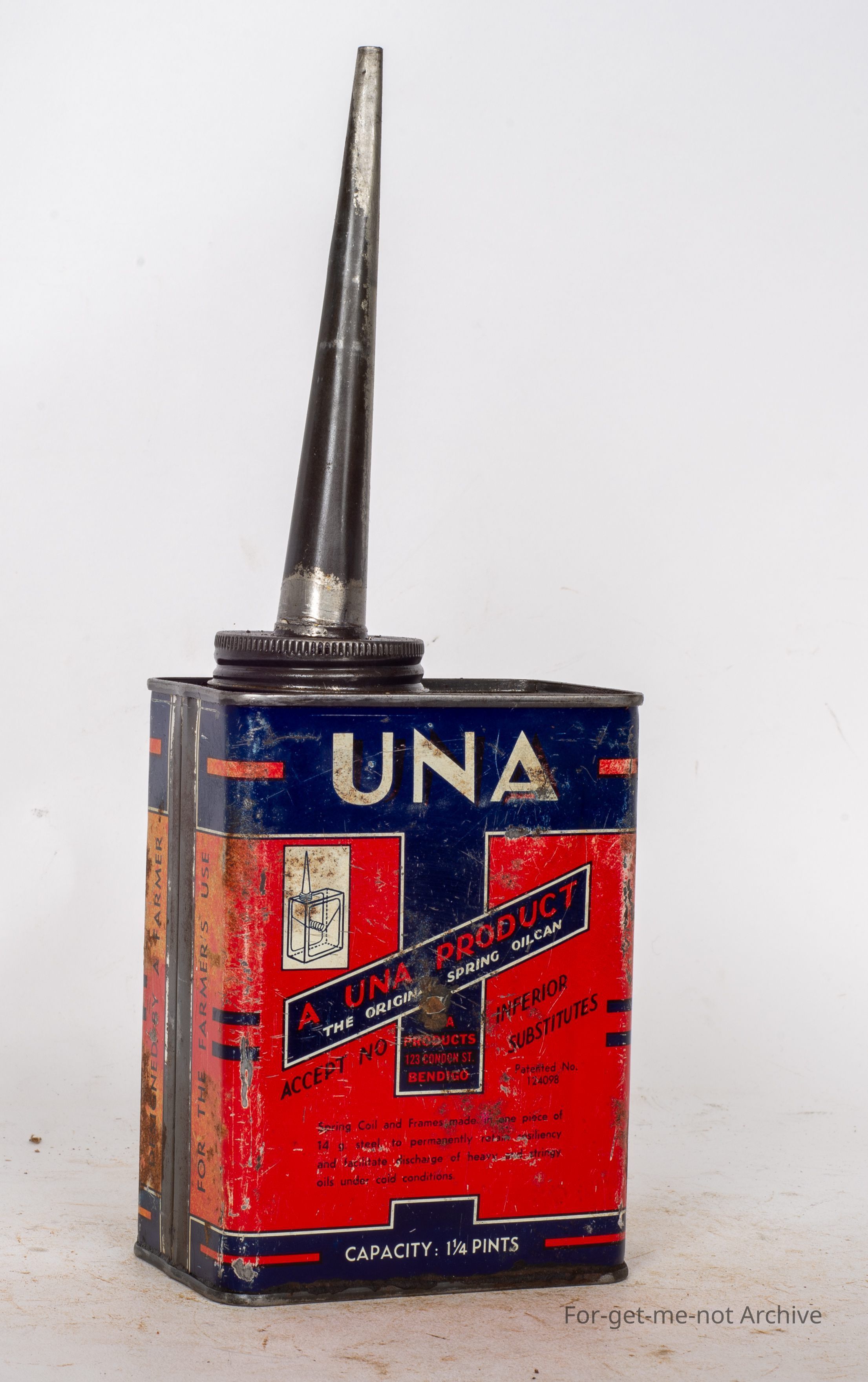 This is the ideal oil can for all types of farm machinery, made by Yuna Products in Bendigo. Yuna was the name of this fellow's wife. They're commonly referred to as the sun can. Very hard to find them in good condition. This one not too badCollection