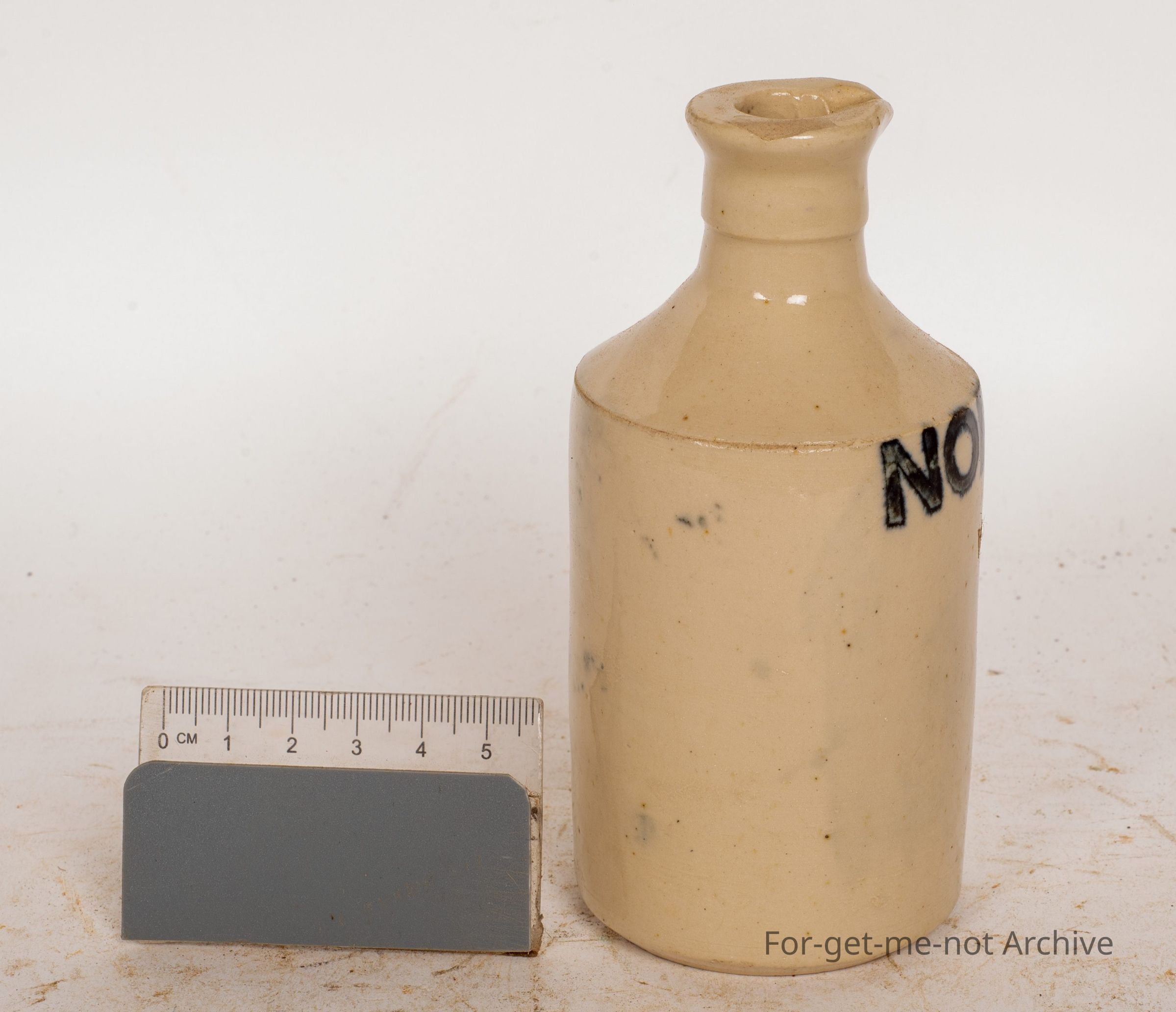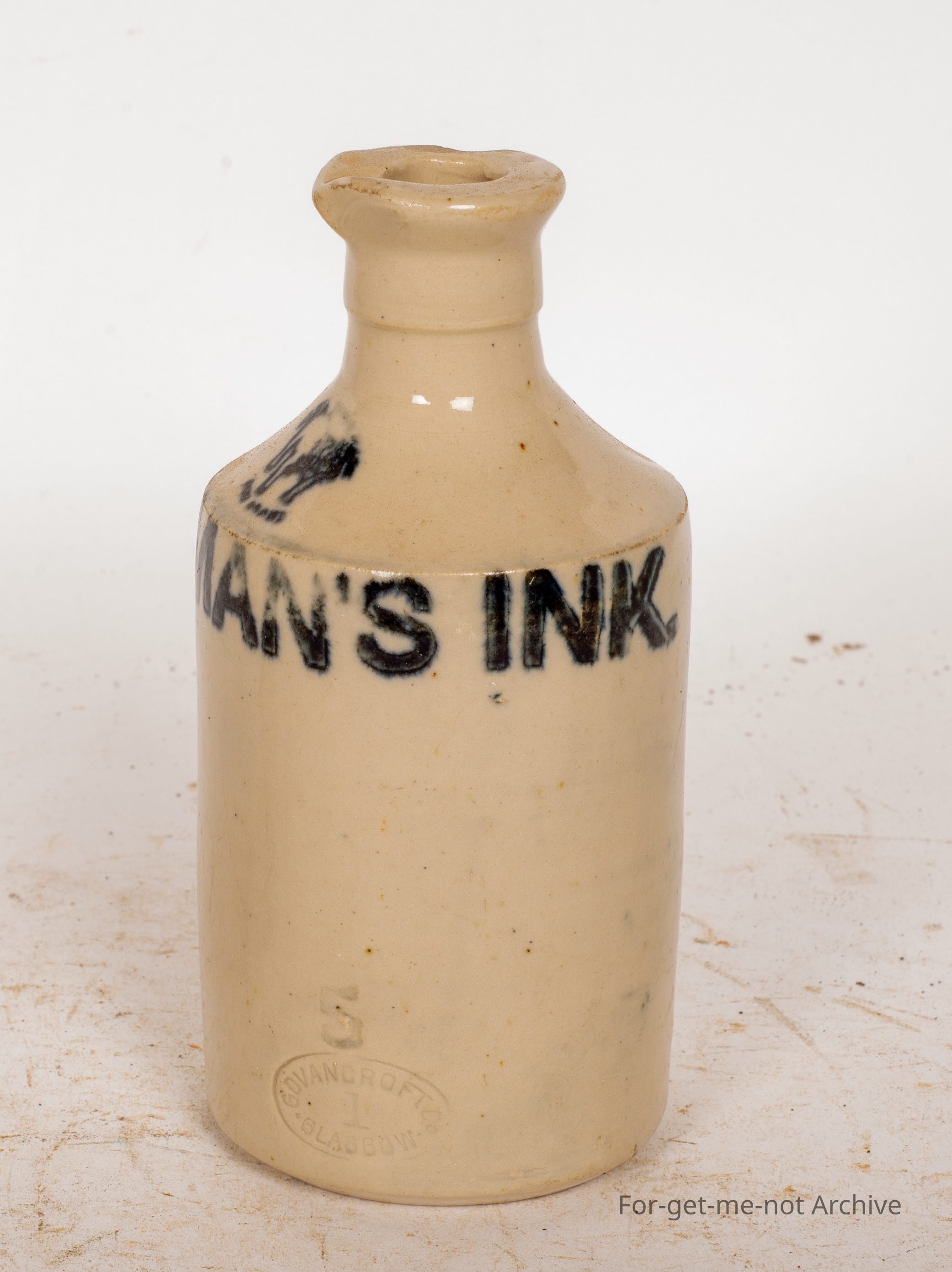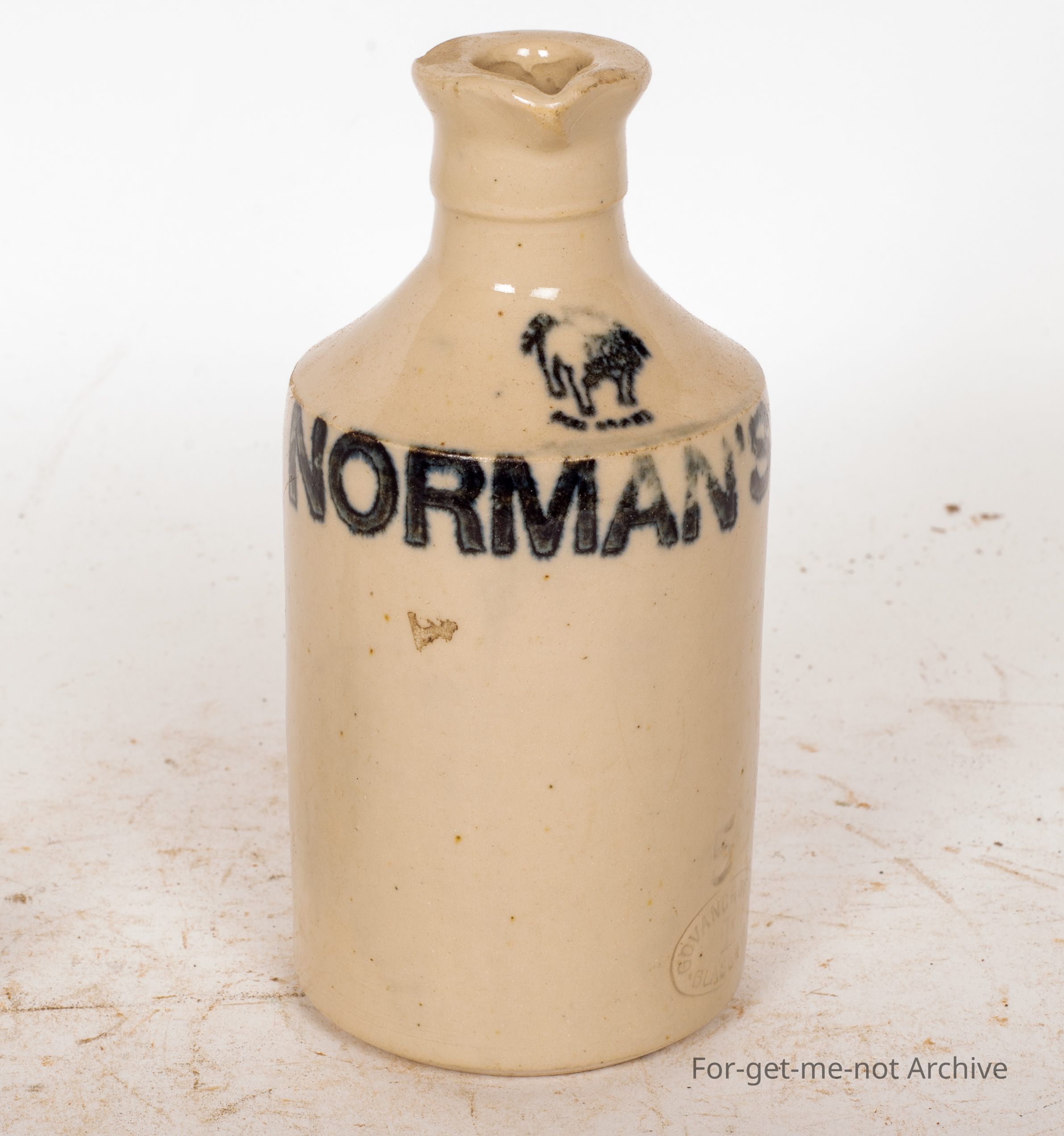 This is a small stoneware ink bottle with a pourer. It has an ink stamp of Norman's ink with a bulldog on the top shoulder. Obviously, an English bottle in lovely condition. A bit unusualCollection