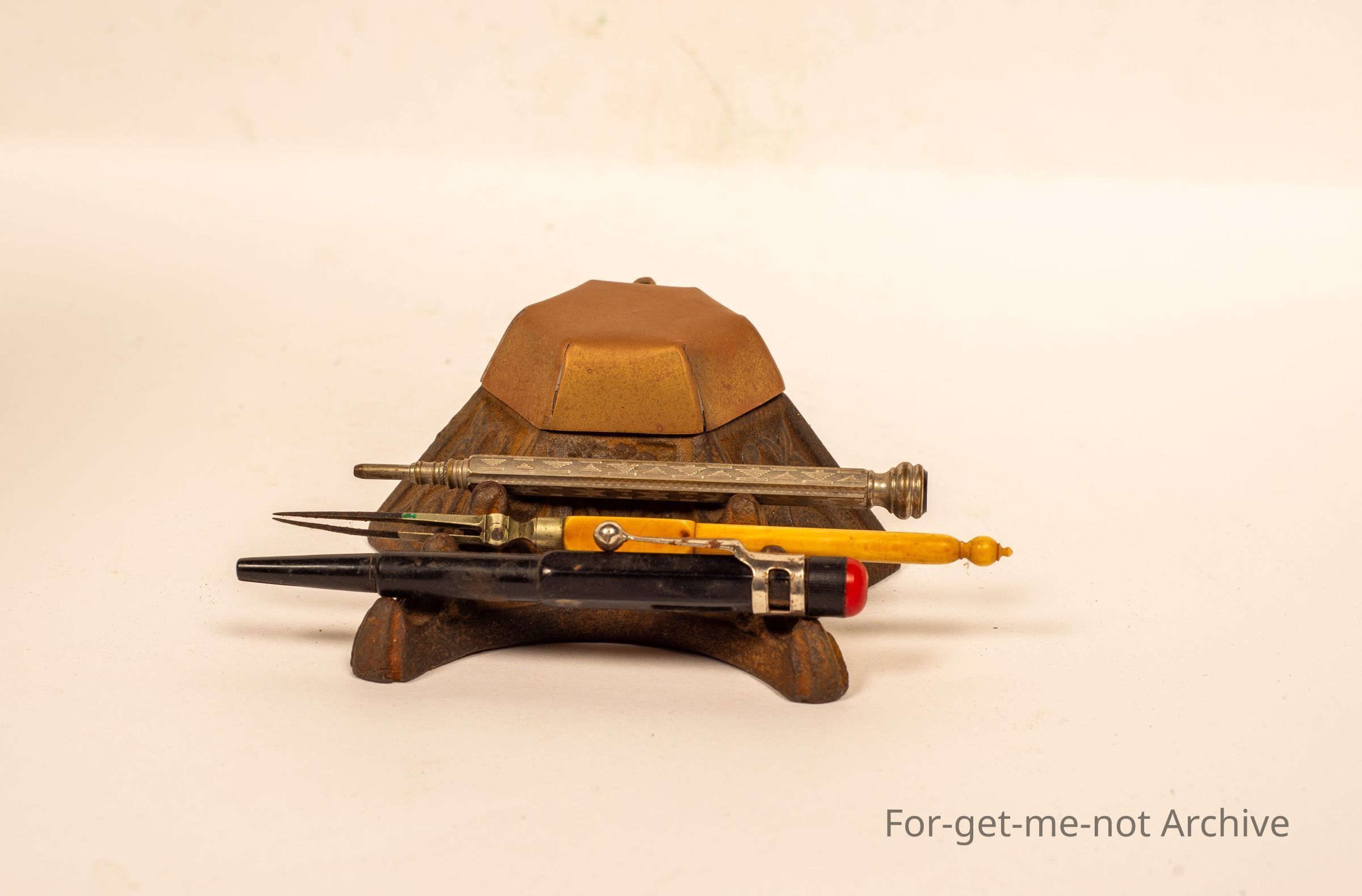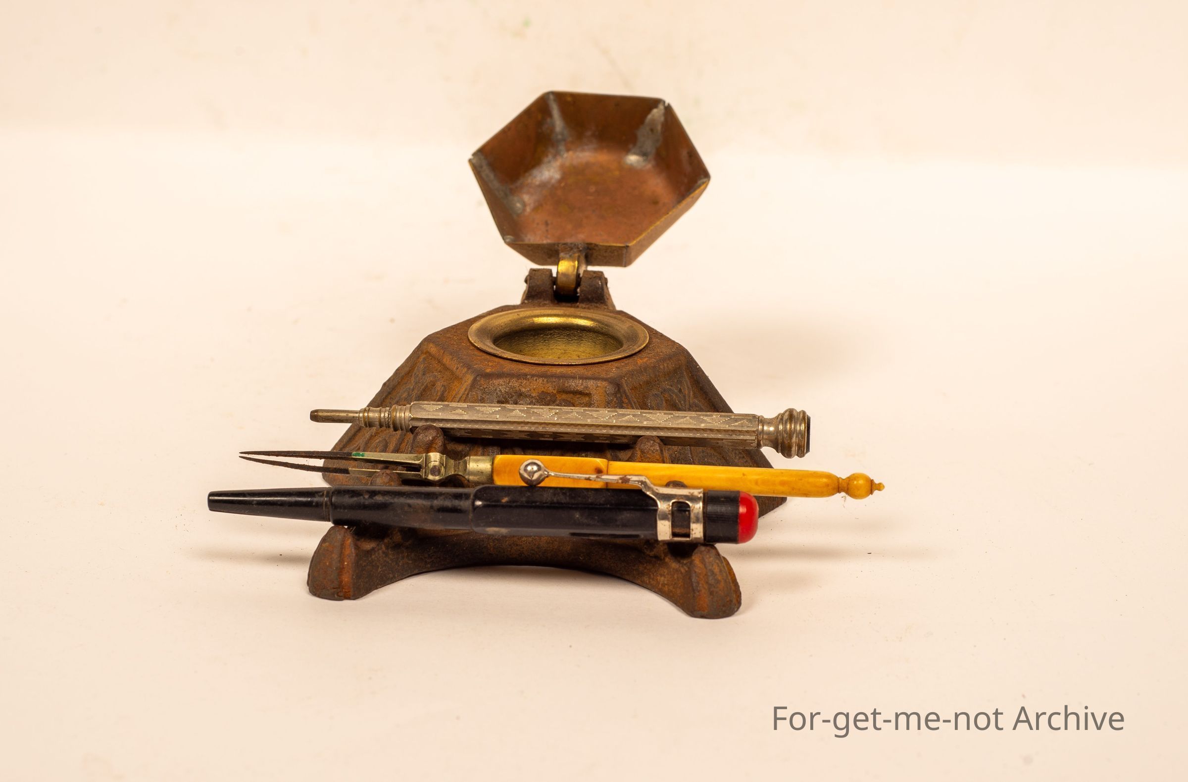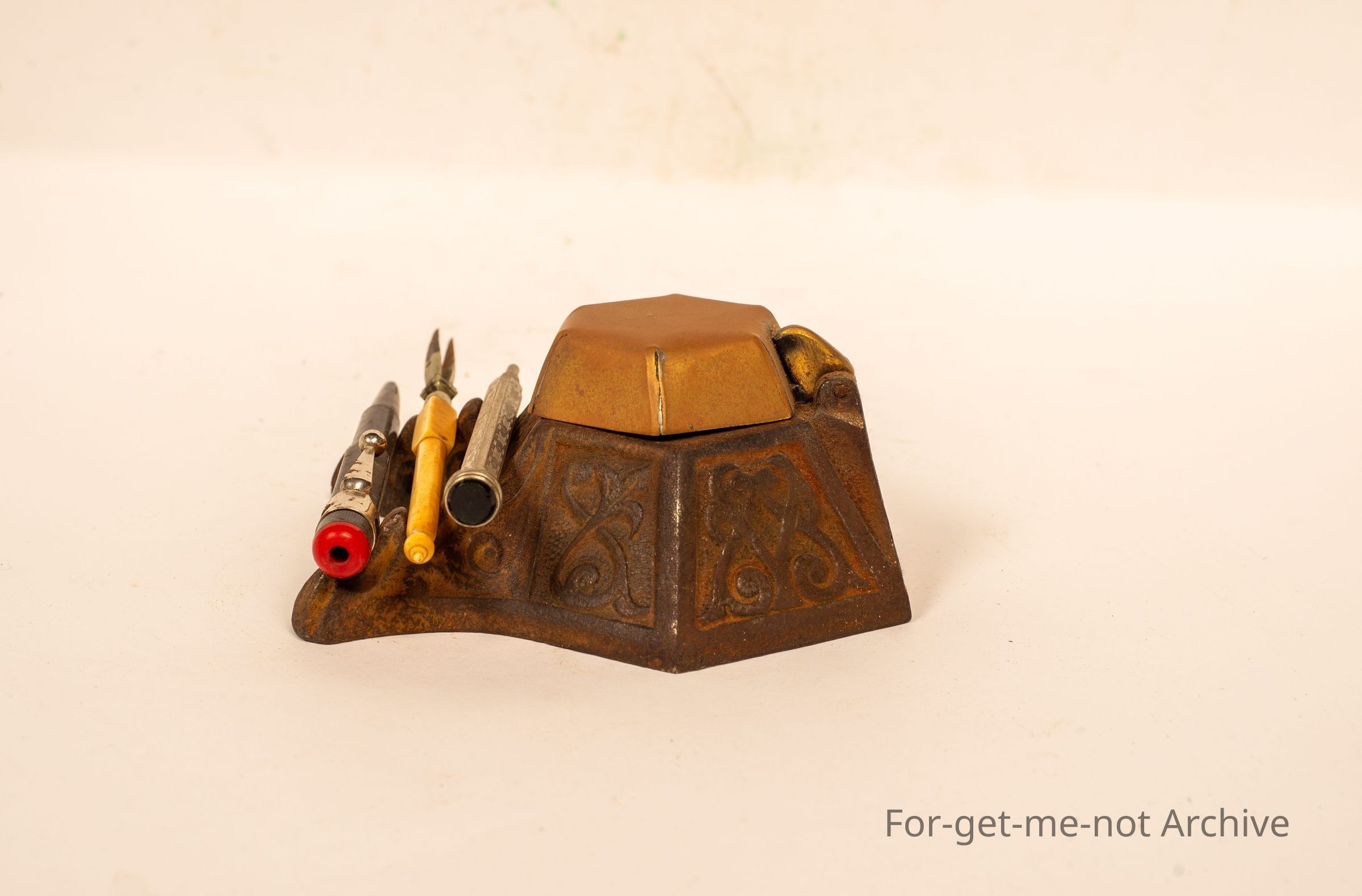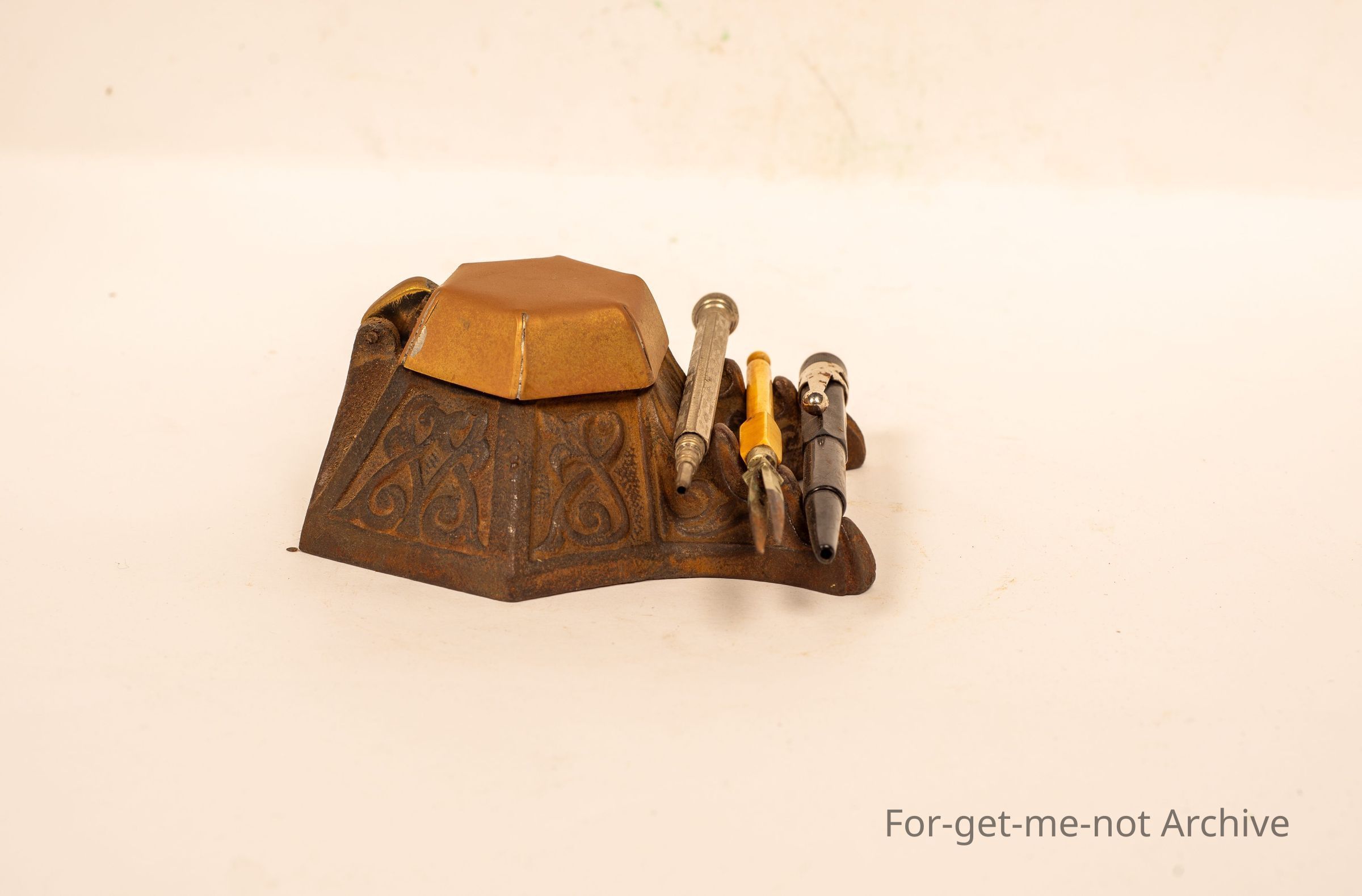 A cast iron ink stand with a potholder and 3 pen rests, with 3 different pens attached.