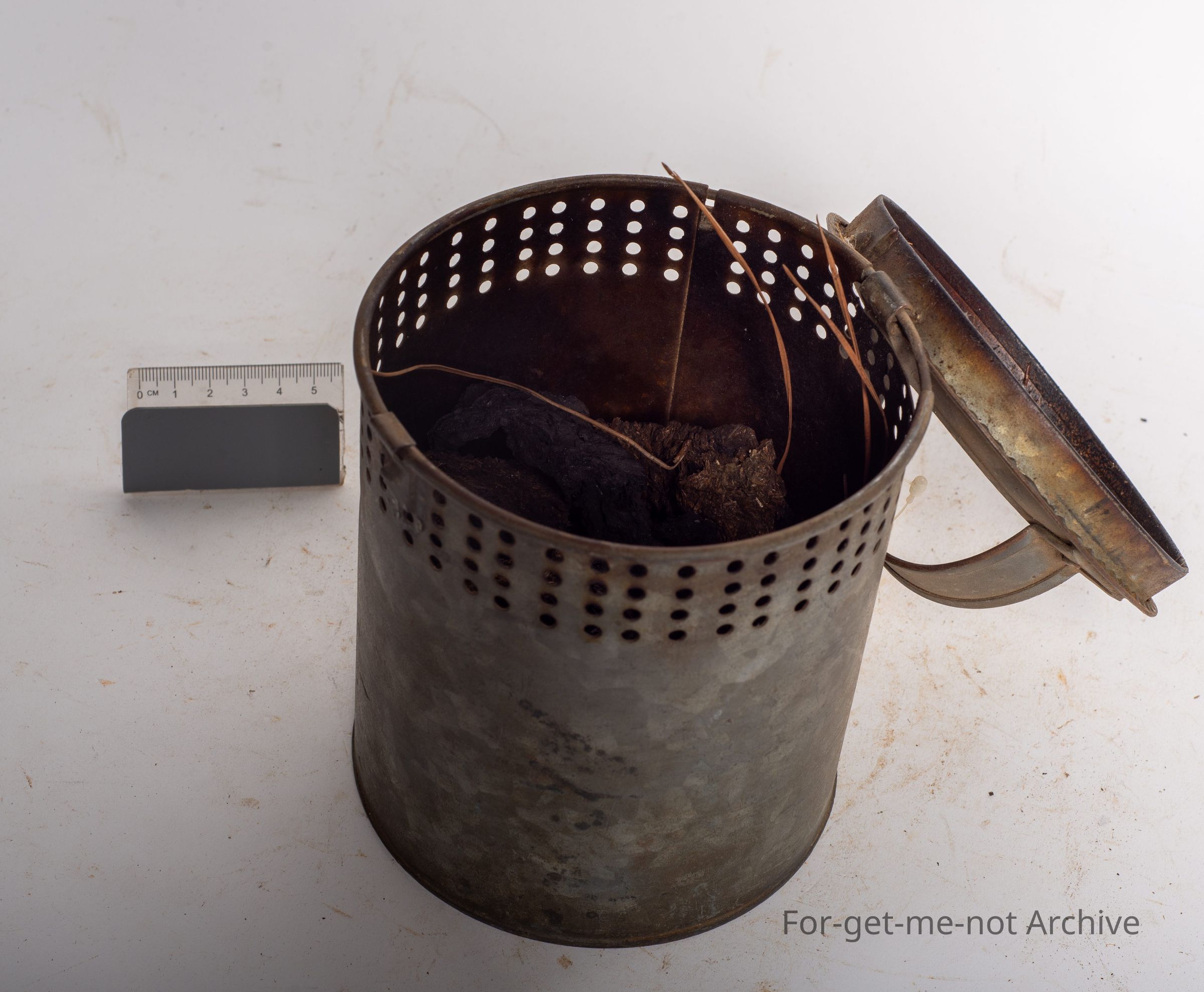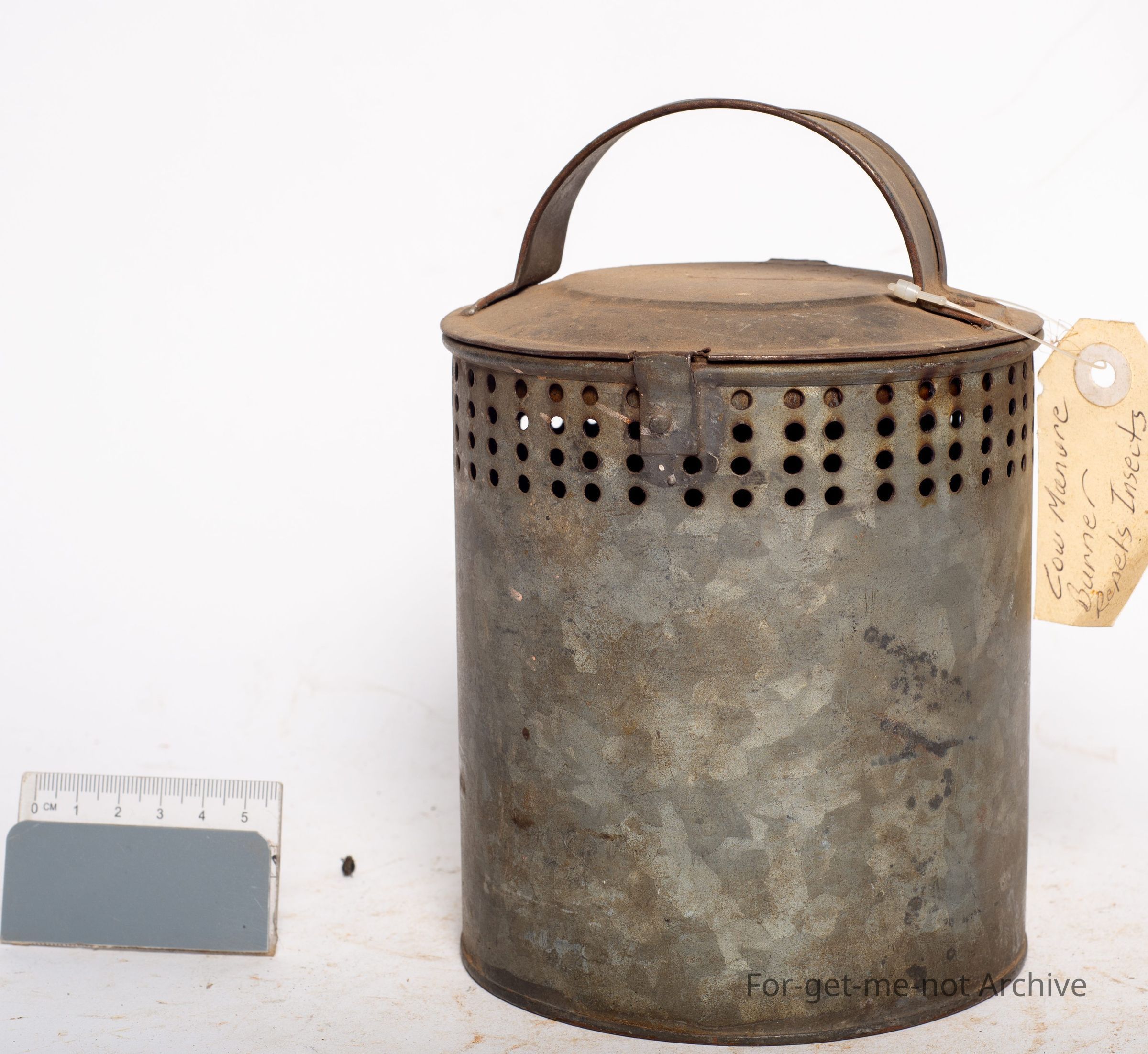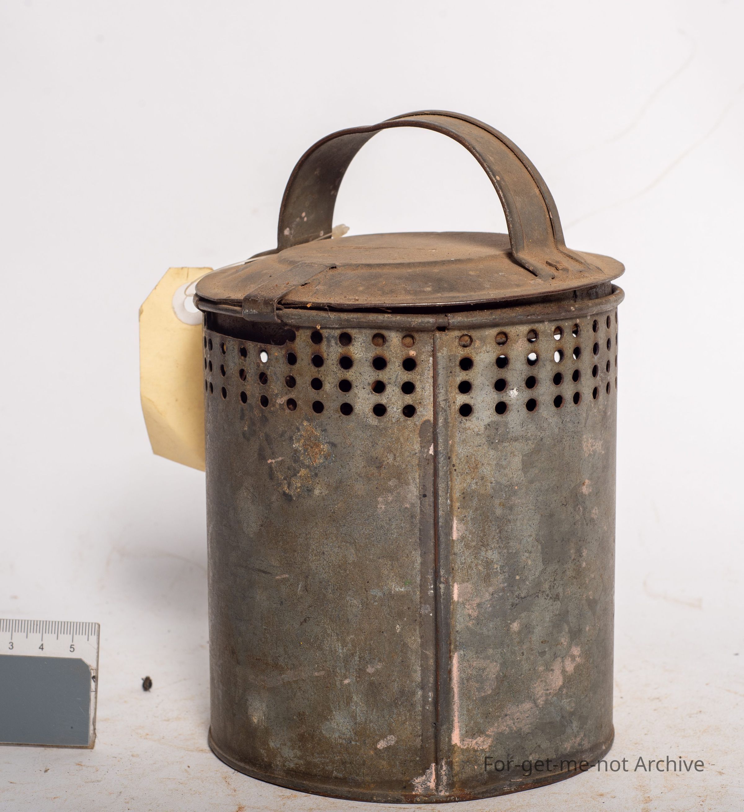 This is a canister with a hinged lid. This was used as an insect repellent tin which burnt pine needles, brass, and usually dried cow dung. They were placed so that they smouldered with the smoke coming out the perforated ring around the top. They work very efficiently. This one is in lovely condition. They're rarely found.Collection