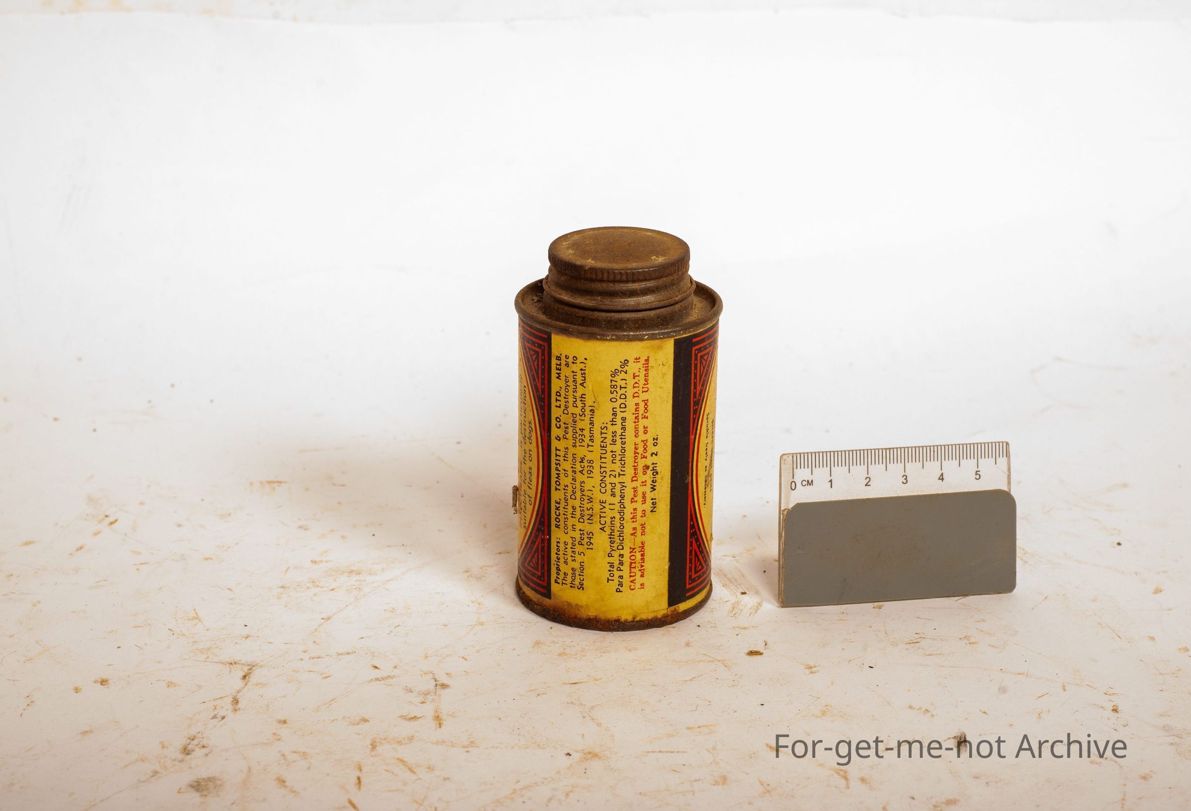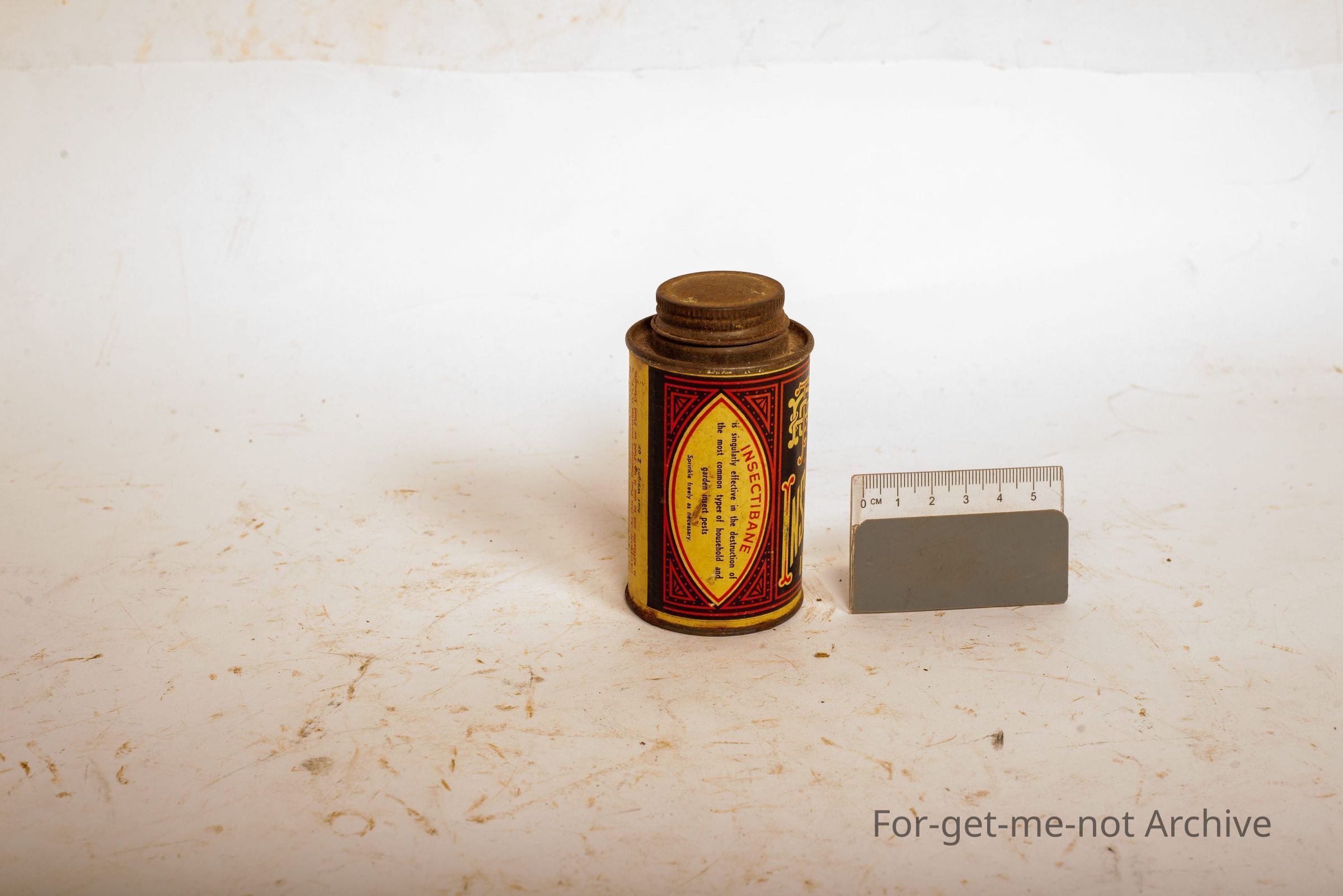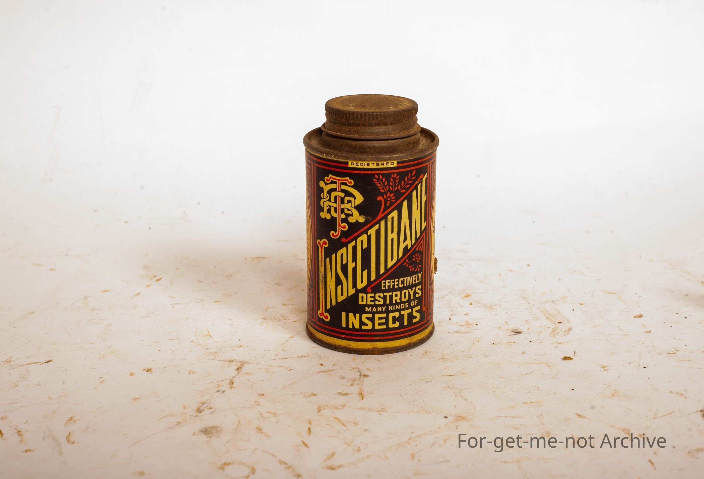 This is a can of Insectobain. The fit efficiently destroys insects, in lovely condition. Paper label, perfect. An interesting tin.