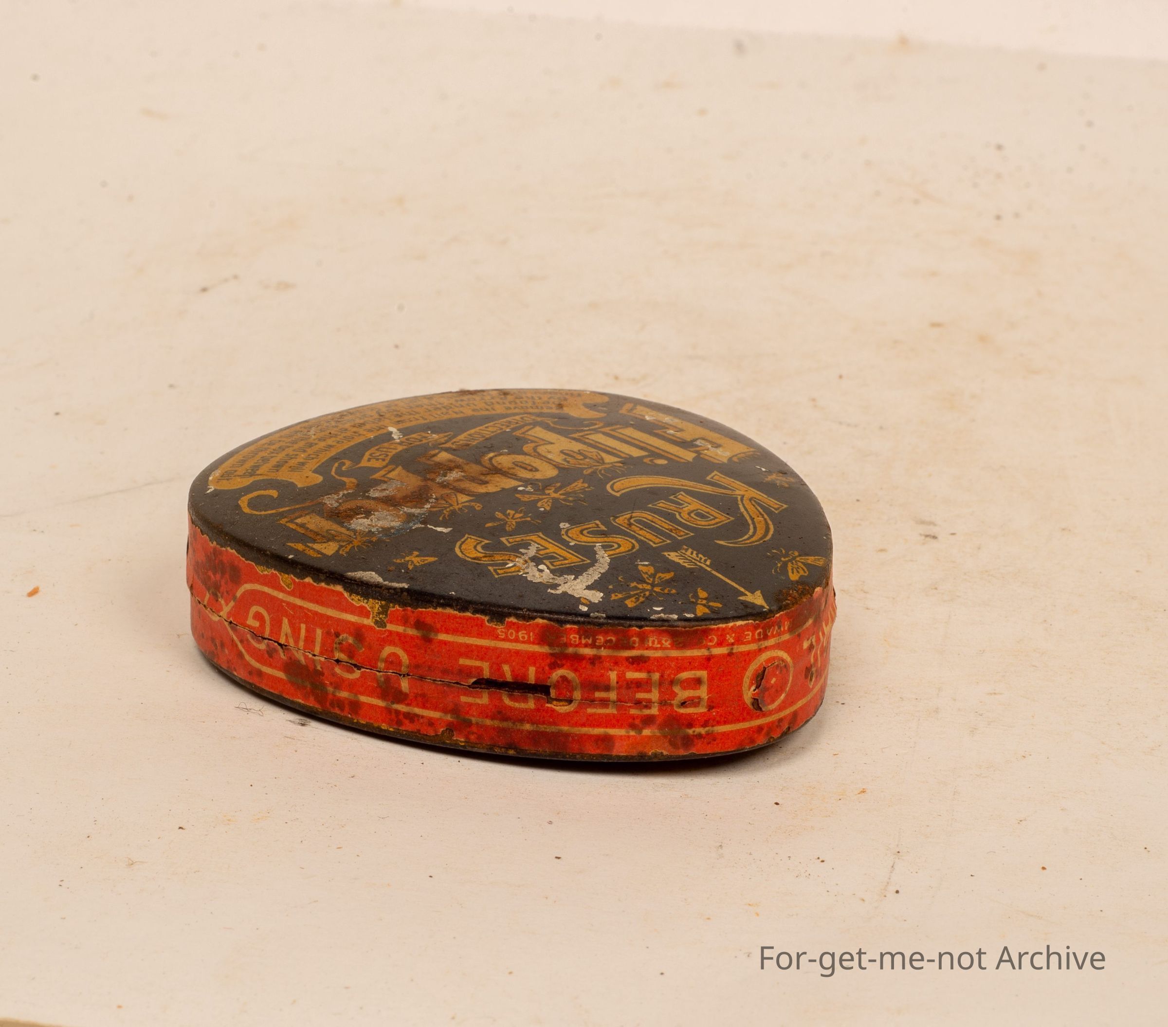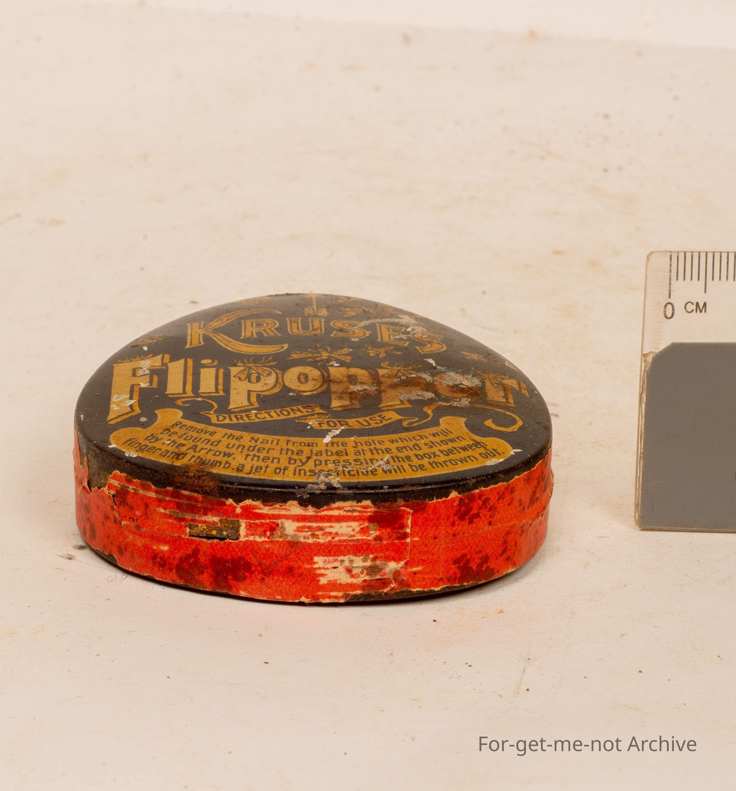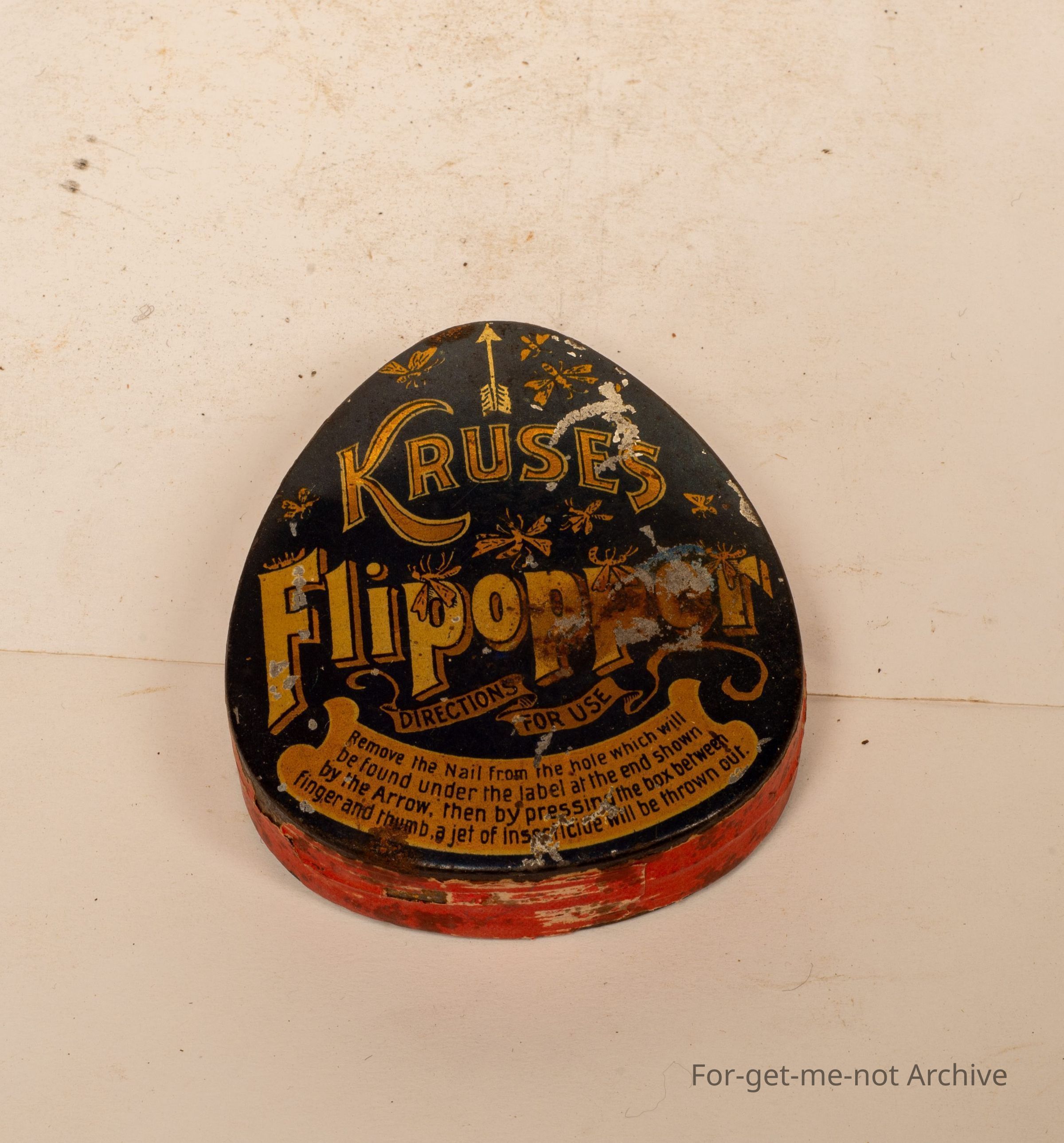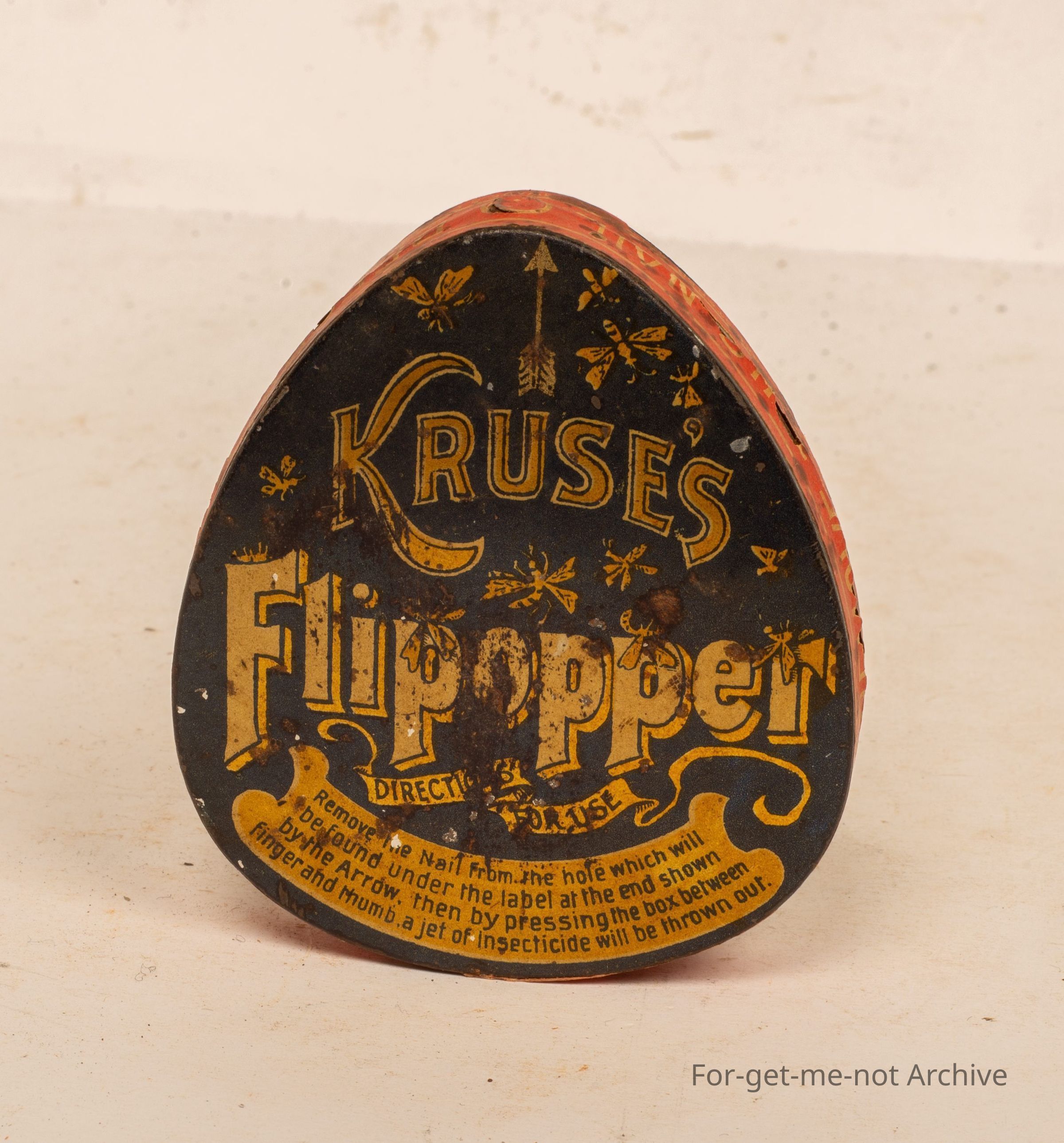 Is a tin of Krusess Flipopper. By pressing the base of the tin, a jet of insecticide is squirted out from the tin . Quite possibly quite a rare tin. Not in bad condition,