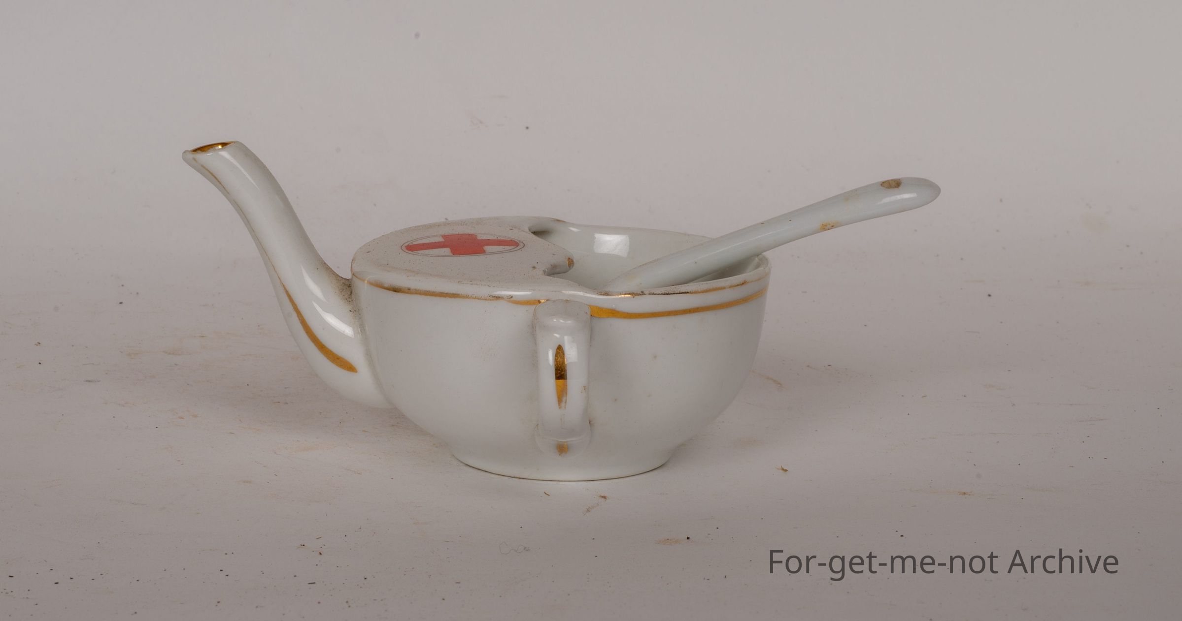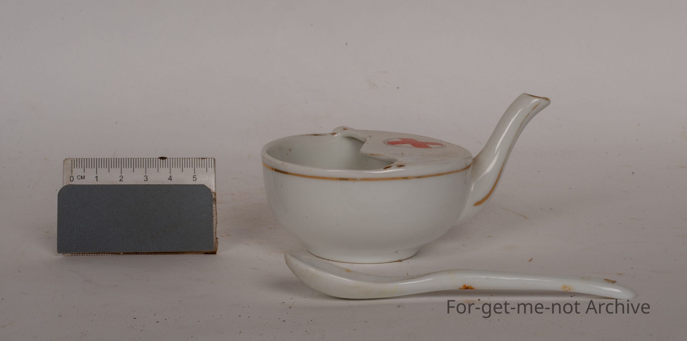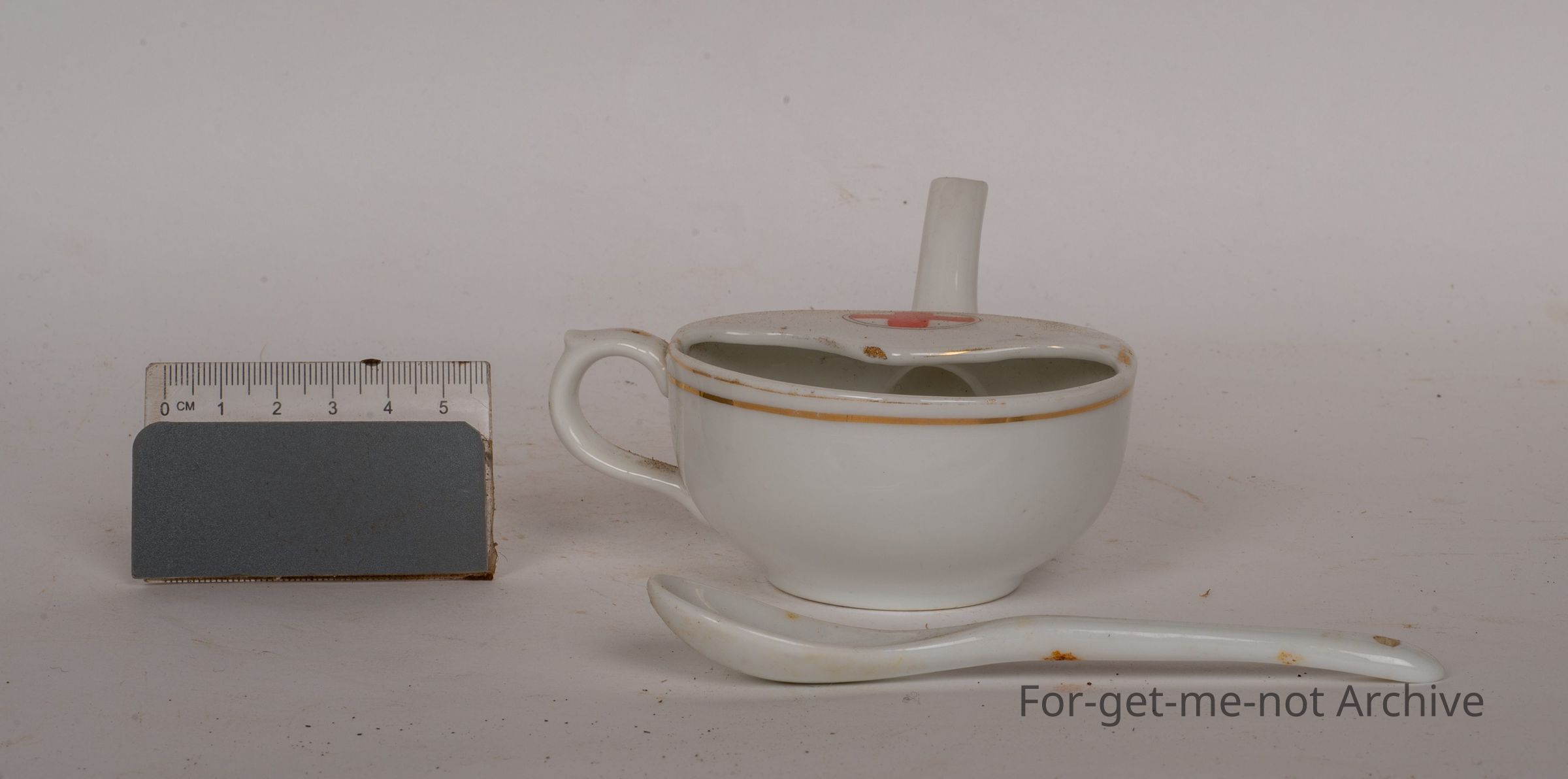 Little white ceramic spoon. Has a spout, one handle and the red cross symbol on the top of it.