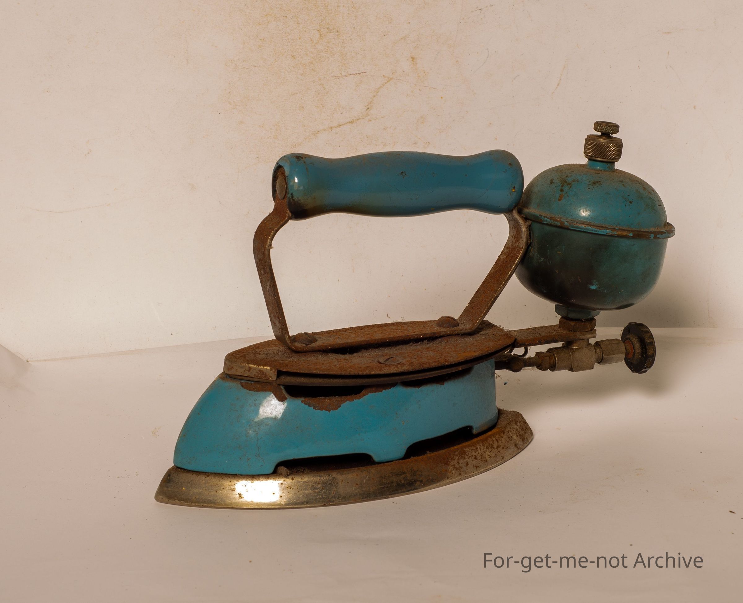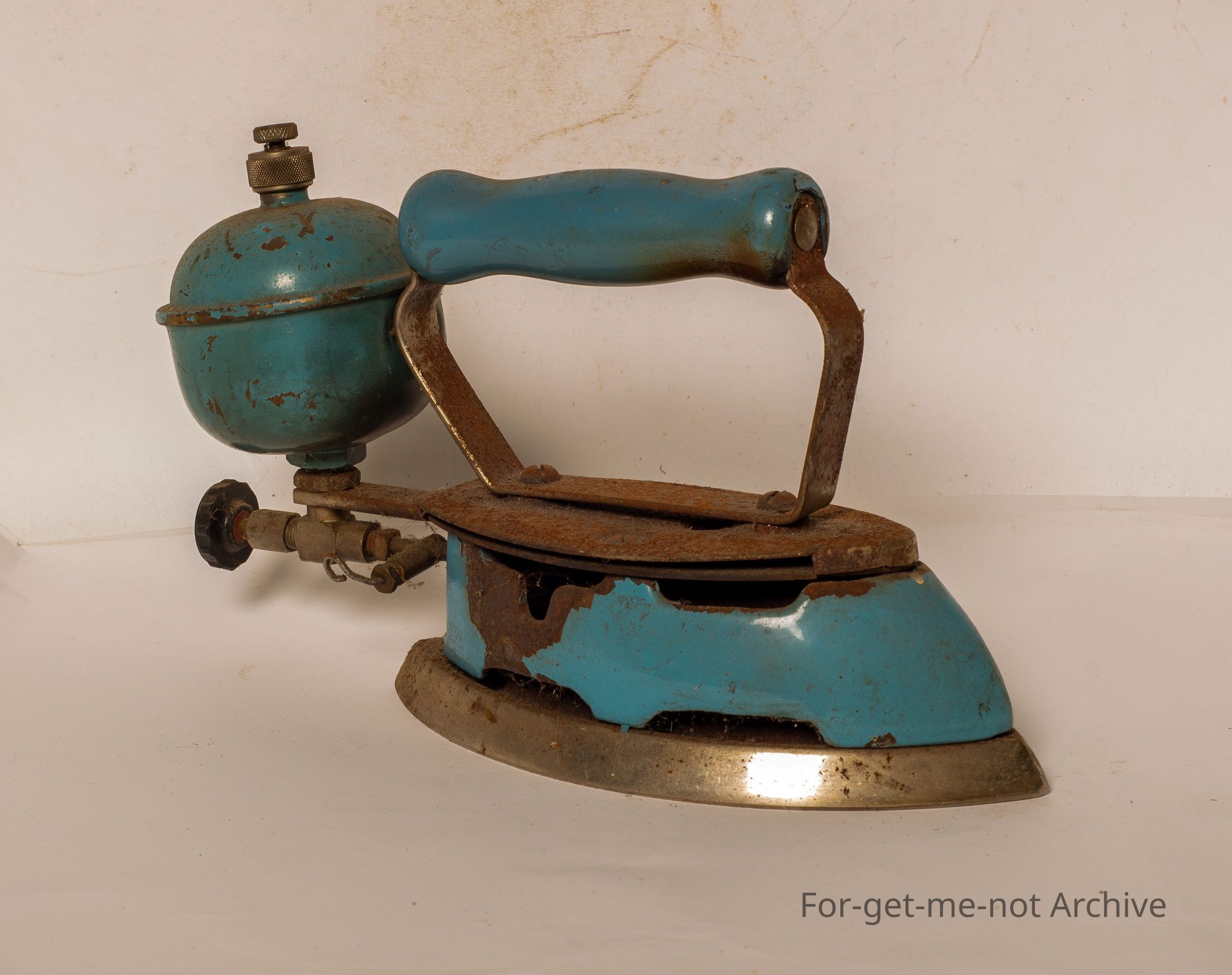 Petrol, iron blue enamel surrounds, a metal petrol tank on the back, for fuel, quite common pre electric, case.