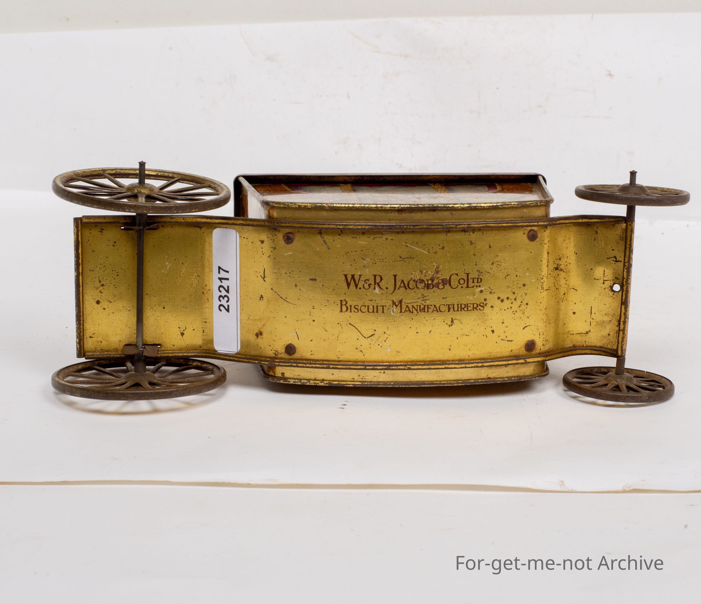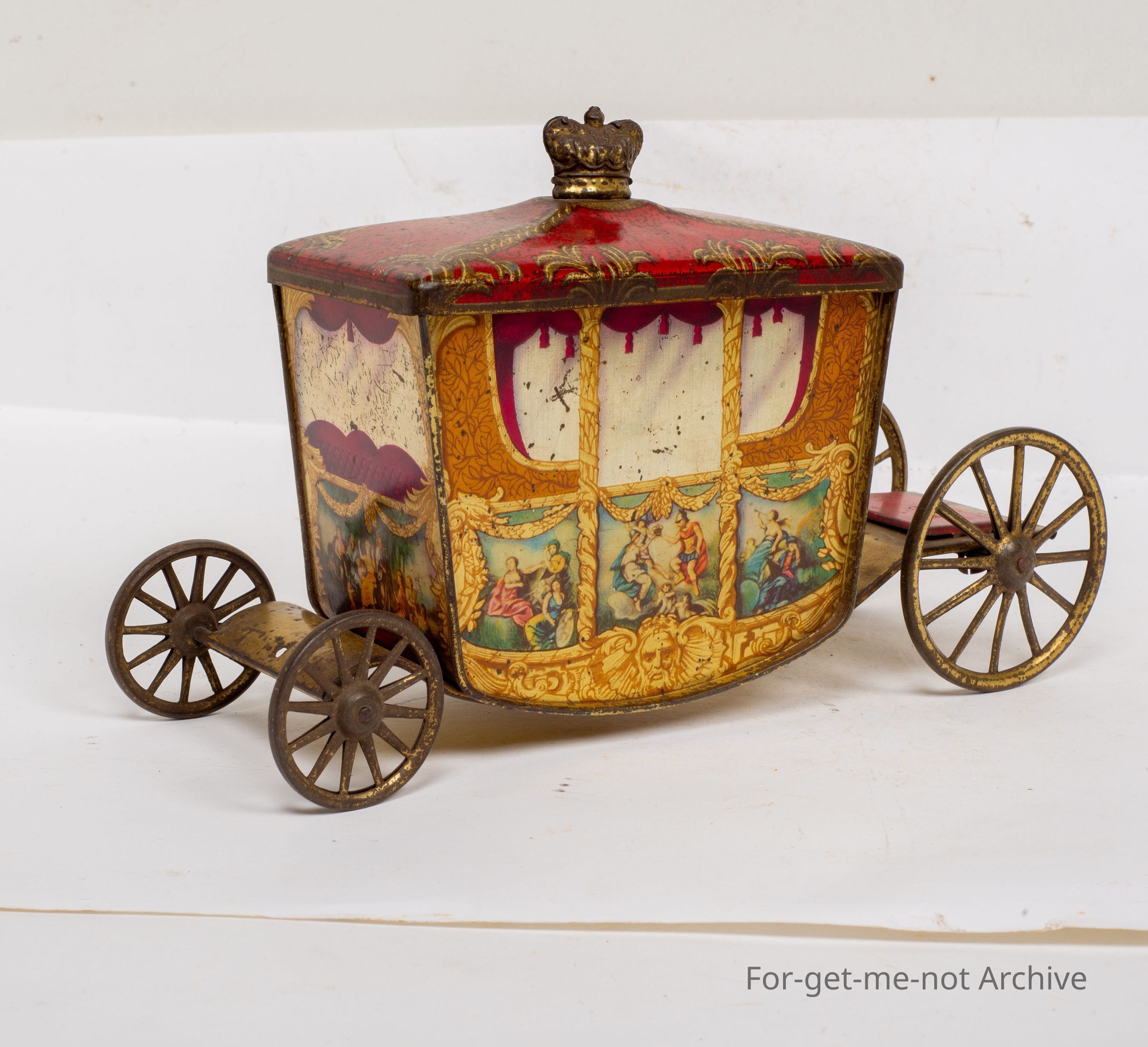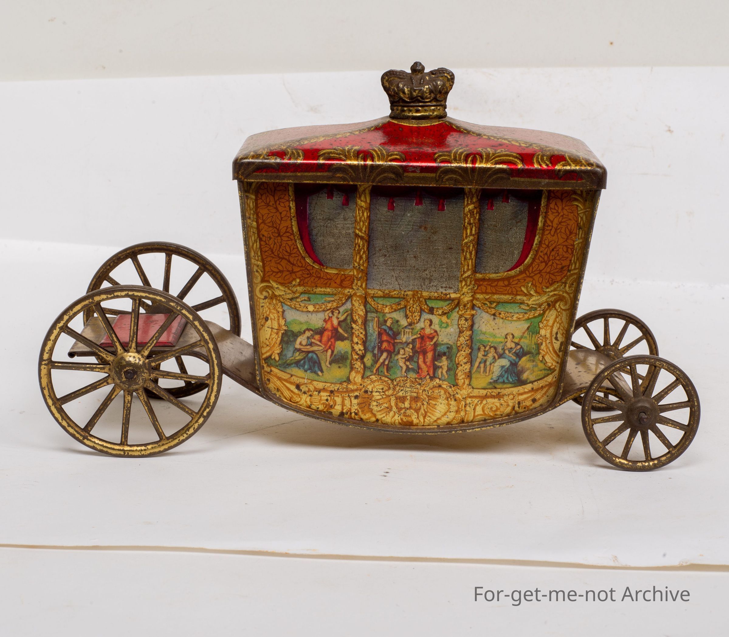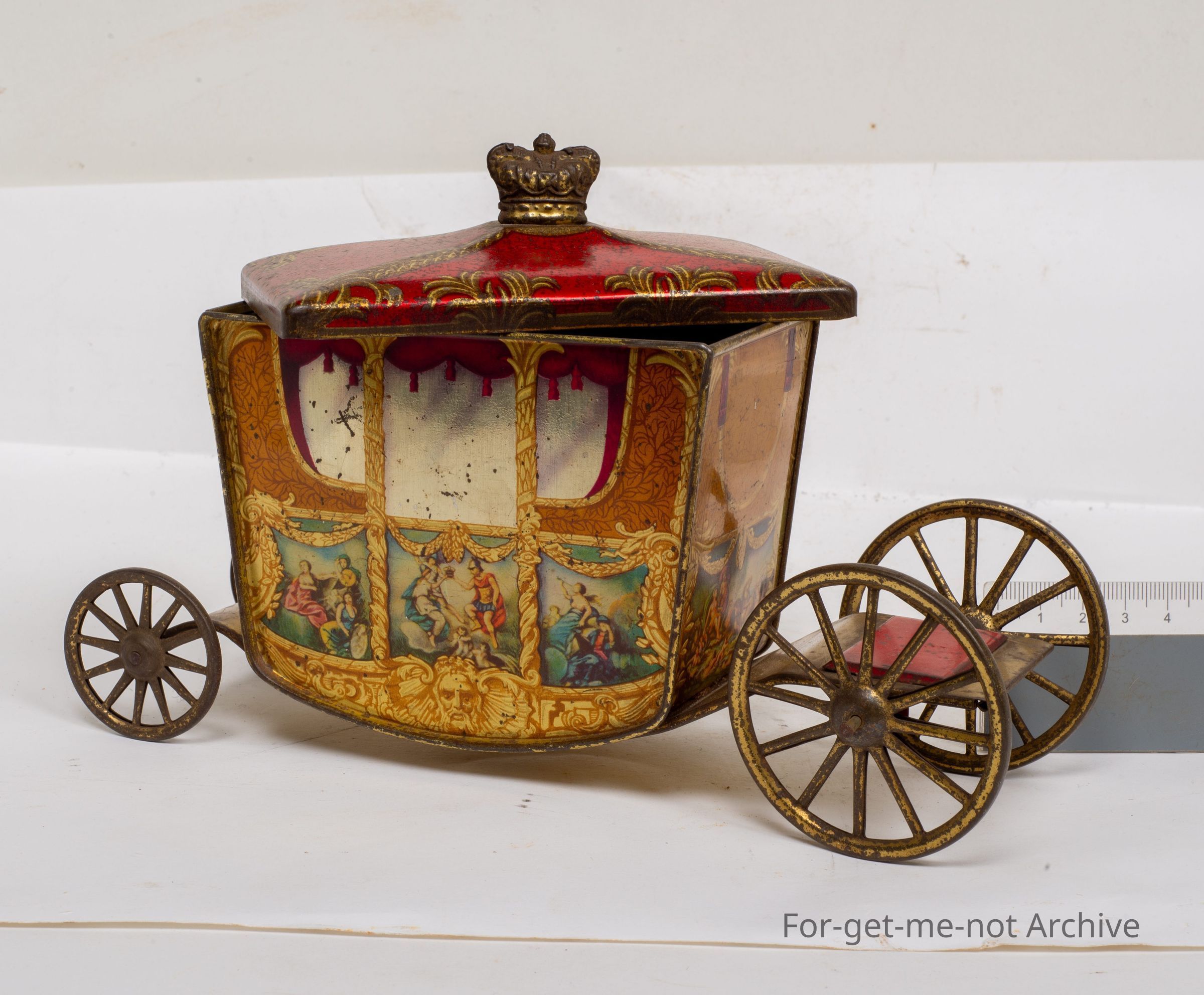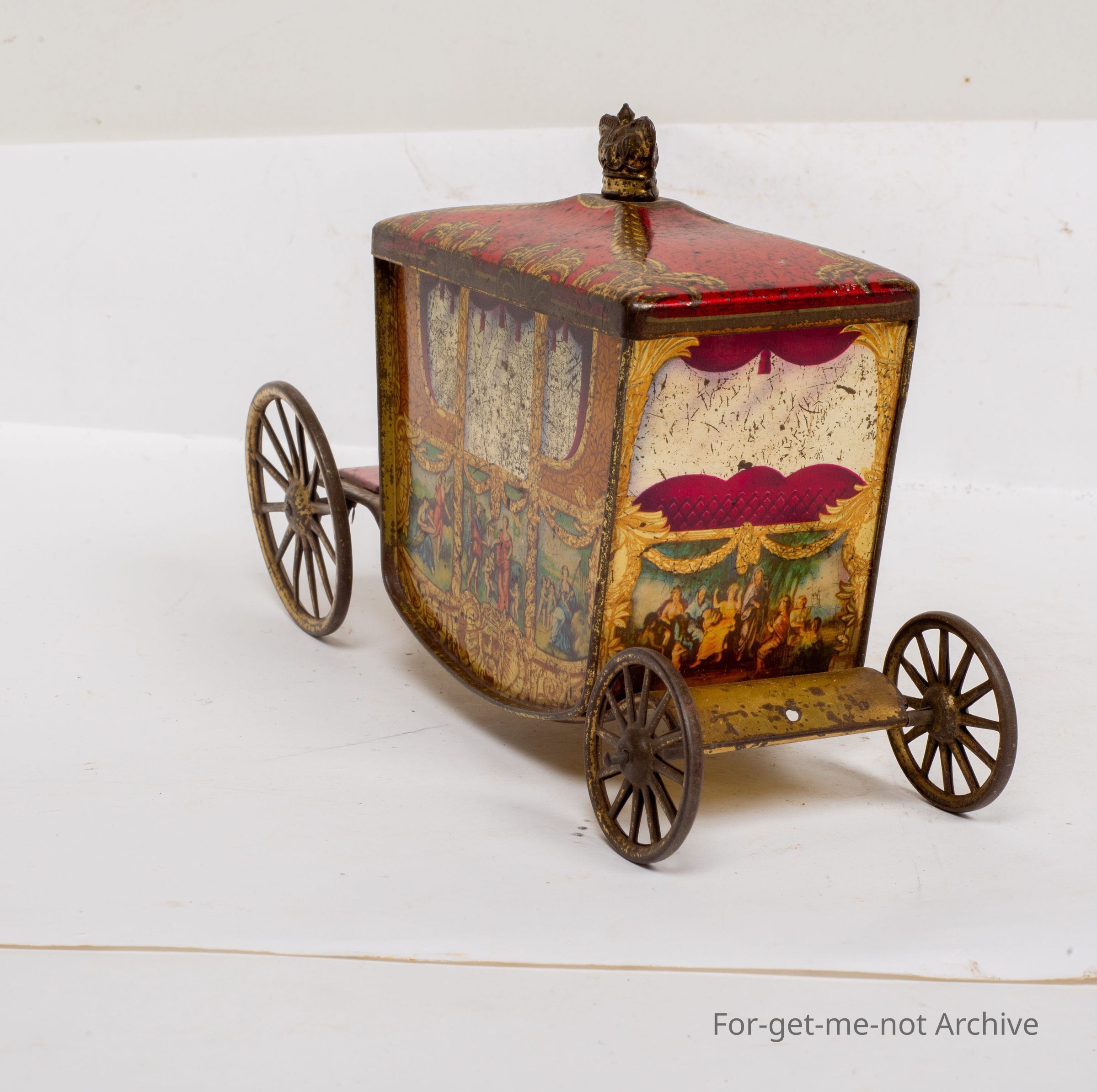This is a wonderful example of a Jacob Biscuit, tin in the form of the coronation carriage complete with 4 wheels, the lid lifts off with a crown on top of it with graphics of earlier times all the way around.Collection