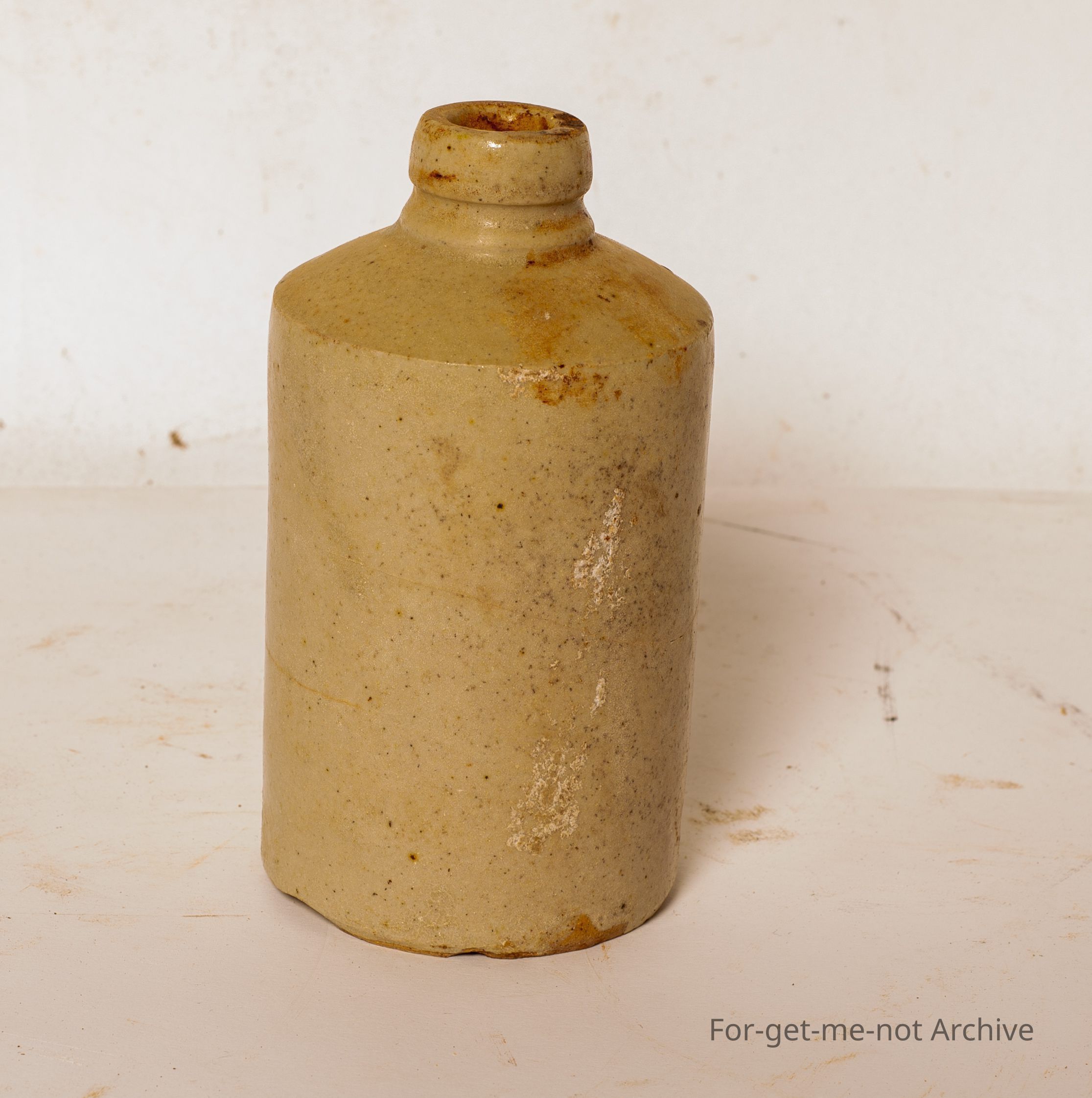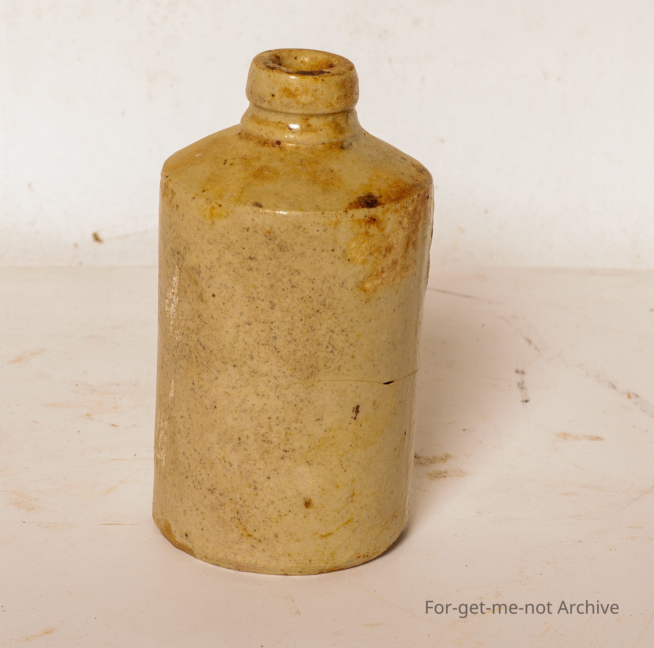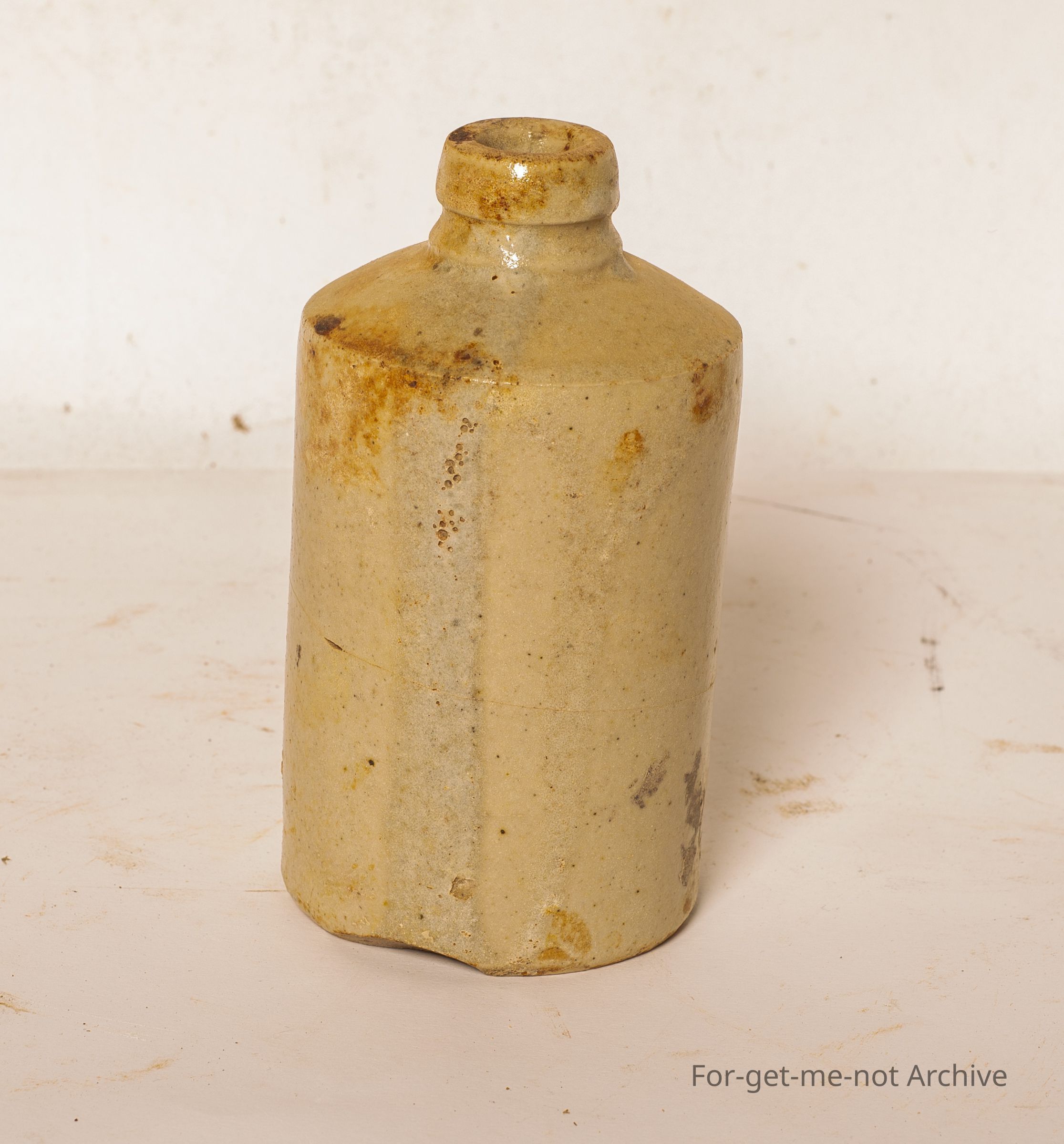 A small stoneware jar, would have had a cork top stop. very squat little, heavily glazed bottle of unknown use.