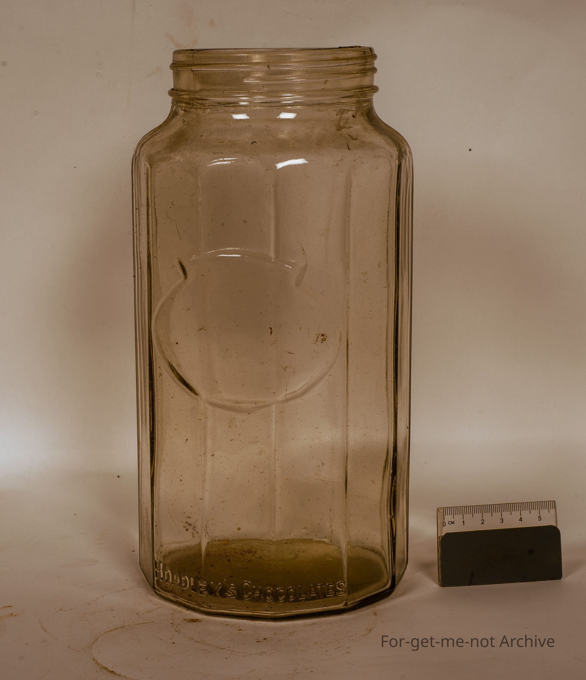 large glass jar. This is a lovely Hoadley's chocolate jar, no lid. Numerous flat surfaces around the perimeter of the jar. No label, but in very good condition.