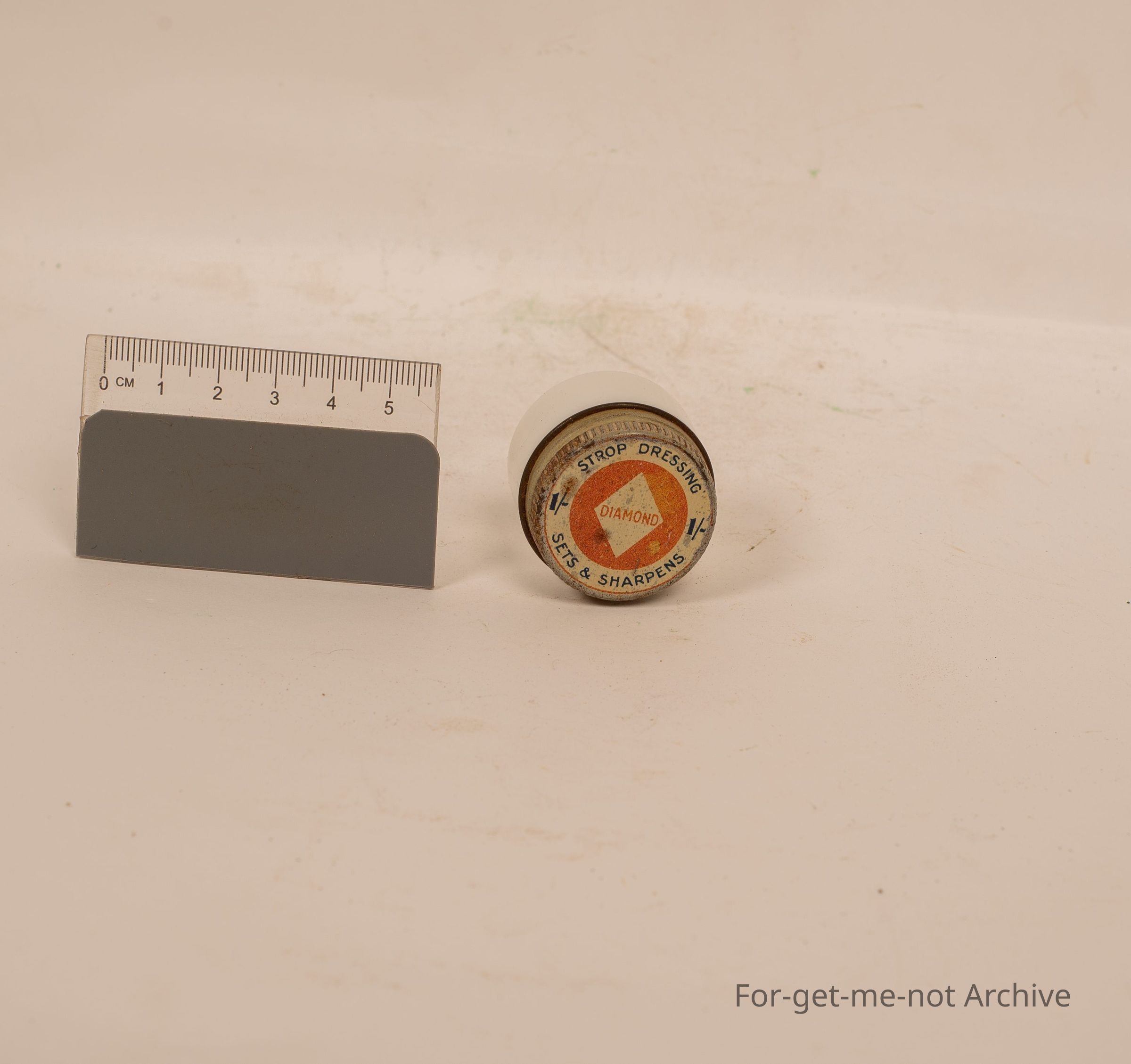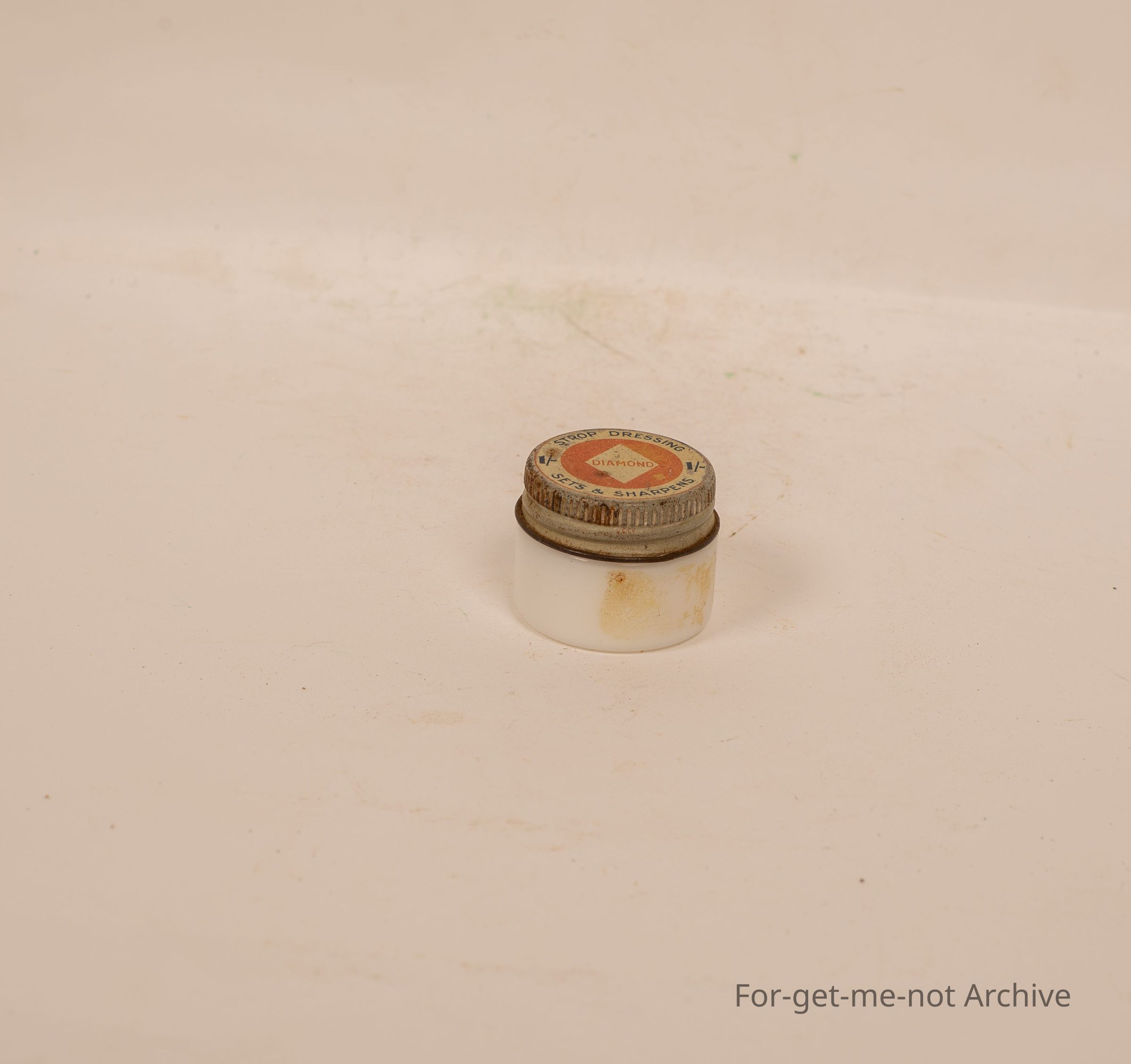 Milk glass, small jar called Diamond Strop Dressing, Sets and sharpens. 1 shilling.
