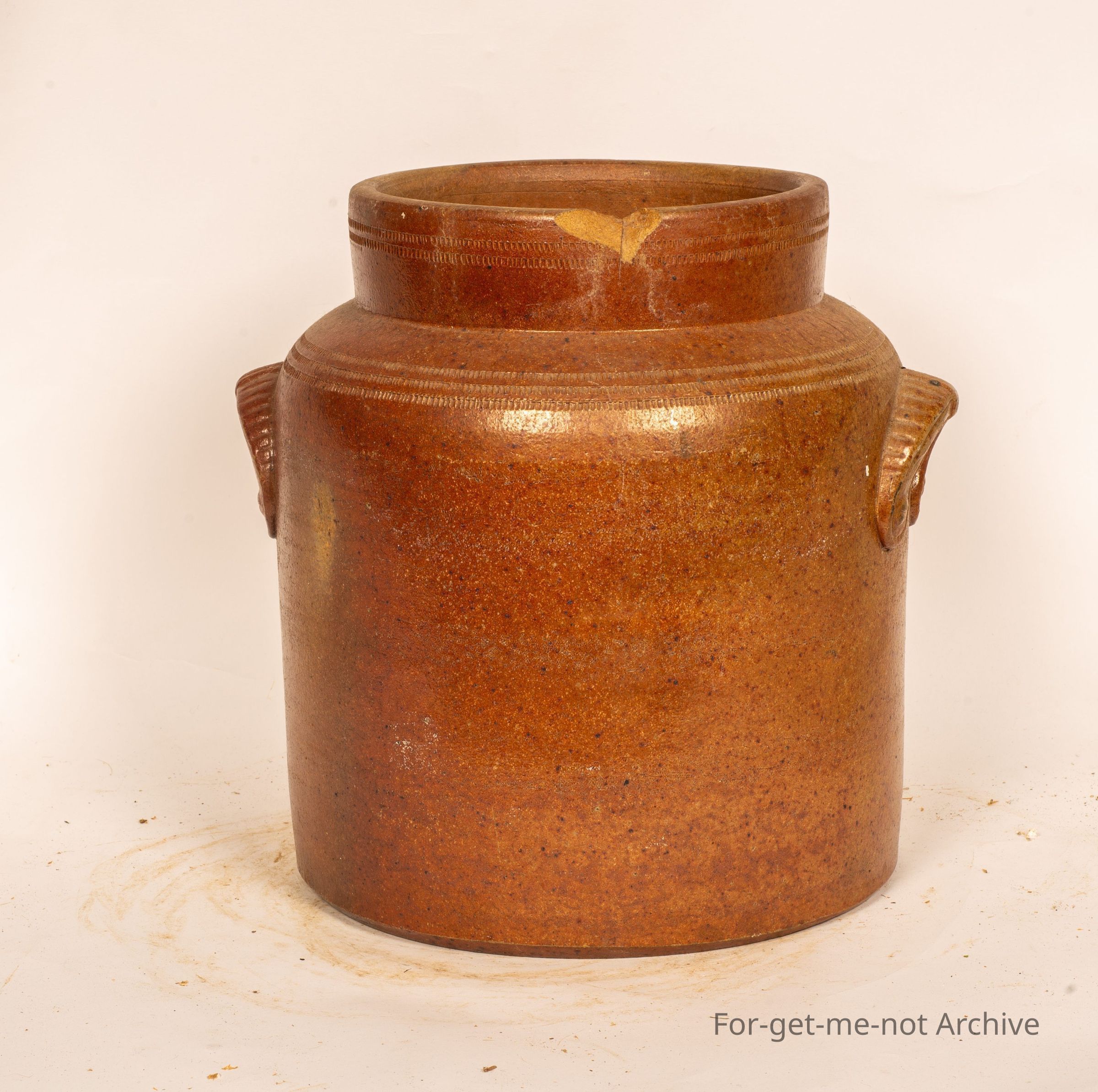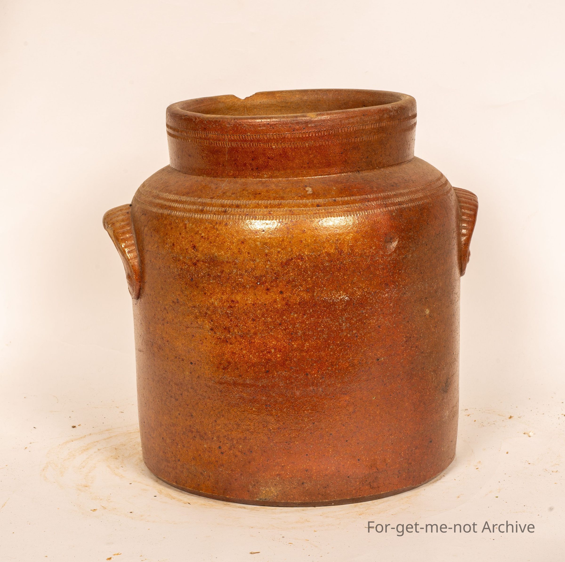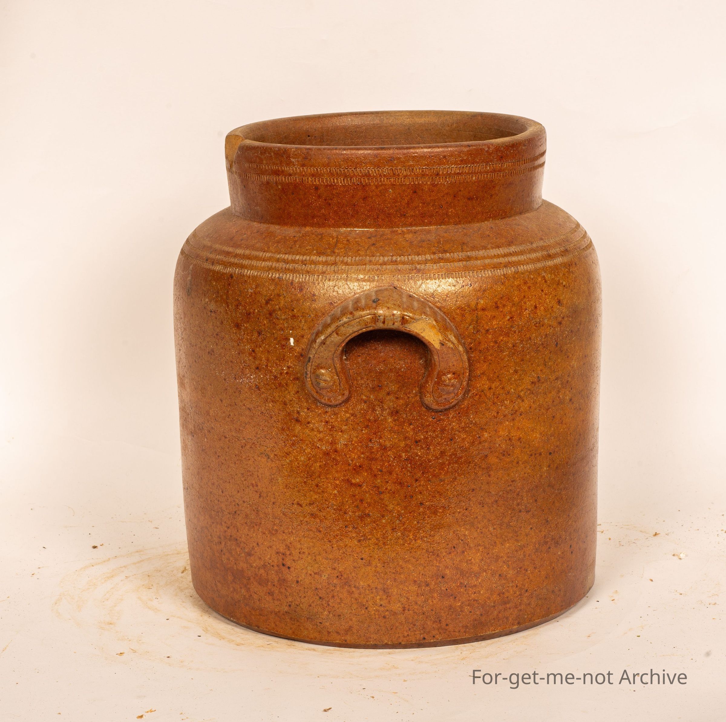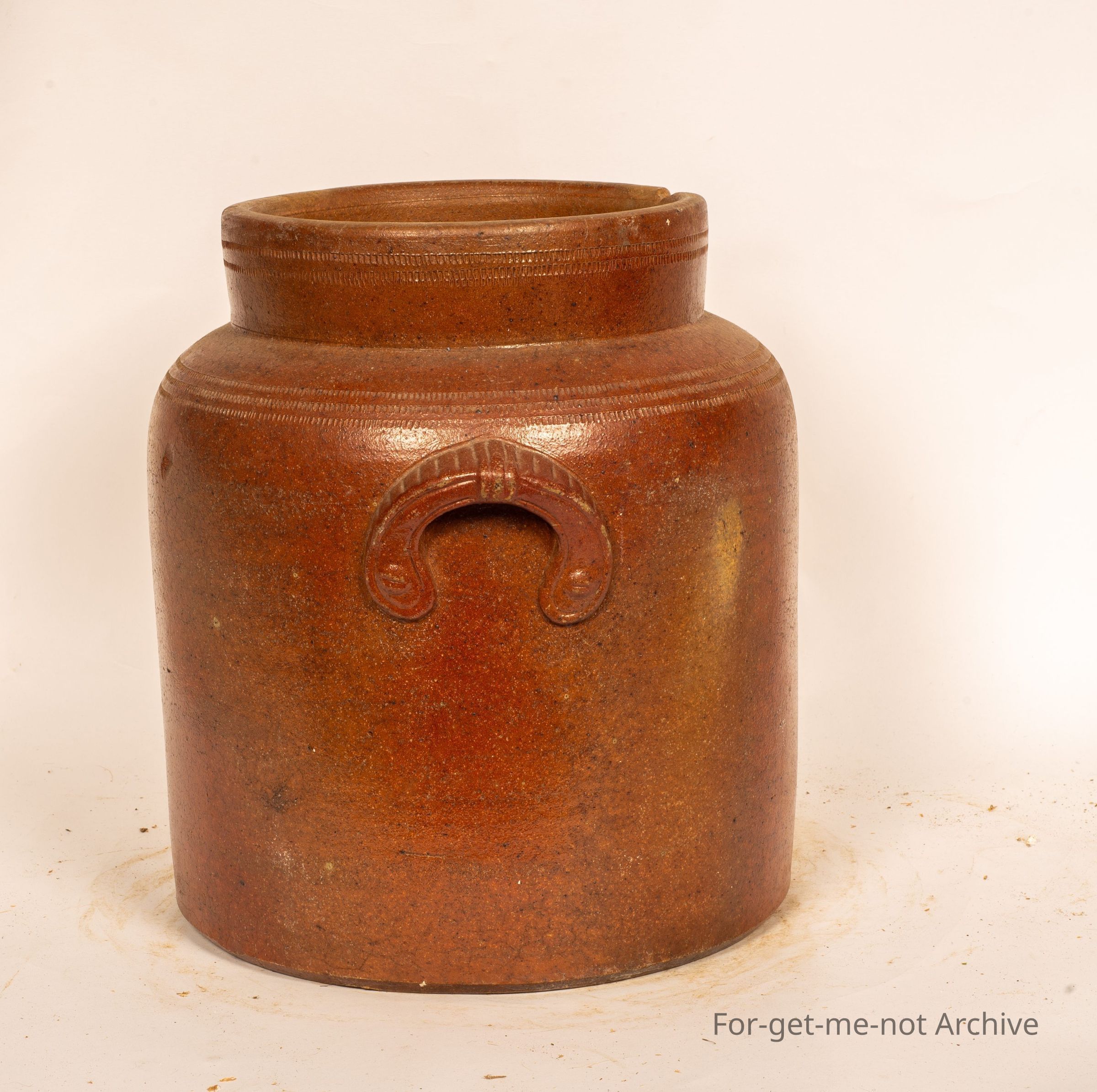 Another Stoneware Pottery jar. This is quite an attractive one. An unusual straight collar on the neck. So it has been lidded. One big chip out of the collar, collar work to the shoulder, and, quite decorated, ear wings on the side. This is definitely a salt waste piece, but, possibly once again from a South Australian pottery.Collection