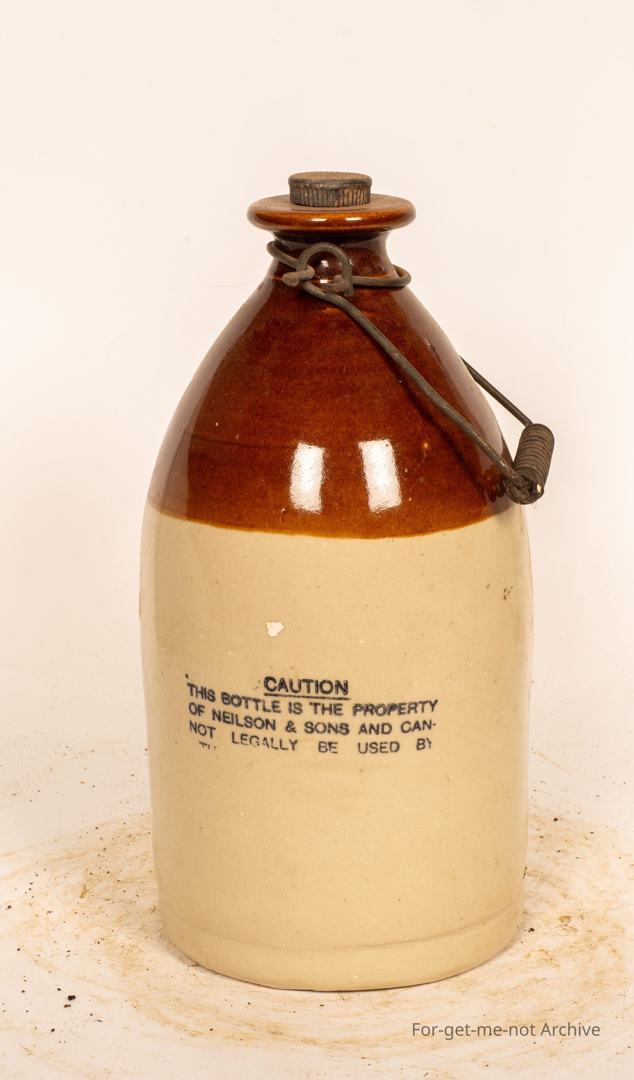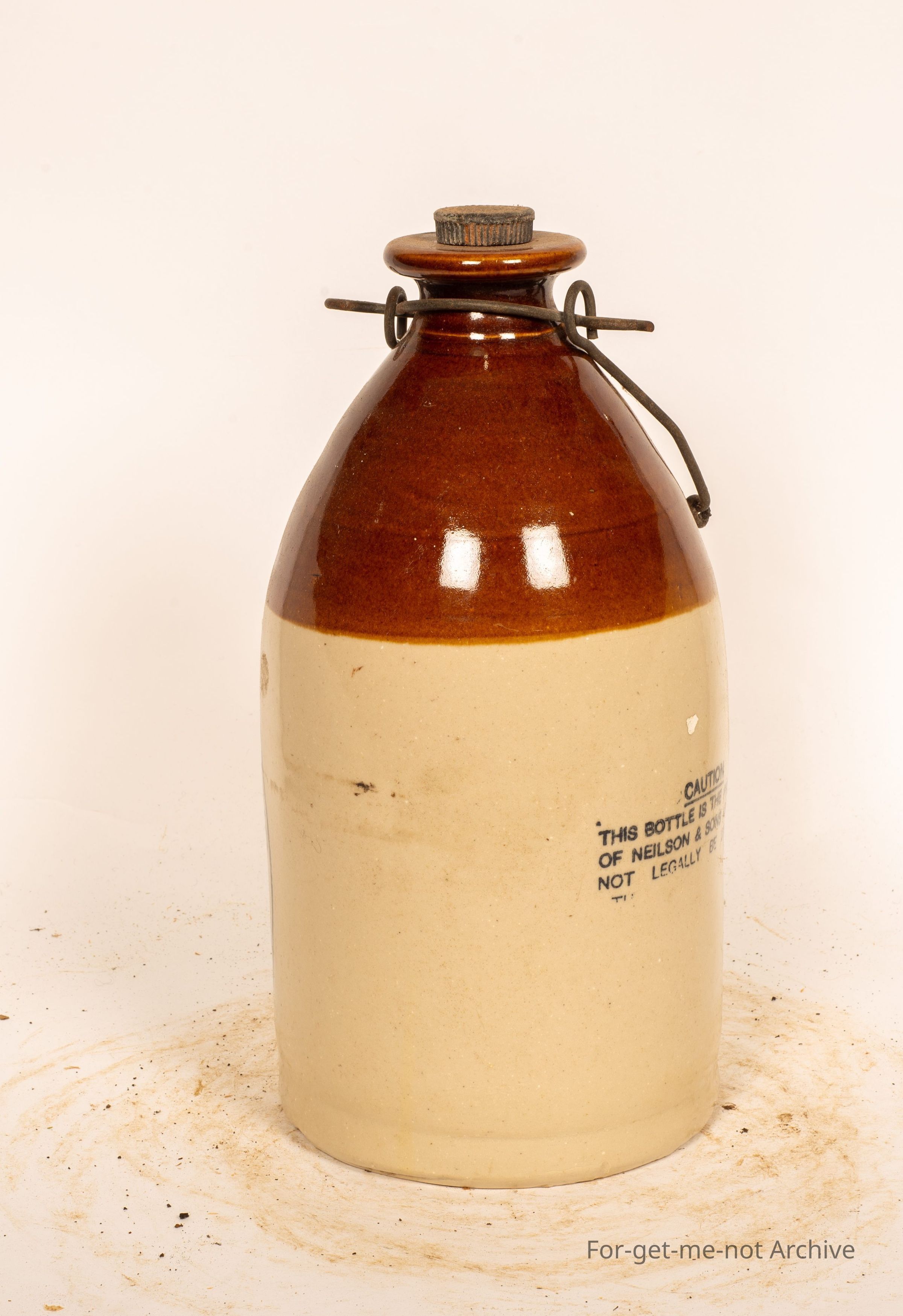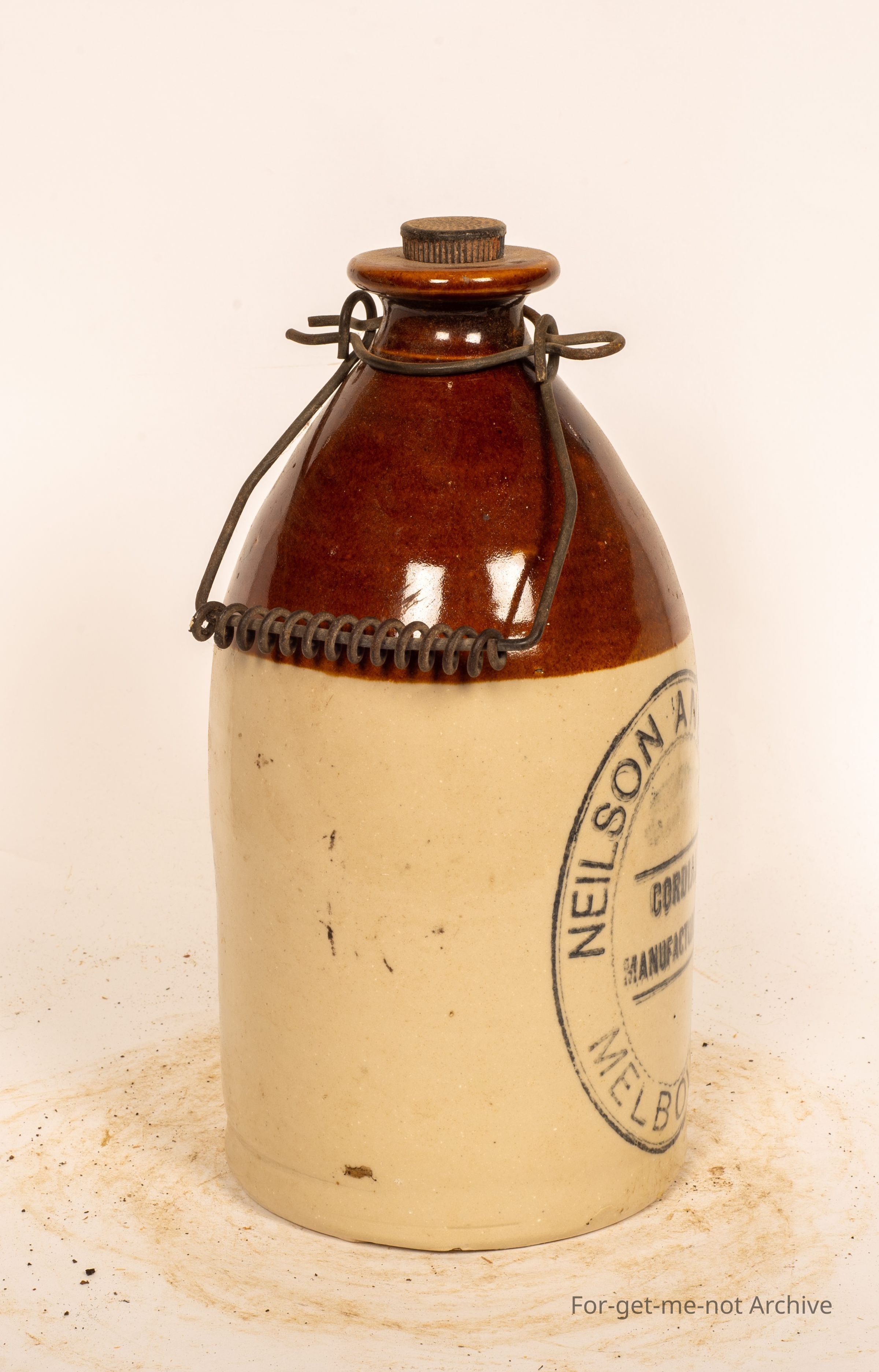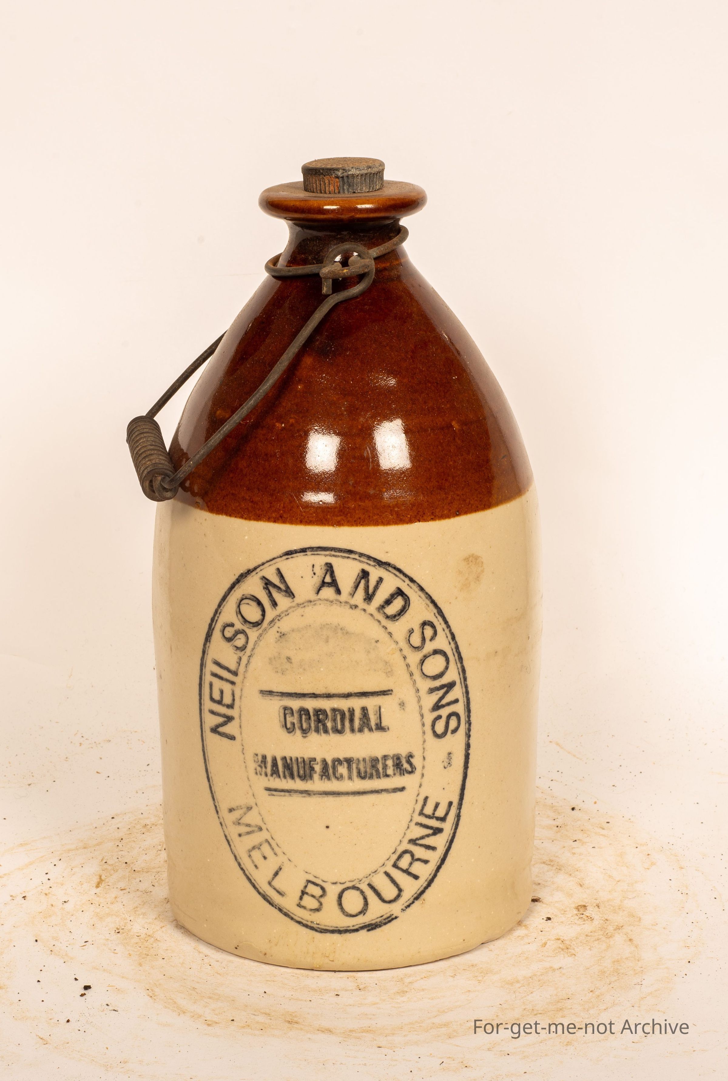 Another stoneware pottery piece. This time, a, a cordial jar of stoneware with the wire, I think they call it, I forget the name of it. Has a lid, this one has a brown glazed neck. The rest of it is clear, stamped, ink stamp, Nielsen and Sons Cordial Manufacturers Melbourne in a in a beautiful oval shaped, stamp in perfect condition, this one.Collection