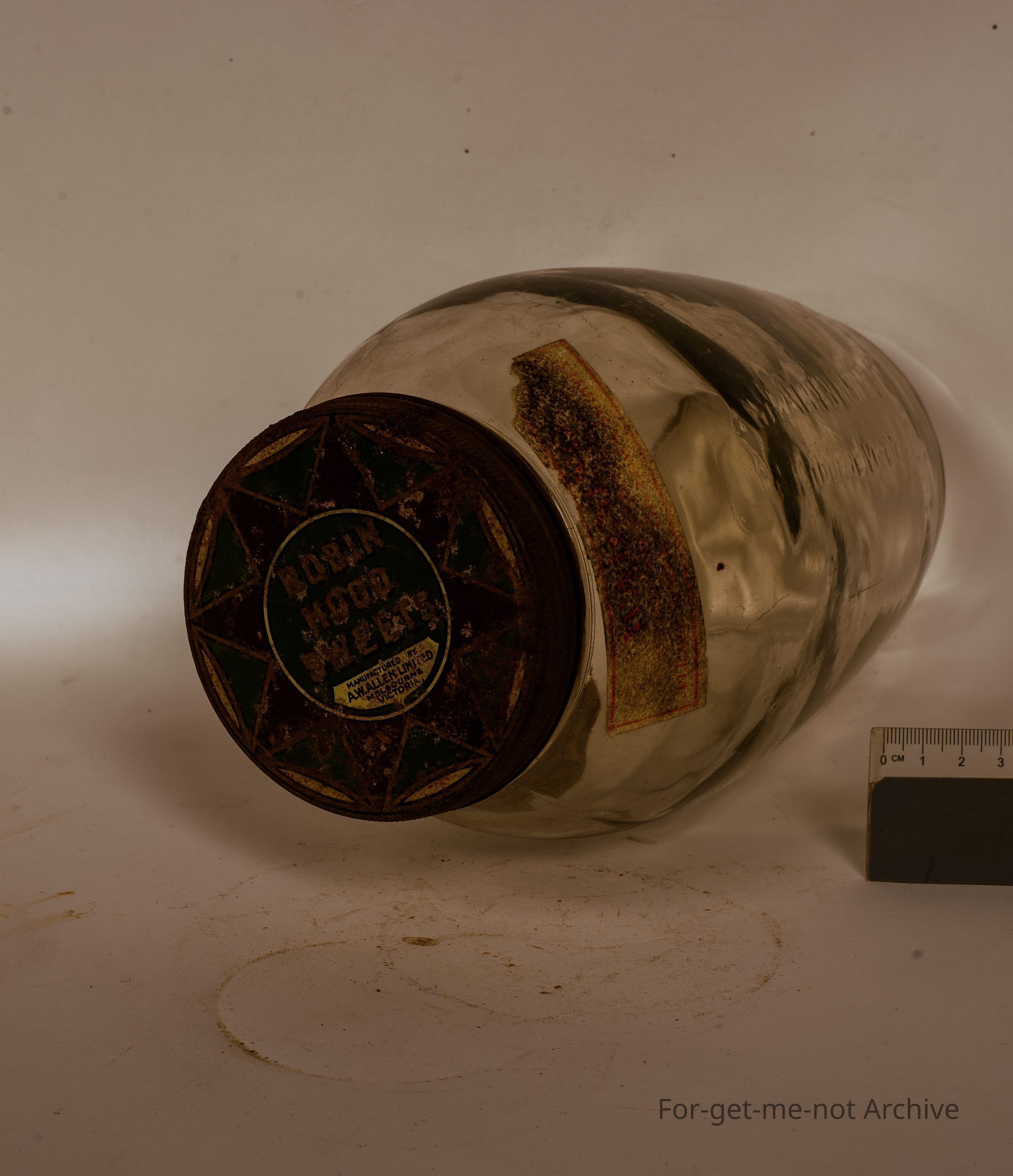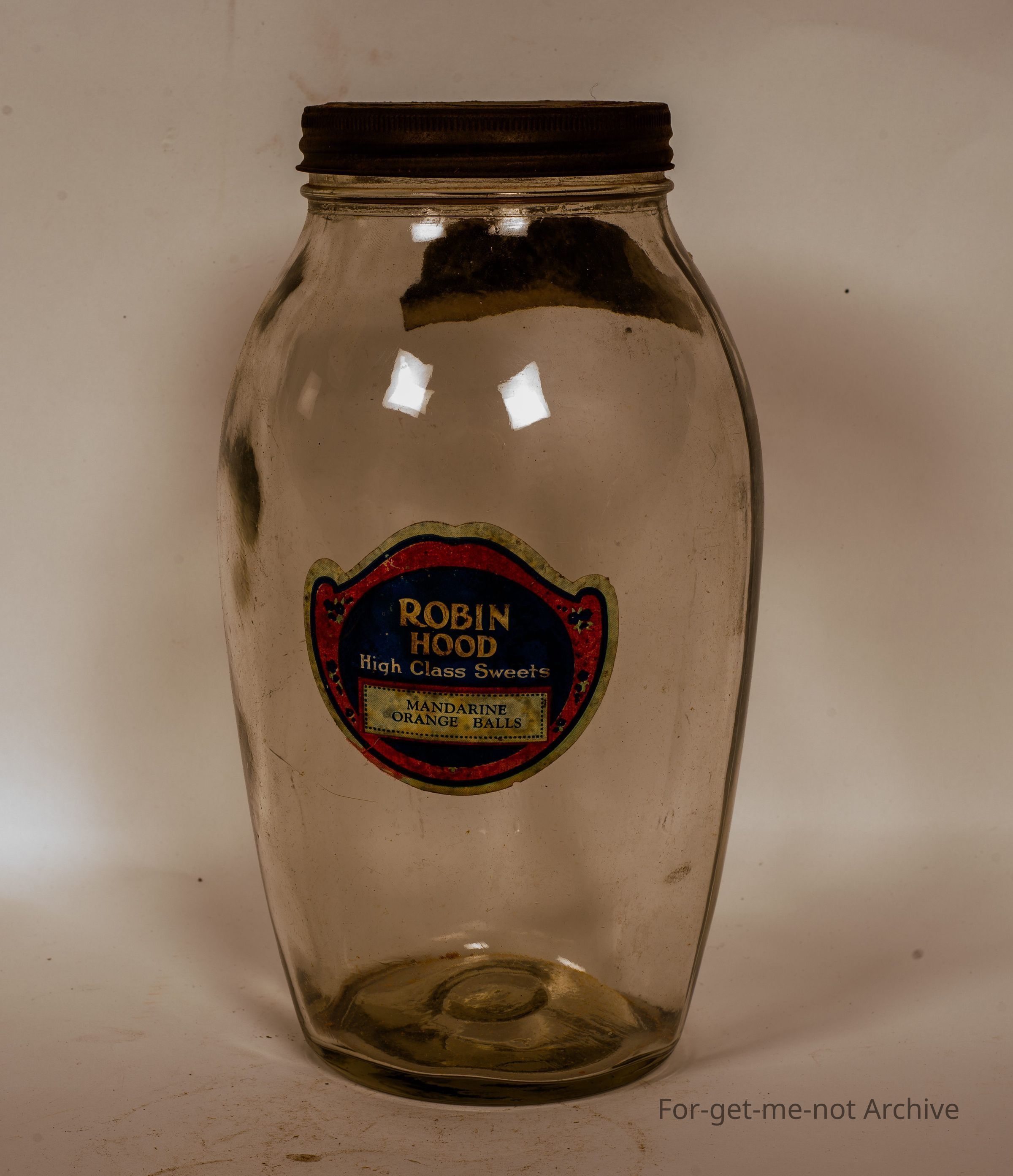 Large glass jar. this one has a lid. Robin Hood high class sweets, AW Allen Melbourne. Also has the Robin Hood label. High class sweets, mandarin, orange balls. Nice globular shape, with Allens Limited embossed into the glass.Collection