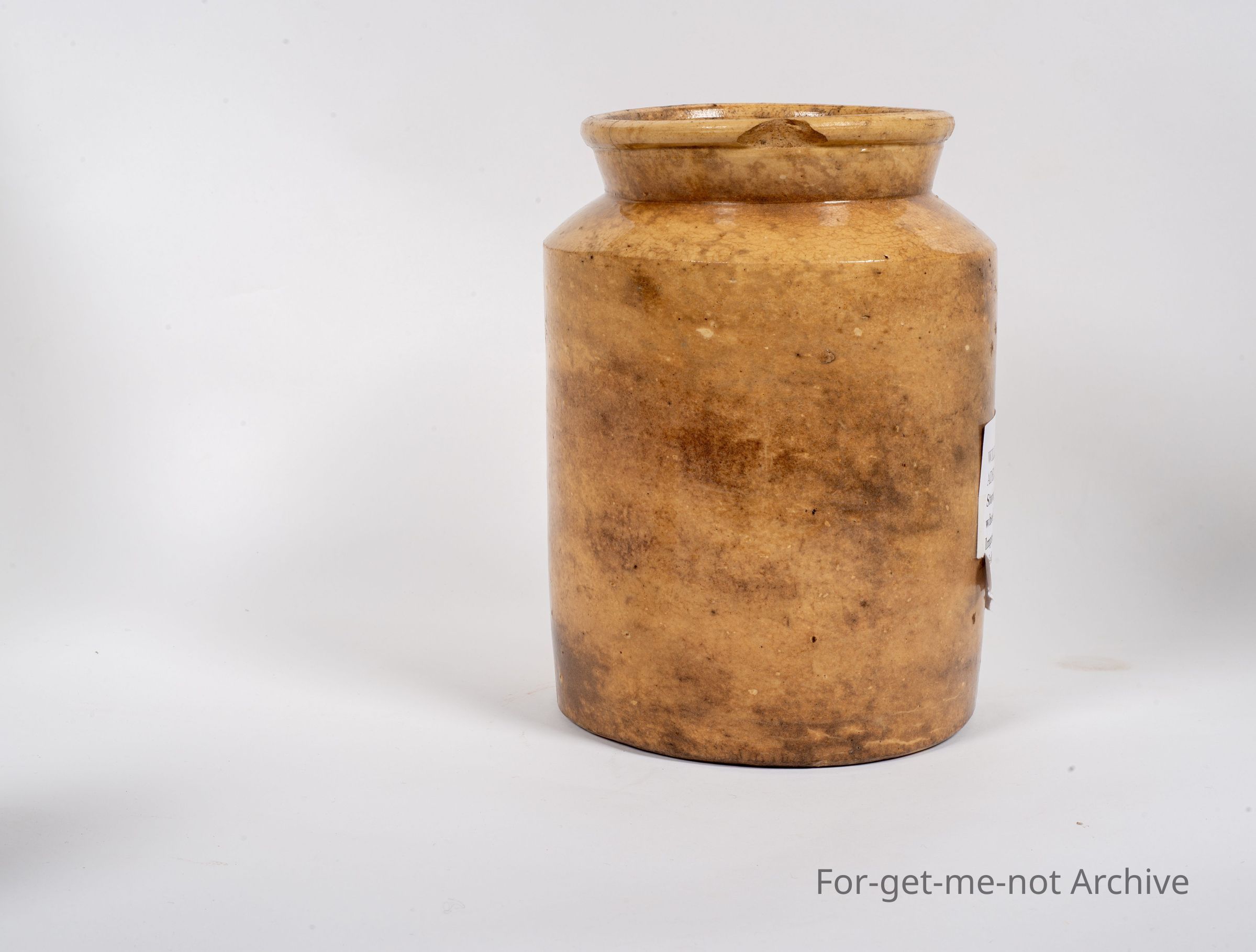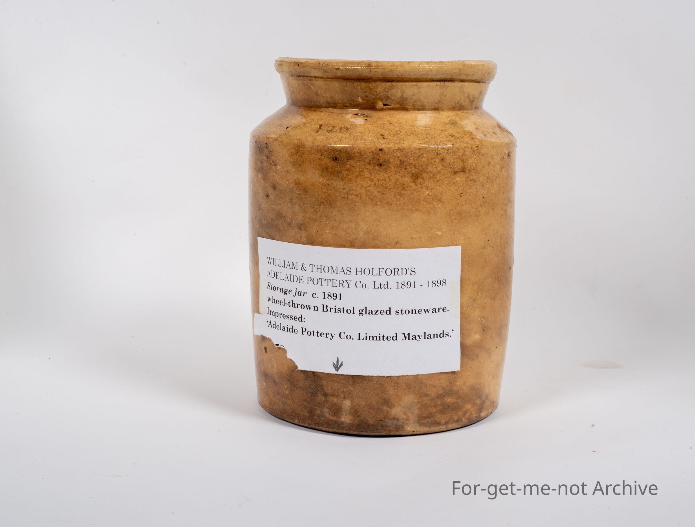 Storage jar from Wilford William Holford, Adelaide Pottery, 18/91 to 18/98. this piece is probably being dug. It has a large chip to the neck and not in very good condition, but it does have Halford's stamp on it. From that it is a point of interest.Collection