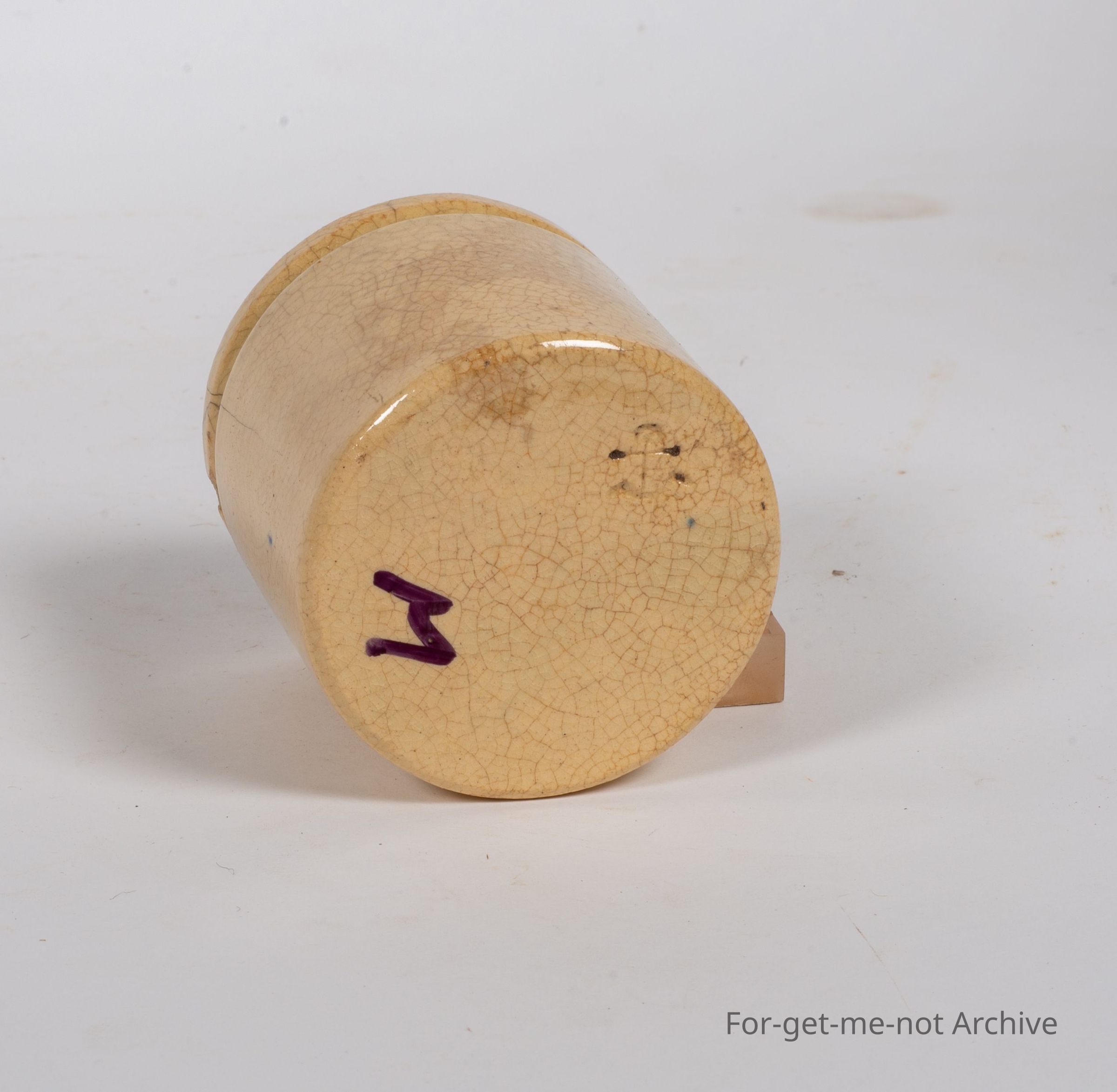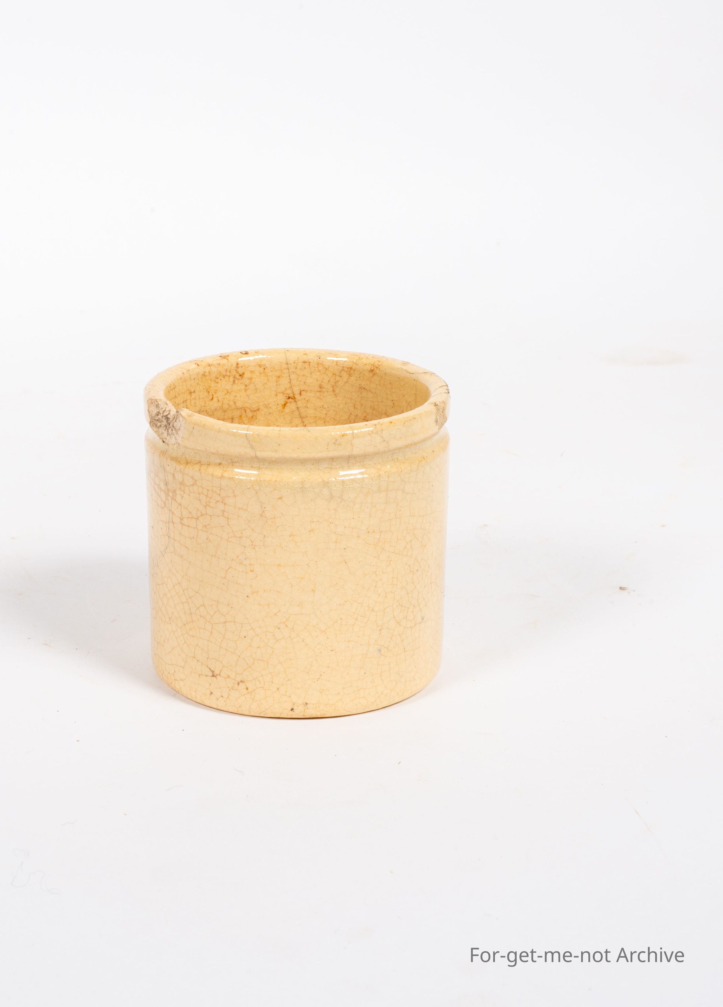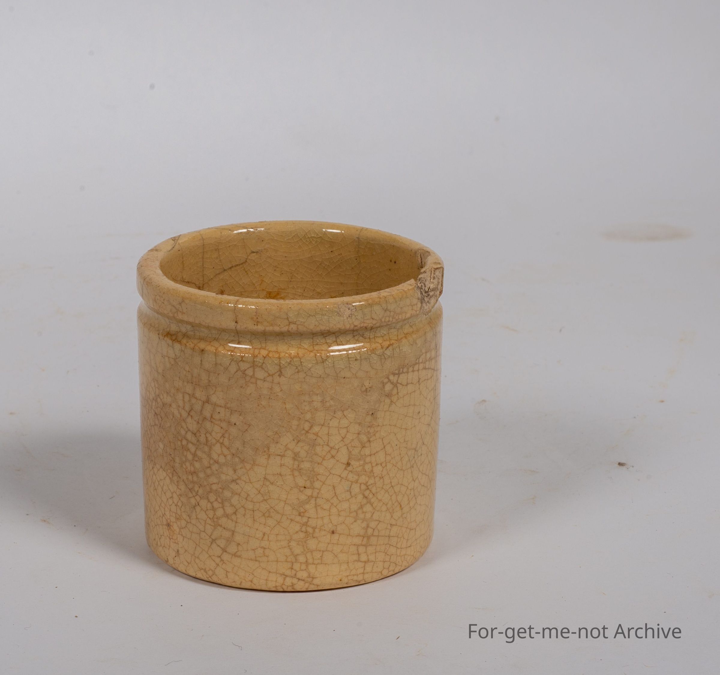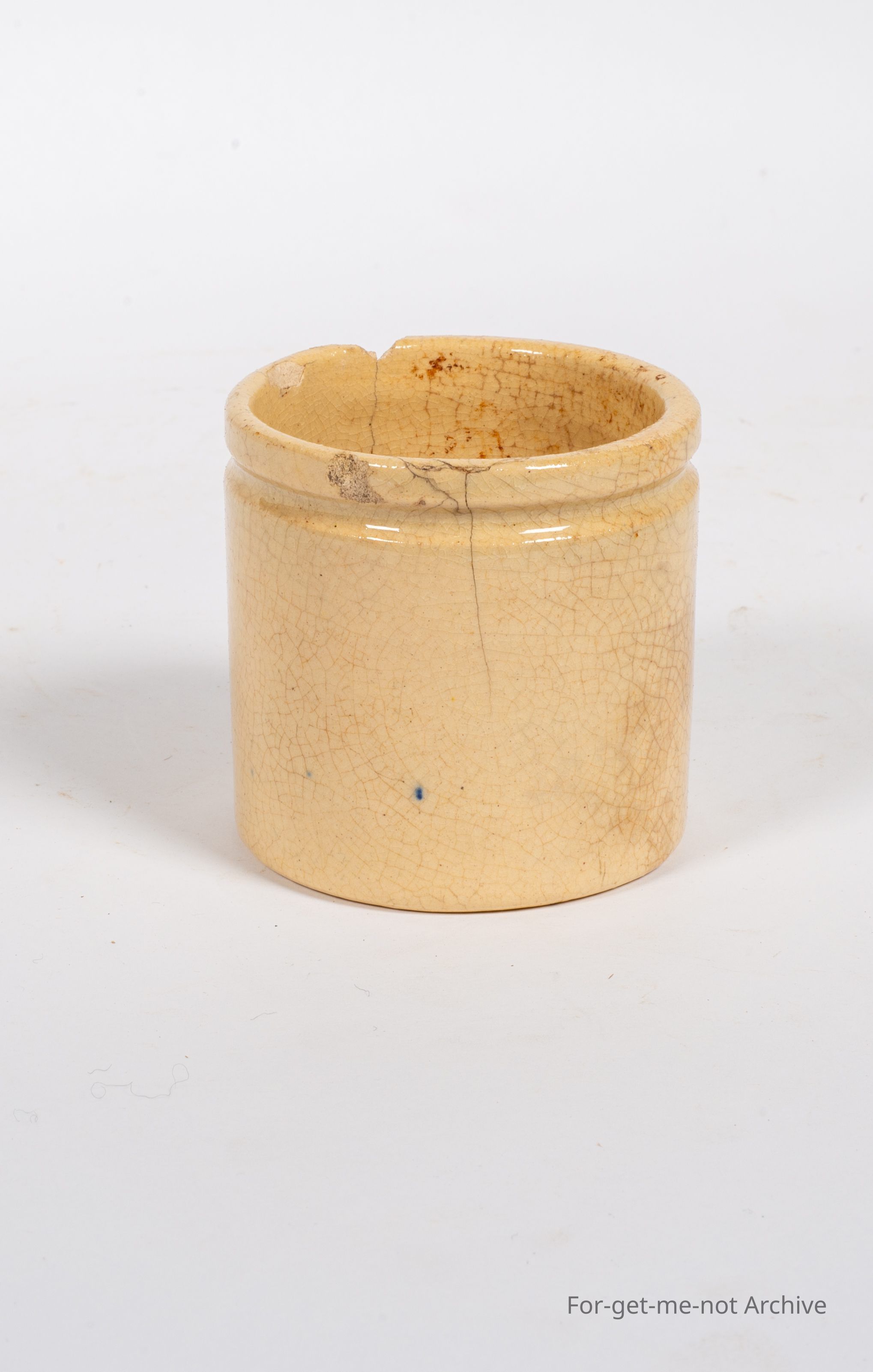 A small, ceramic glazed ointment jar. This is from Bendigo Pottery, this has the early Guthrie anchor stamp on the base. It has chips to the neck and cracks, but still a wonderful early piece. This is very unusual to see the anchor stamp on these small, ointment jars.Collection