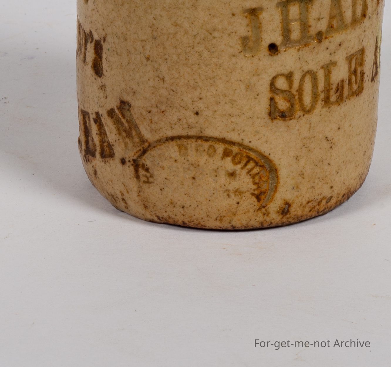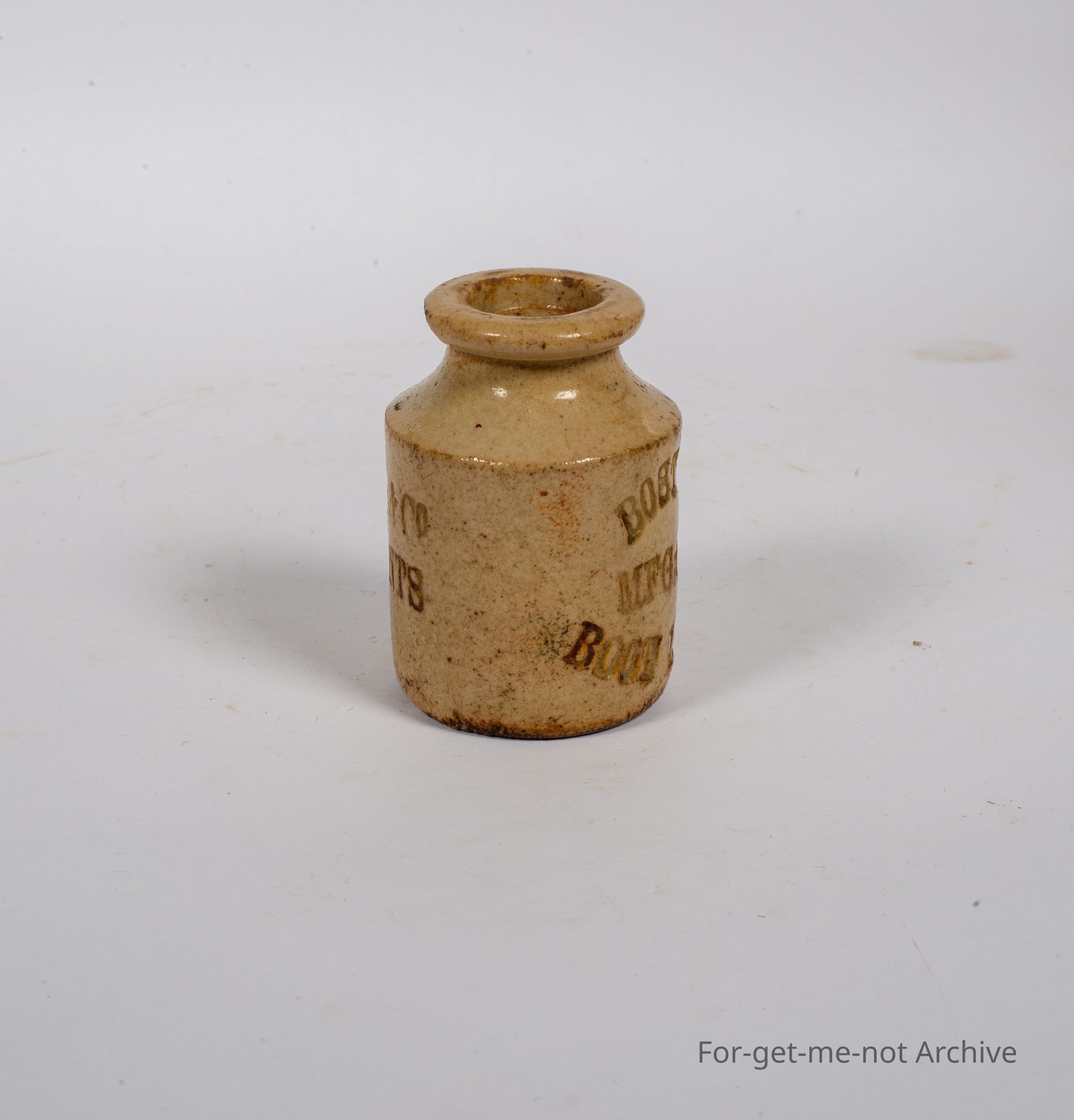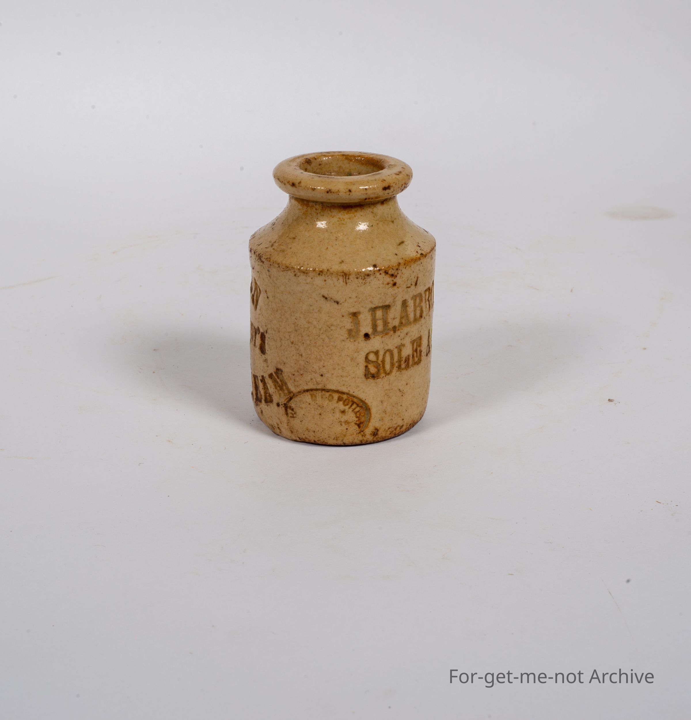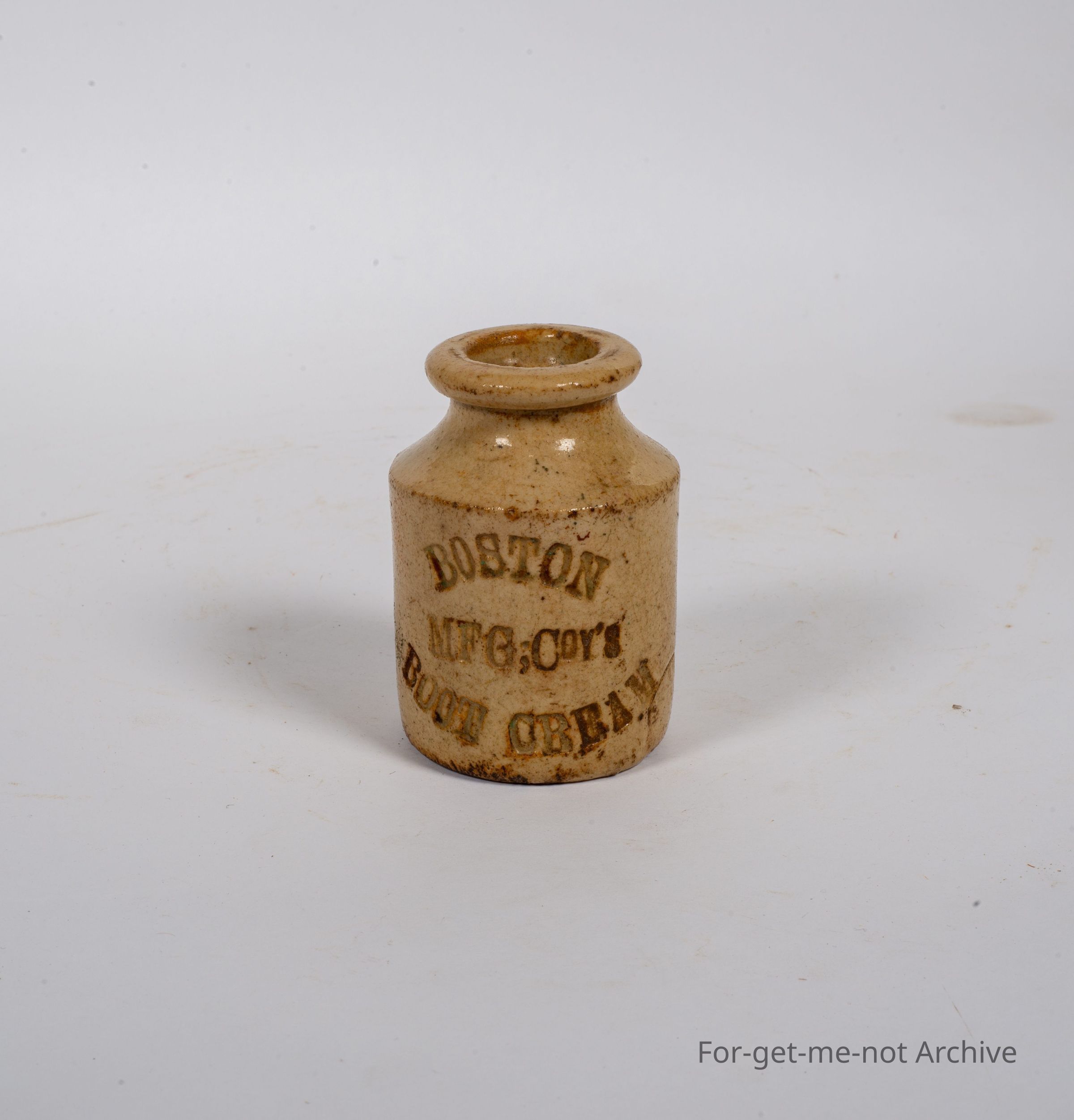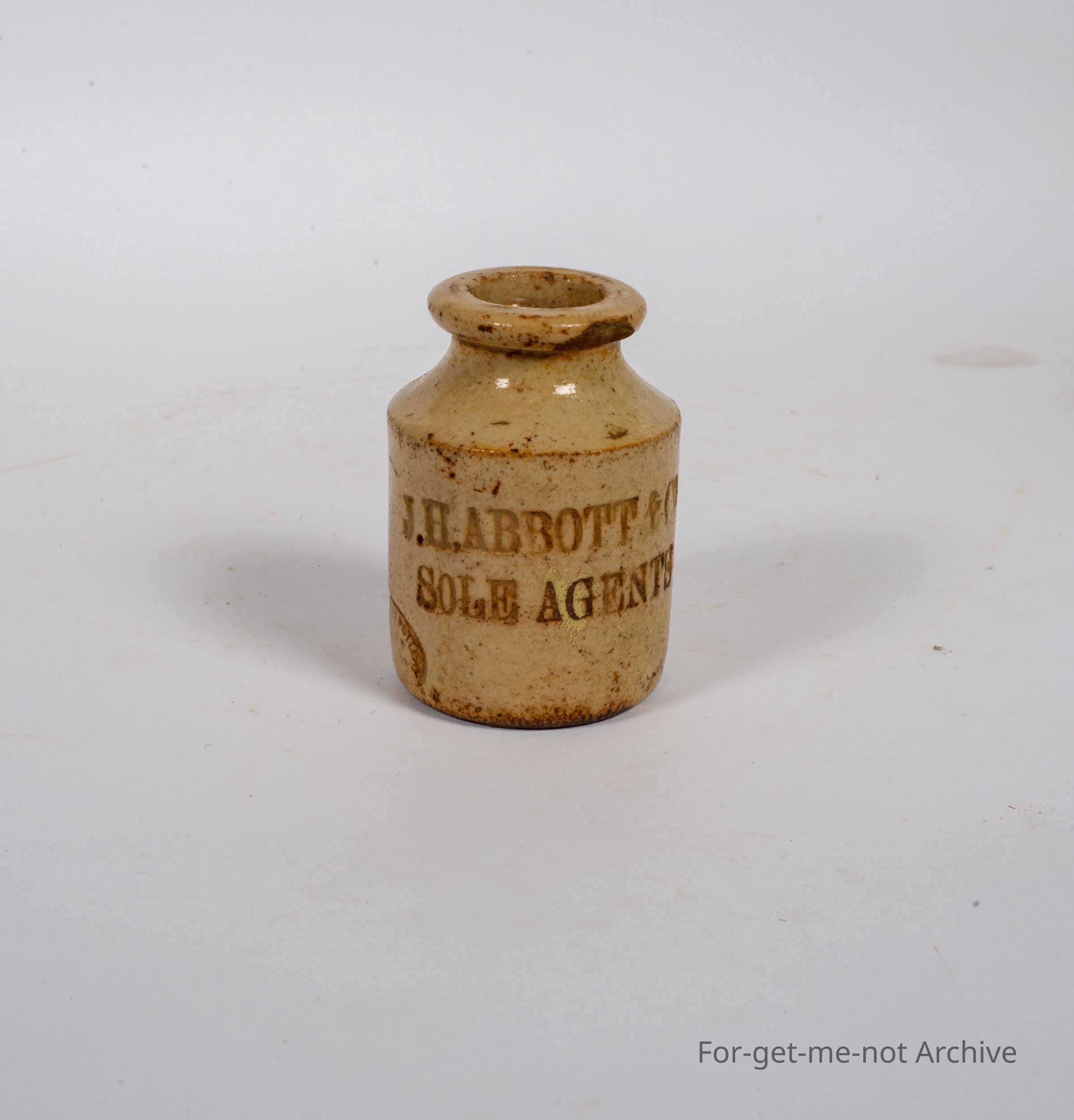 Stoneware pottery. This is a very small, wood fired, jar, this is, done by Bendigo Pottery, very early stamp. The stamping on the jar is J. H. Abbott and Co, Sole Agents. Boston Manufacturing Company, Boot Cream. This is a very rare piece,Collection