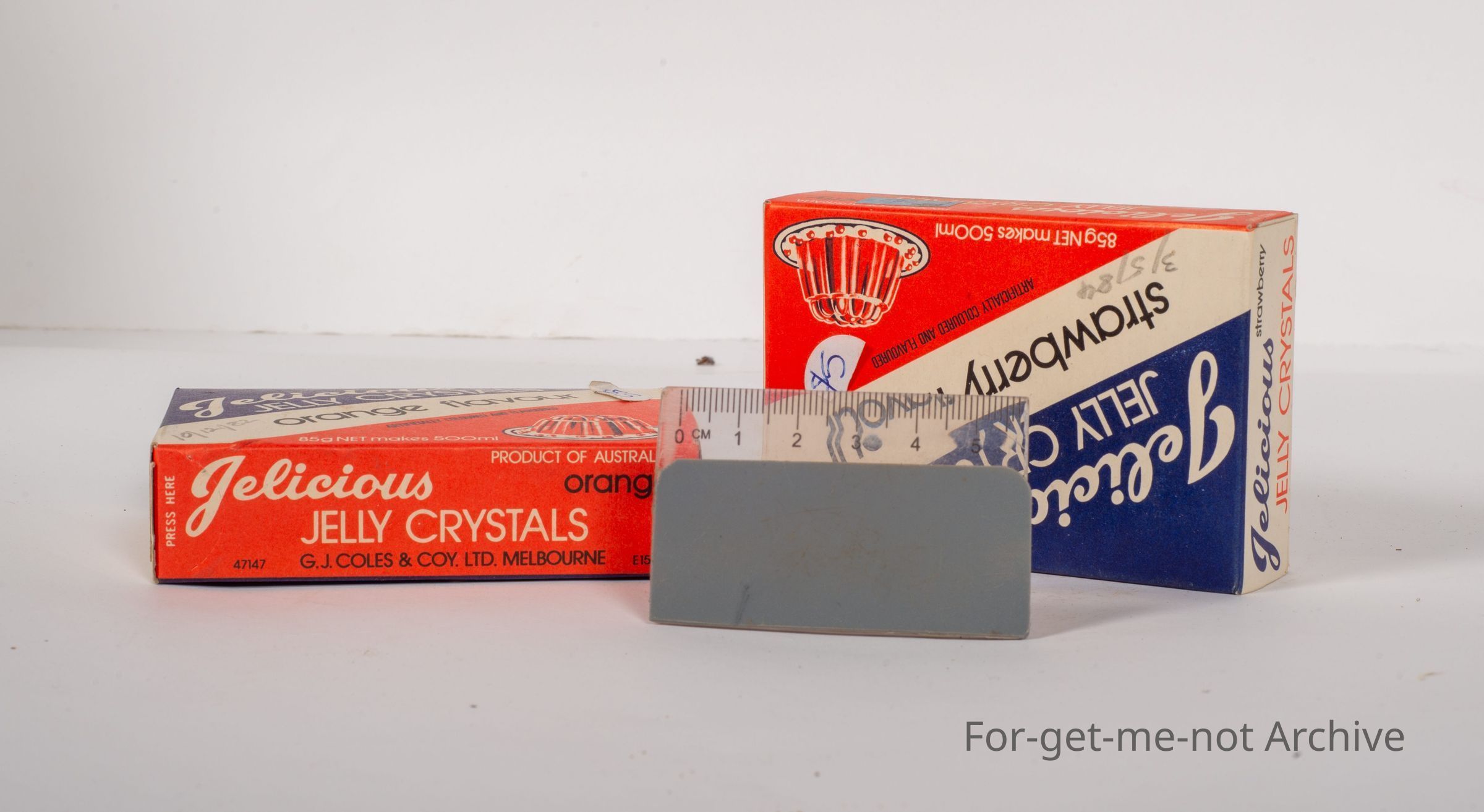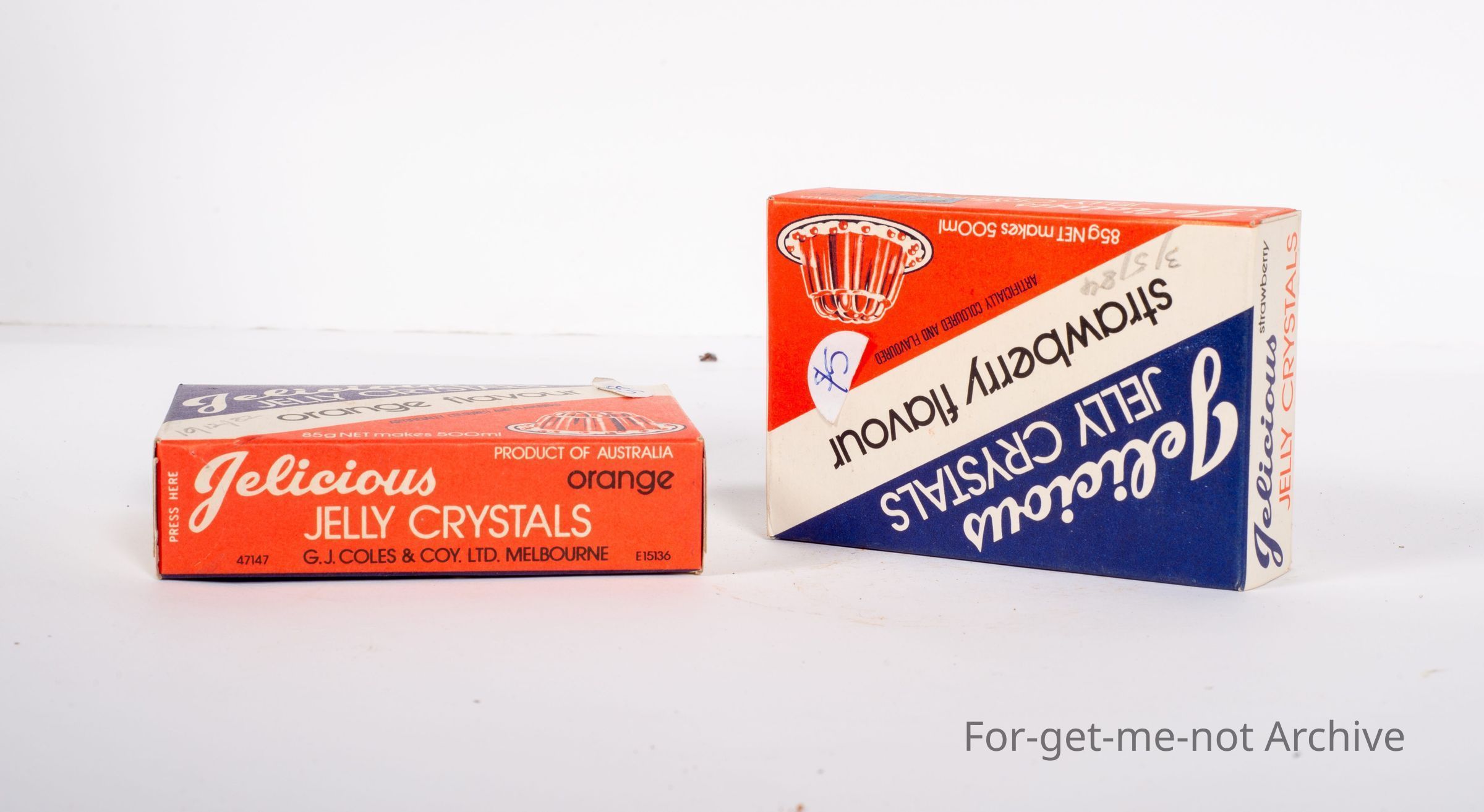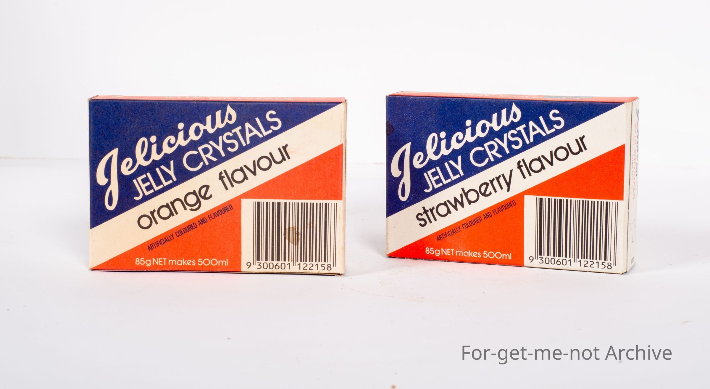 2 cardboard boxes of Jellicious Jelly Crystals. These are not old boxes. Quite contemporary, Strawberry flavour and Orange flavour. Both boxes in good condition.