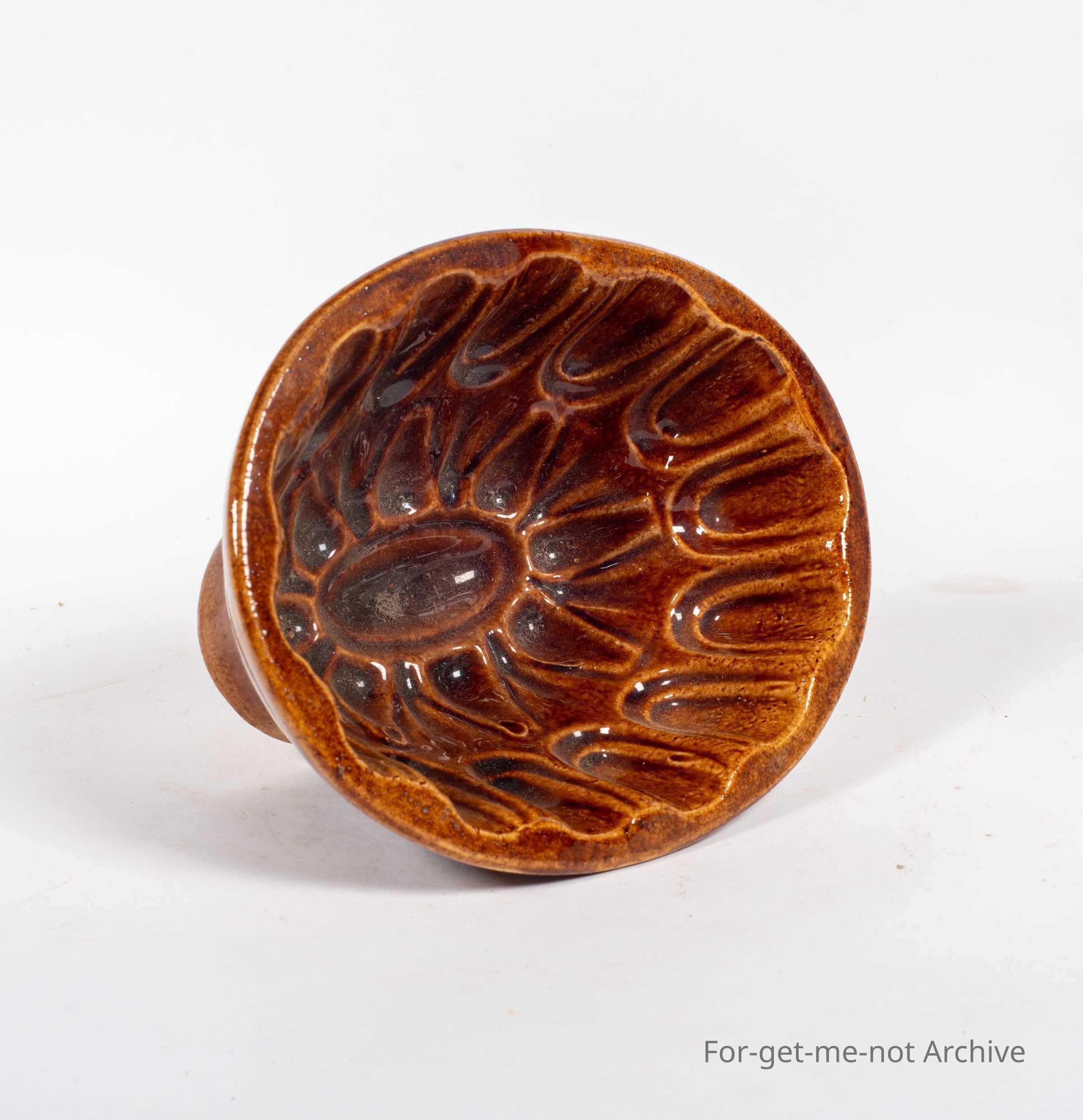 Stoneware pottery, this time, jelly Mold, this is, stamped litho pottery with a decorative mold on the inside for jelly. This is got a rocking ham glaze in very good nick, couple of chips to the base, otherwise, a lovely piece.Collection