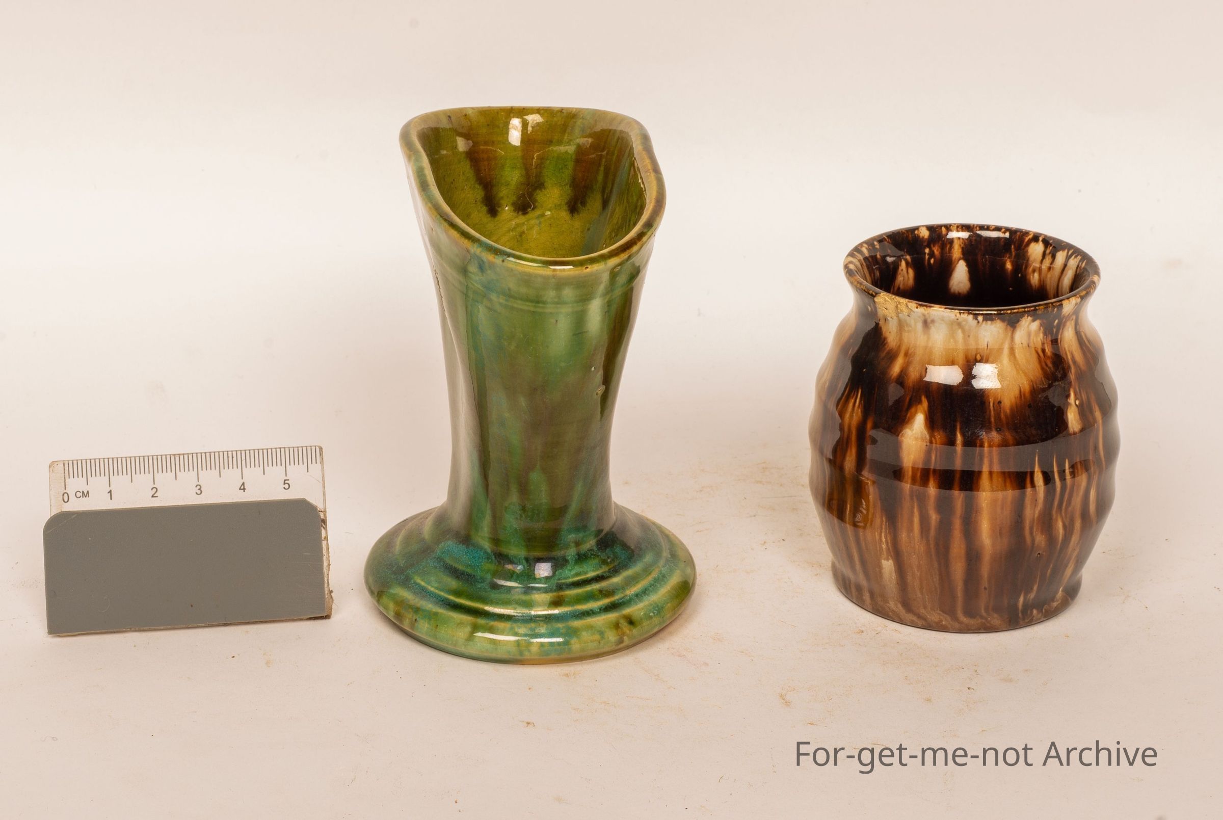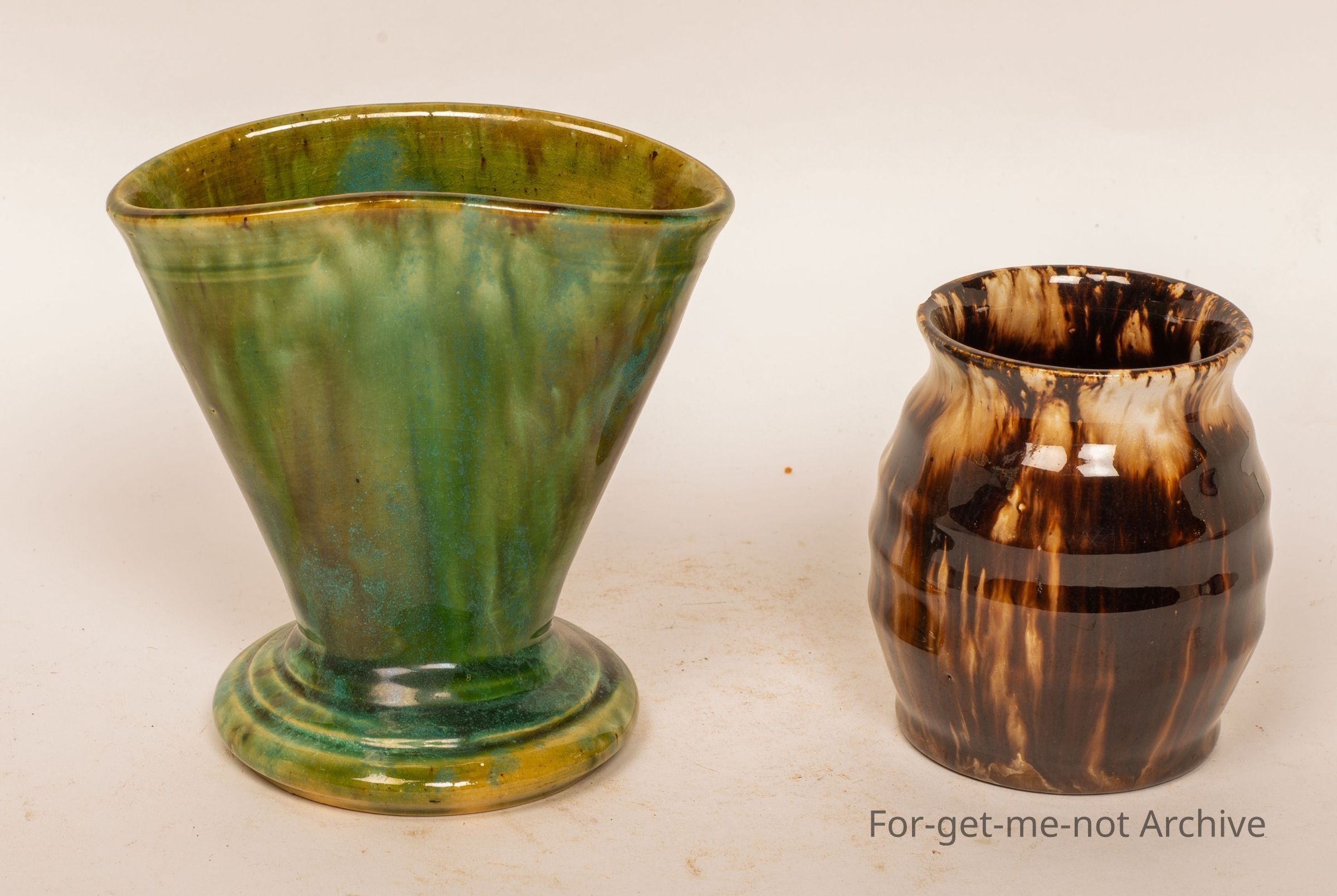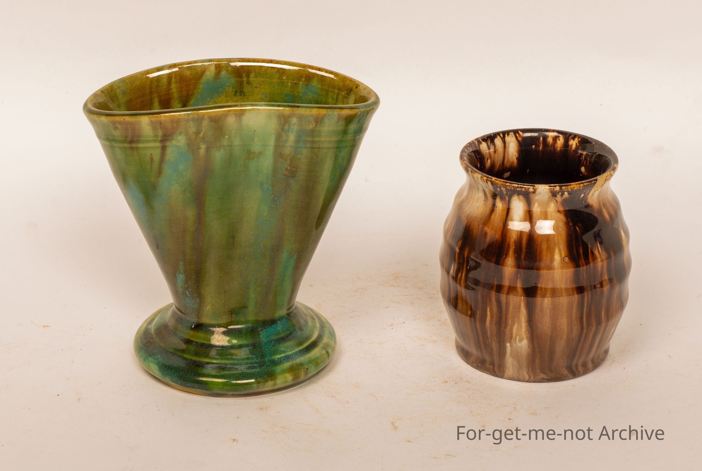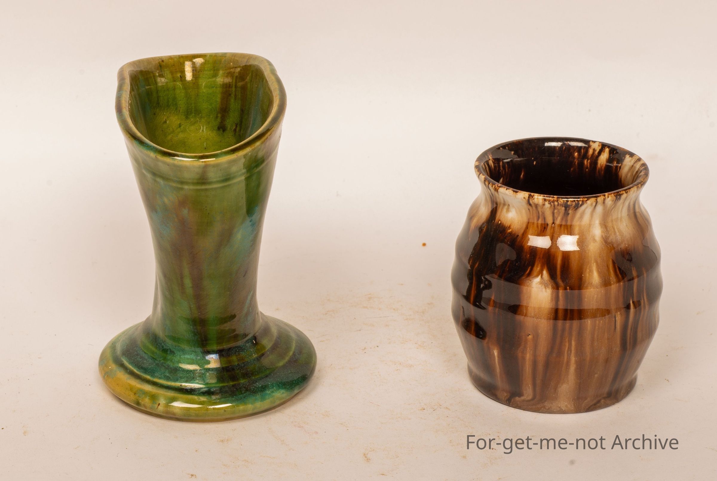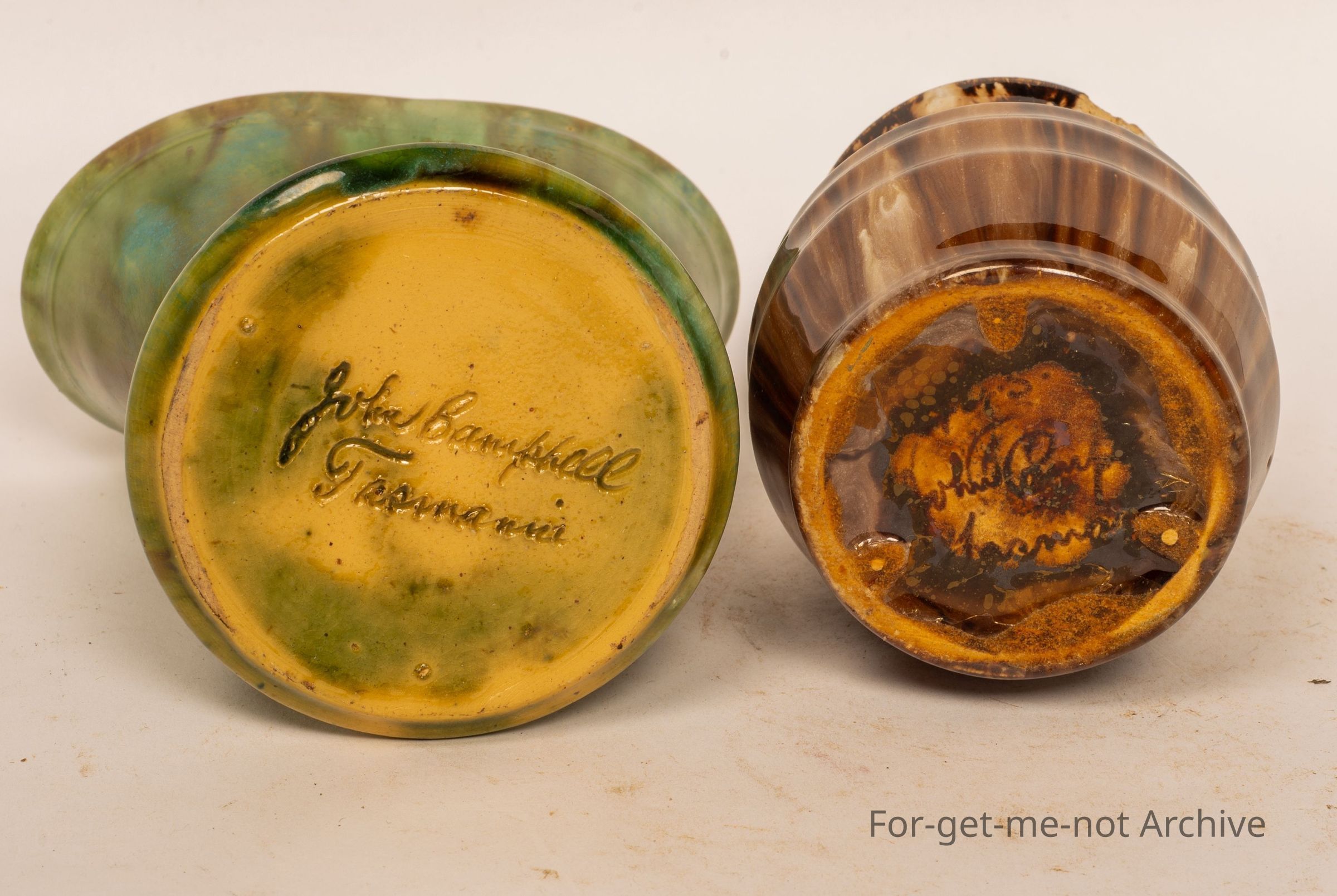 2 small pieces, 2 vases, 1 green, 1 brown, from John Campbell, Tasmania.