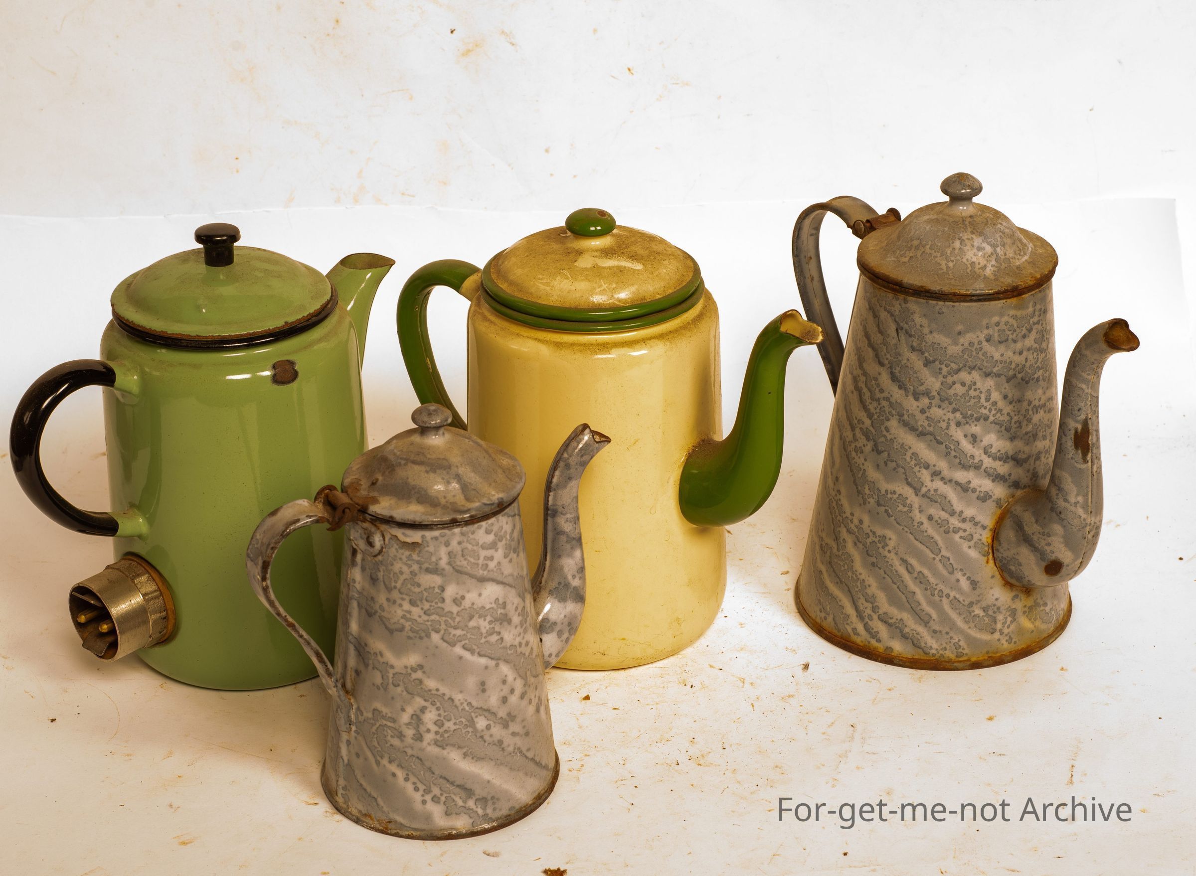 This is a set of, full of jugs, 1 enamelled but electric. The other 2 are grey enamelled coffee jugs and the third one is a cream coffee jug. All in reasonably good condition.