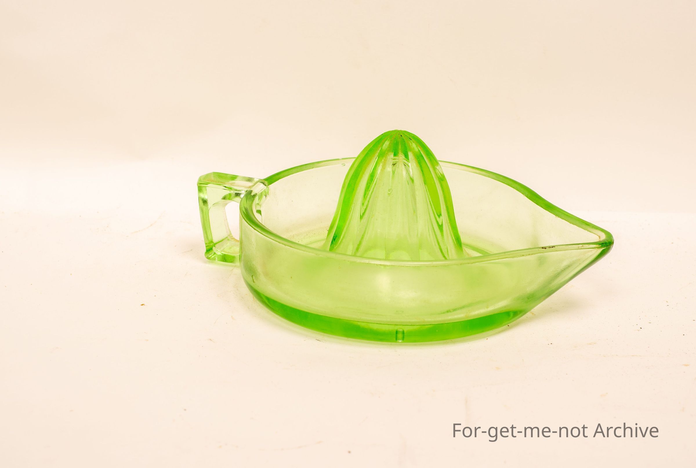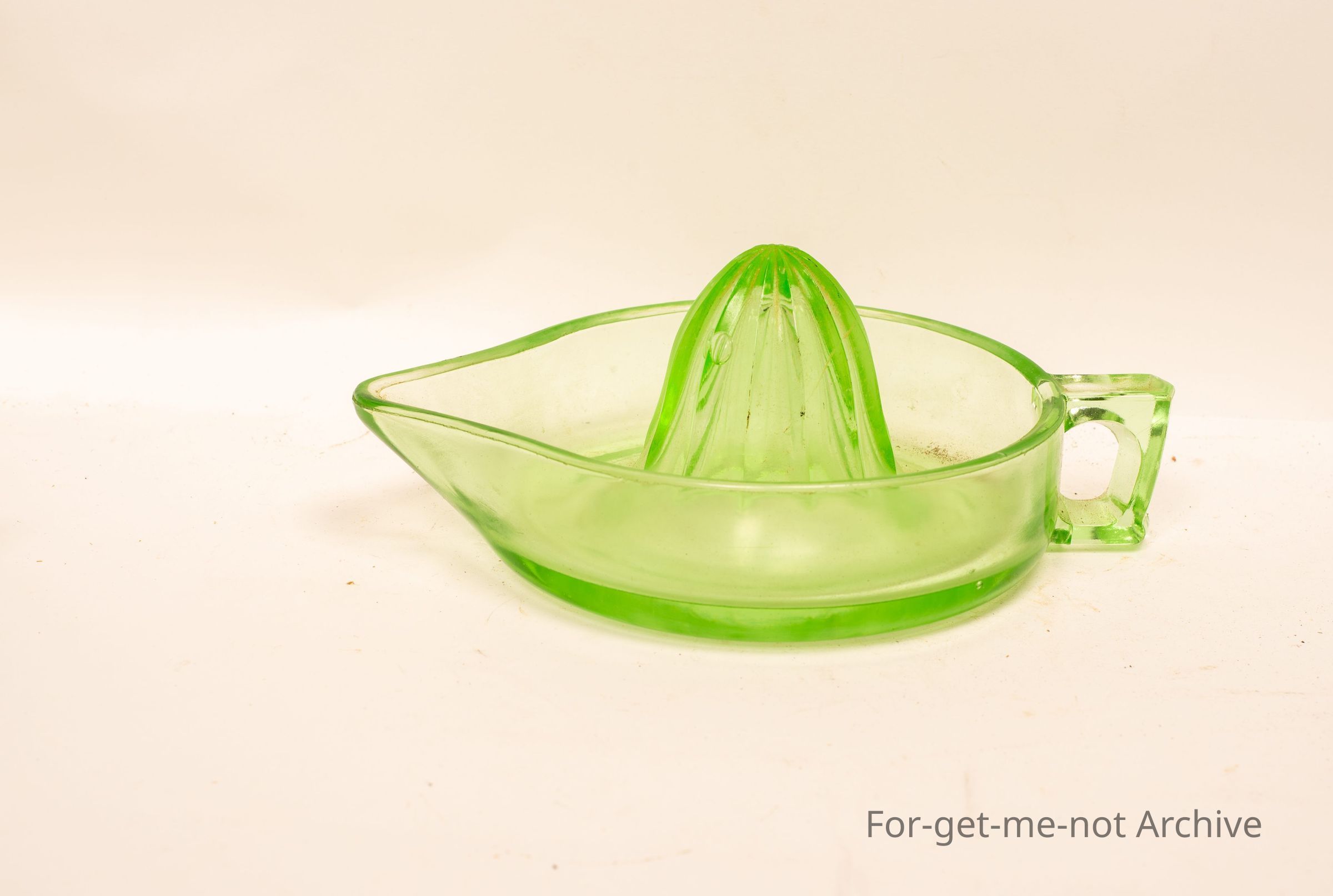 A depression glass, green, orange juicer with pourer, very good order.