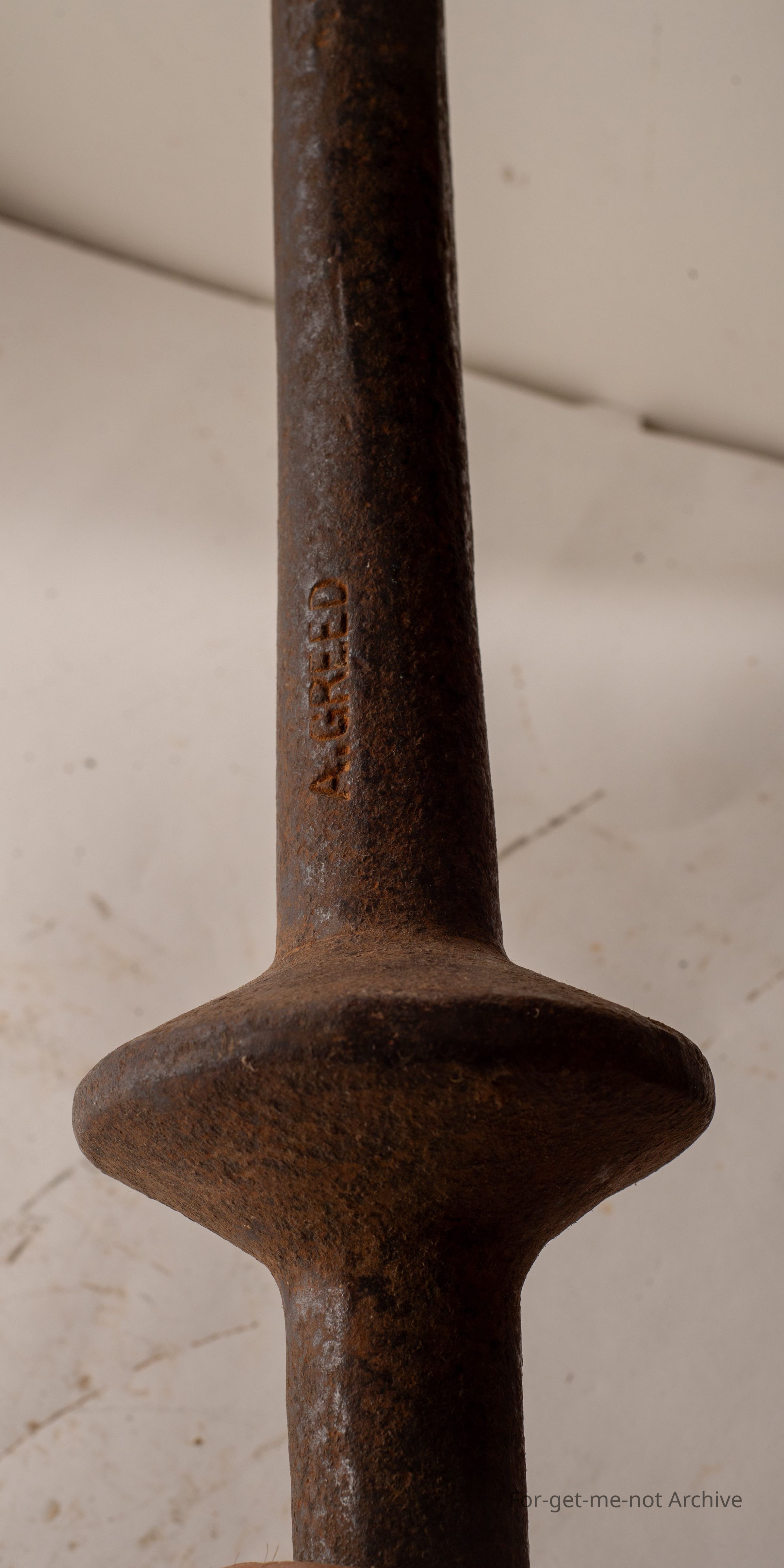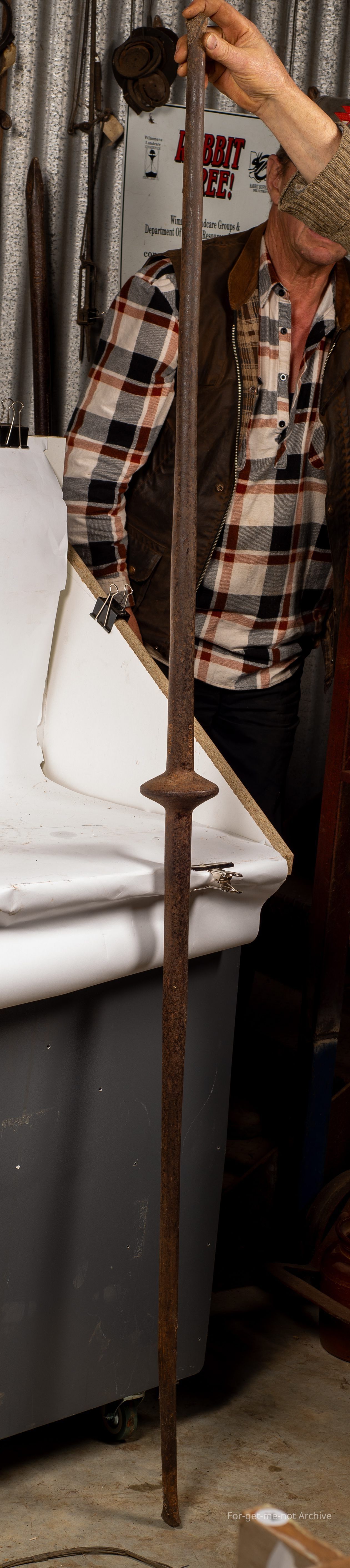 This is another jump bar rock tool. This one is stamped, Greed, g r, double e, d. Greed was a blacksmith in Hamilton, Victoria. This is quite a heavy one. Well formed cutting blades either end. Lovely percussion disc in the centre.Collection