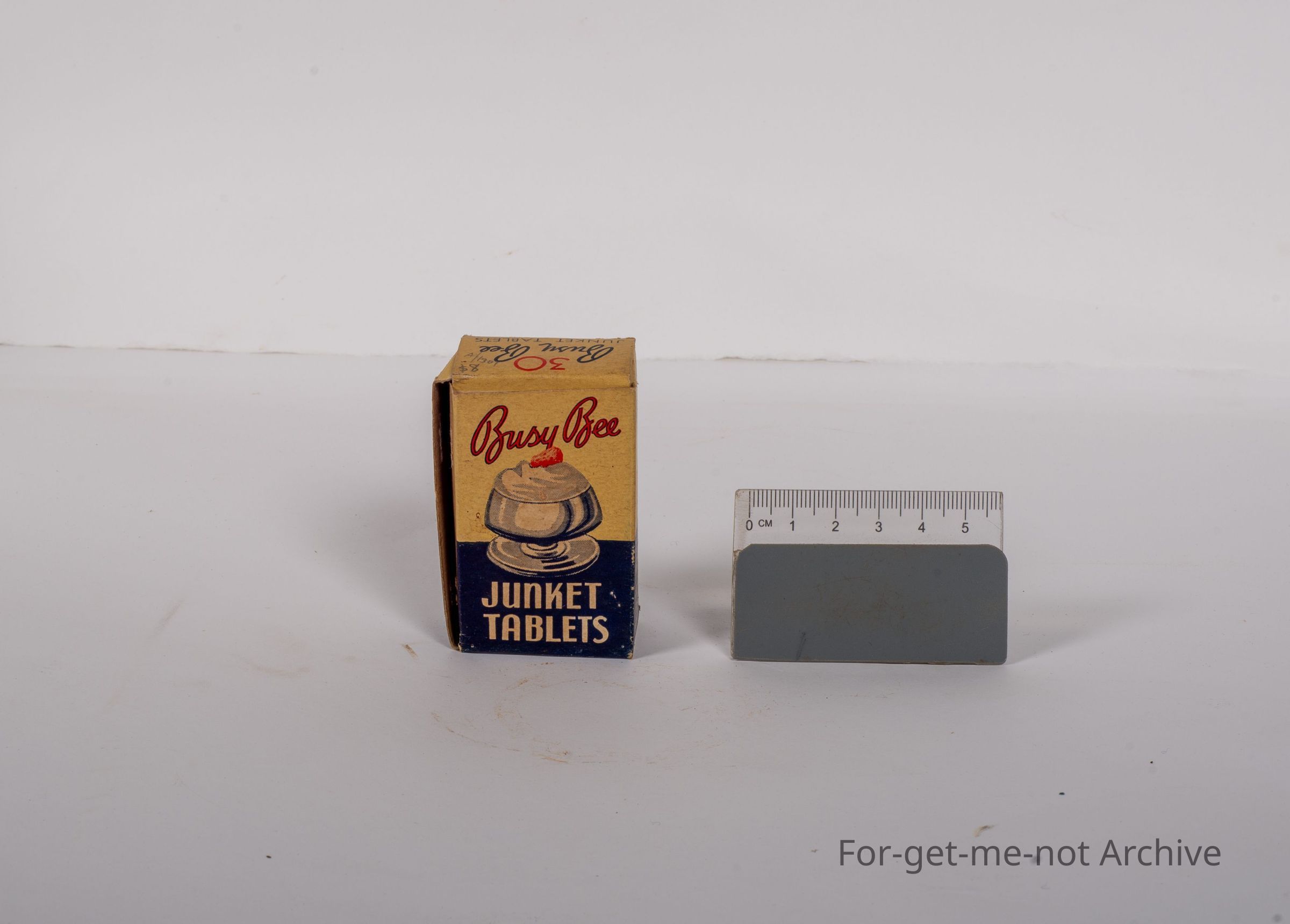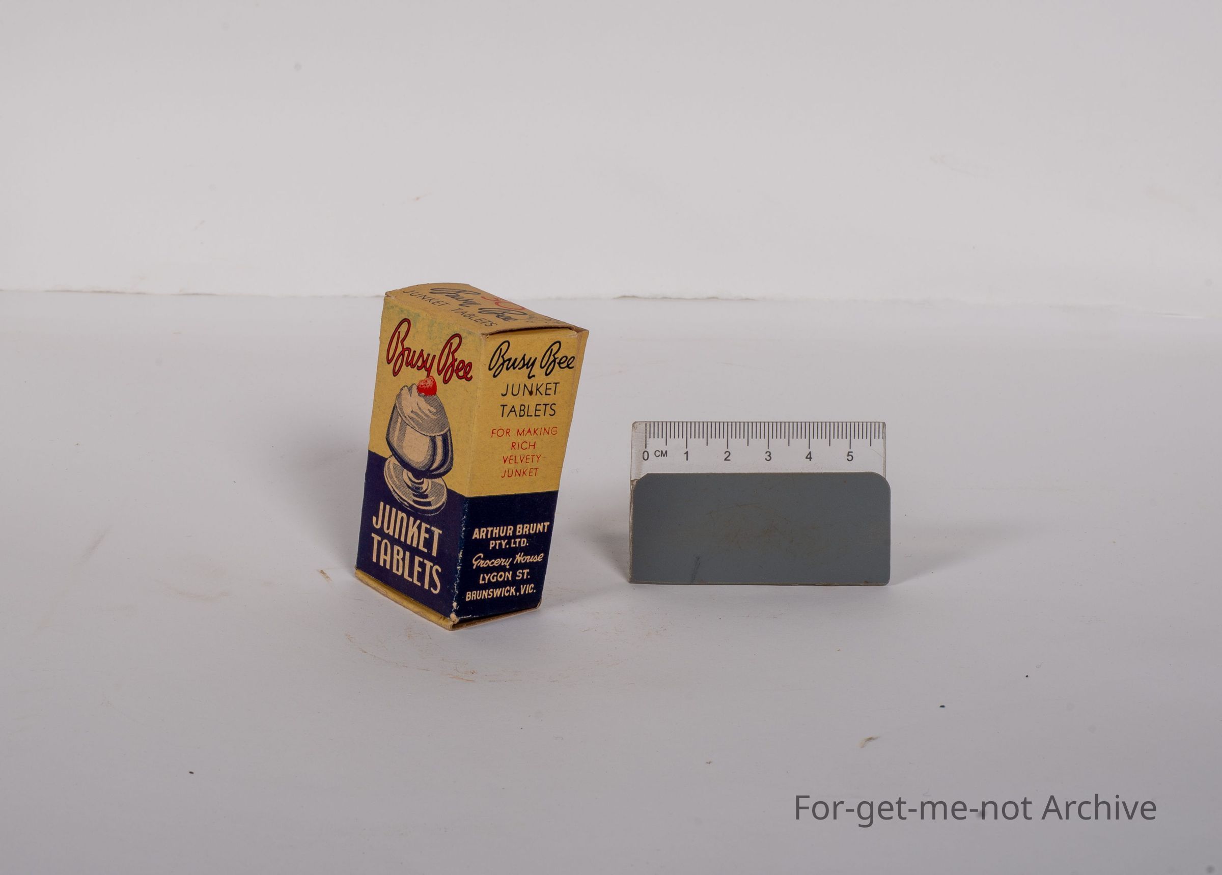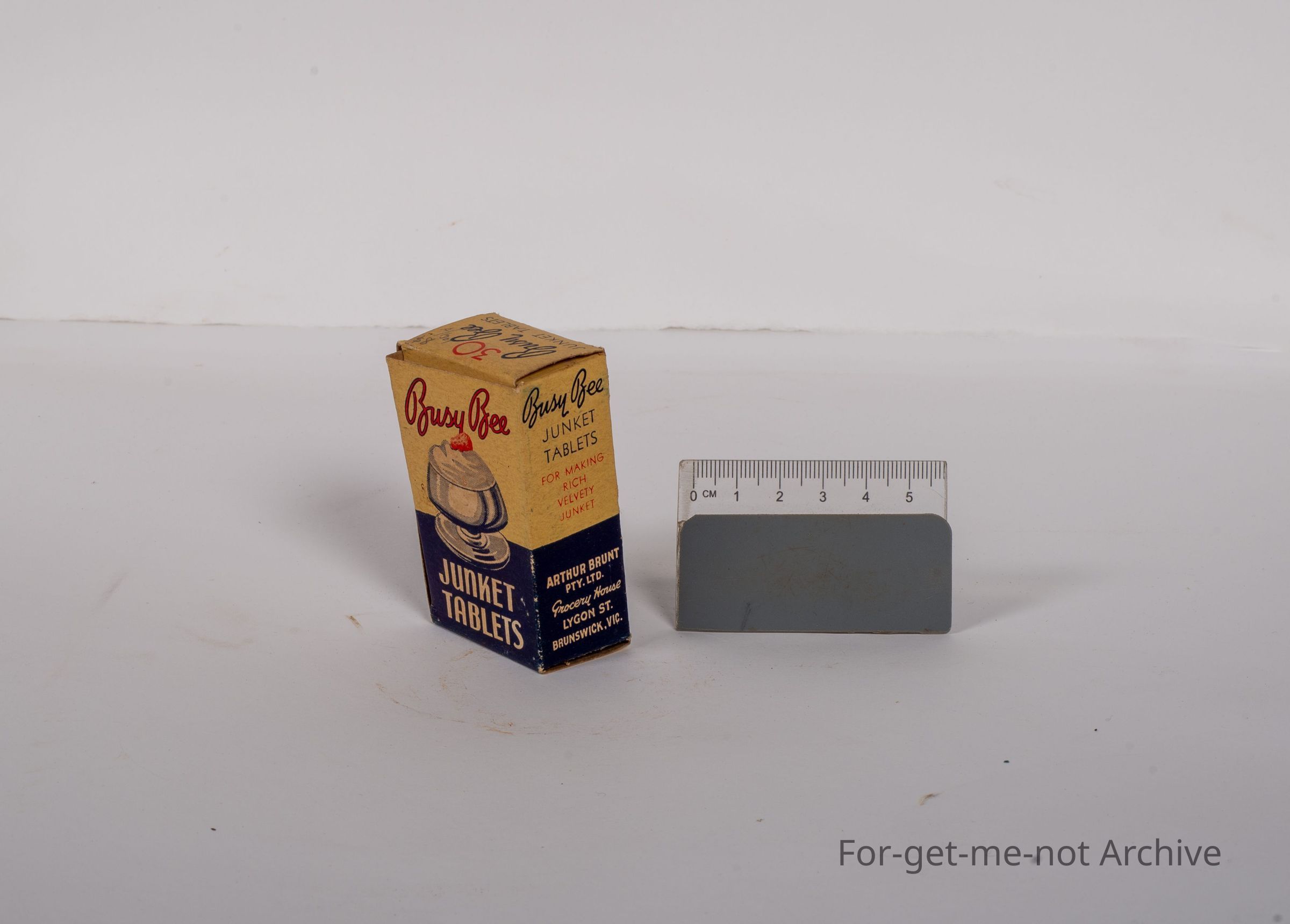This is a small cardboard box. The contents are Busy Bee Junket Tablets. The jar with the tablets is still intact inside. This has been packed by Arthur Brunt. Grocery House Lygon Street, Brunswick, Victoria. Lovely early piece.Collection