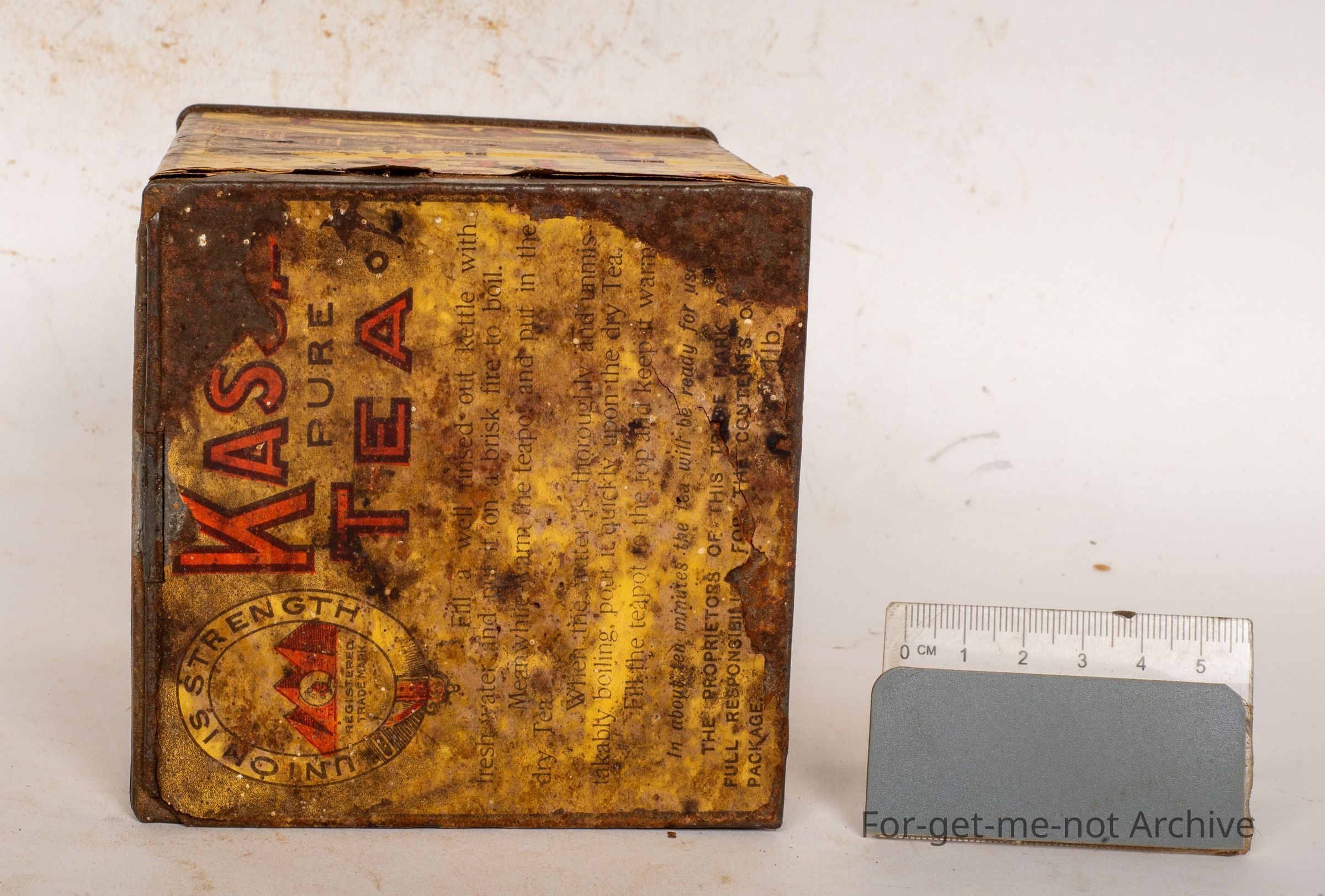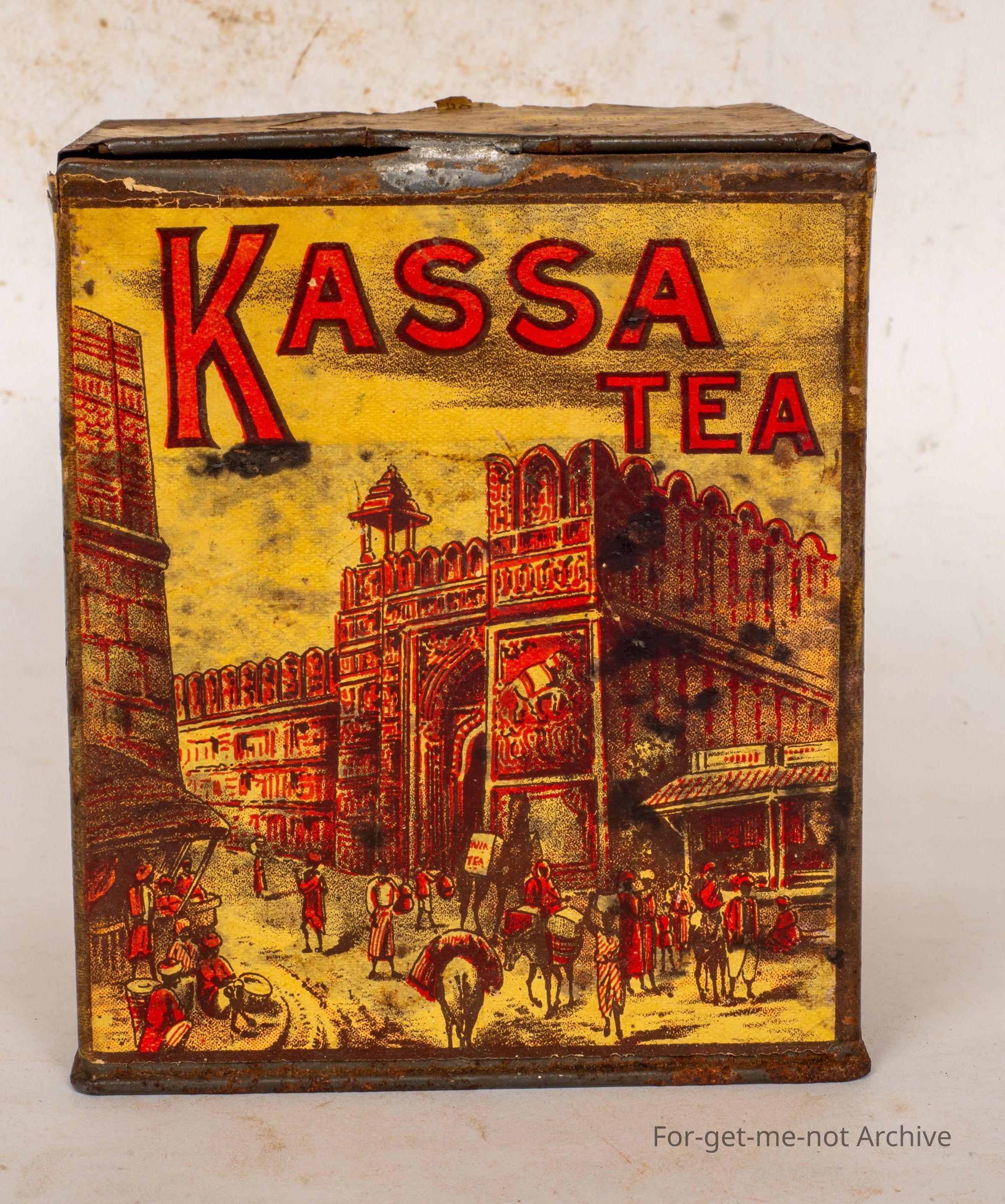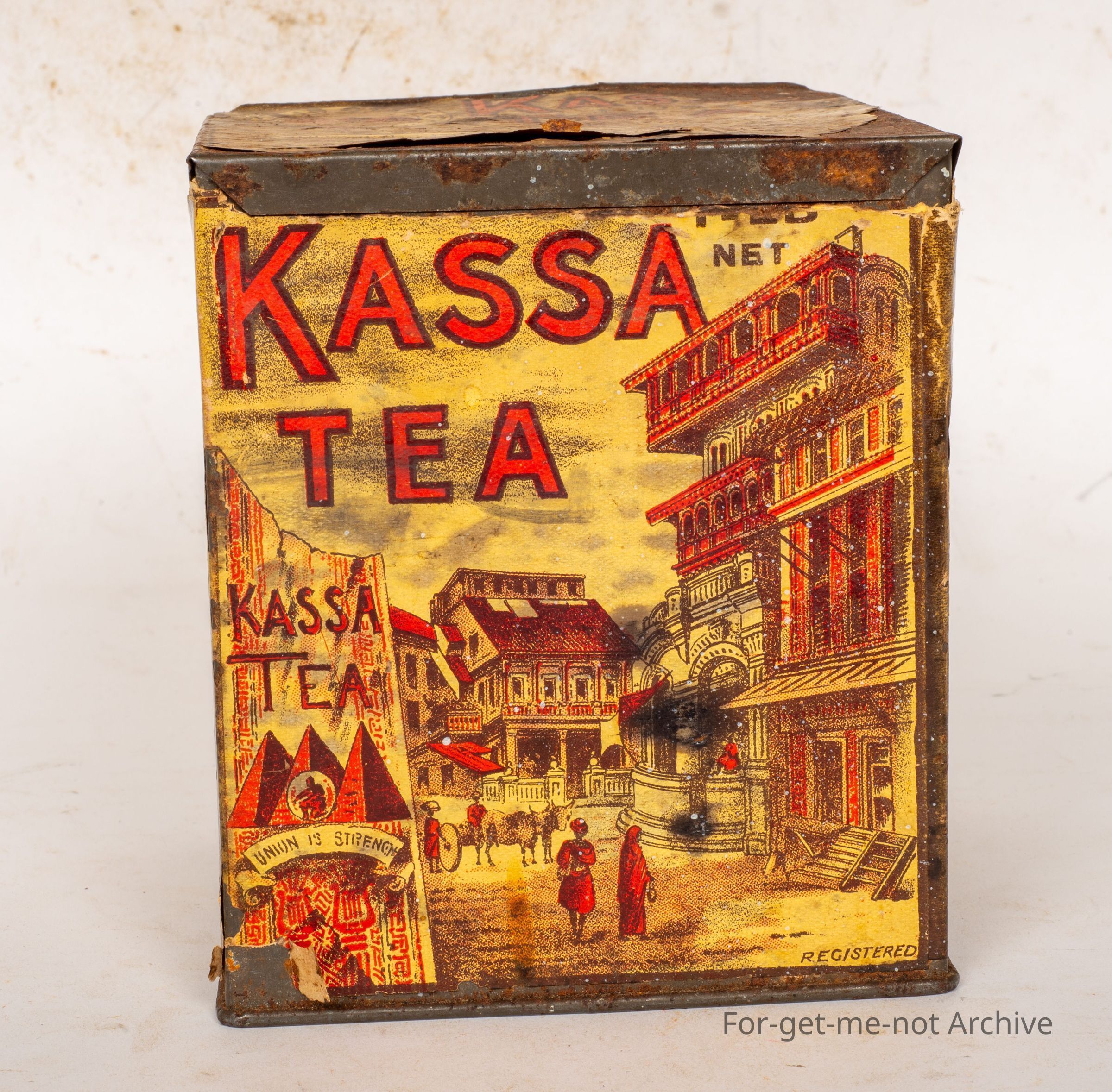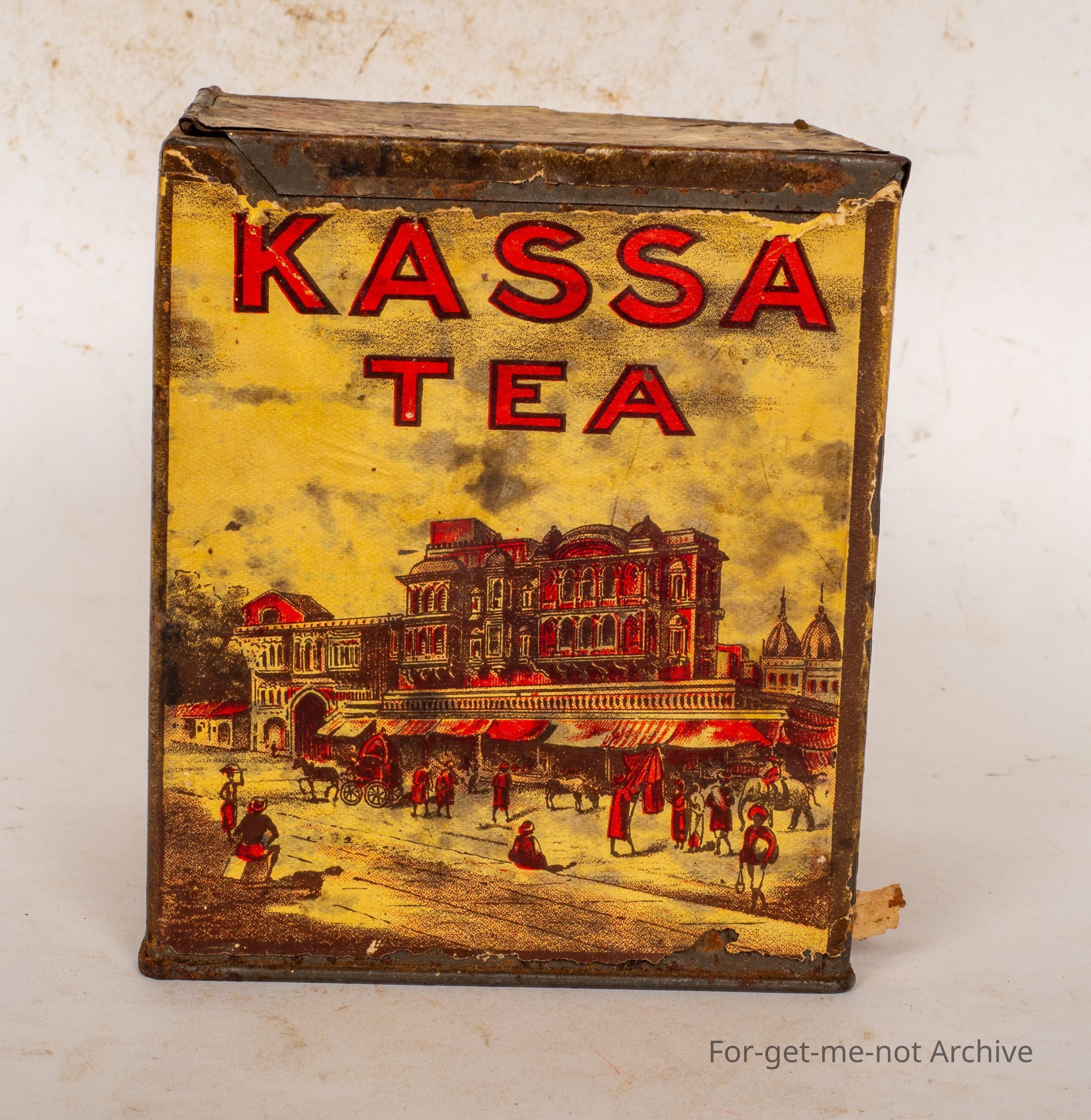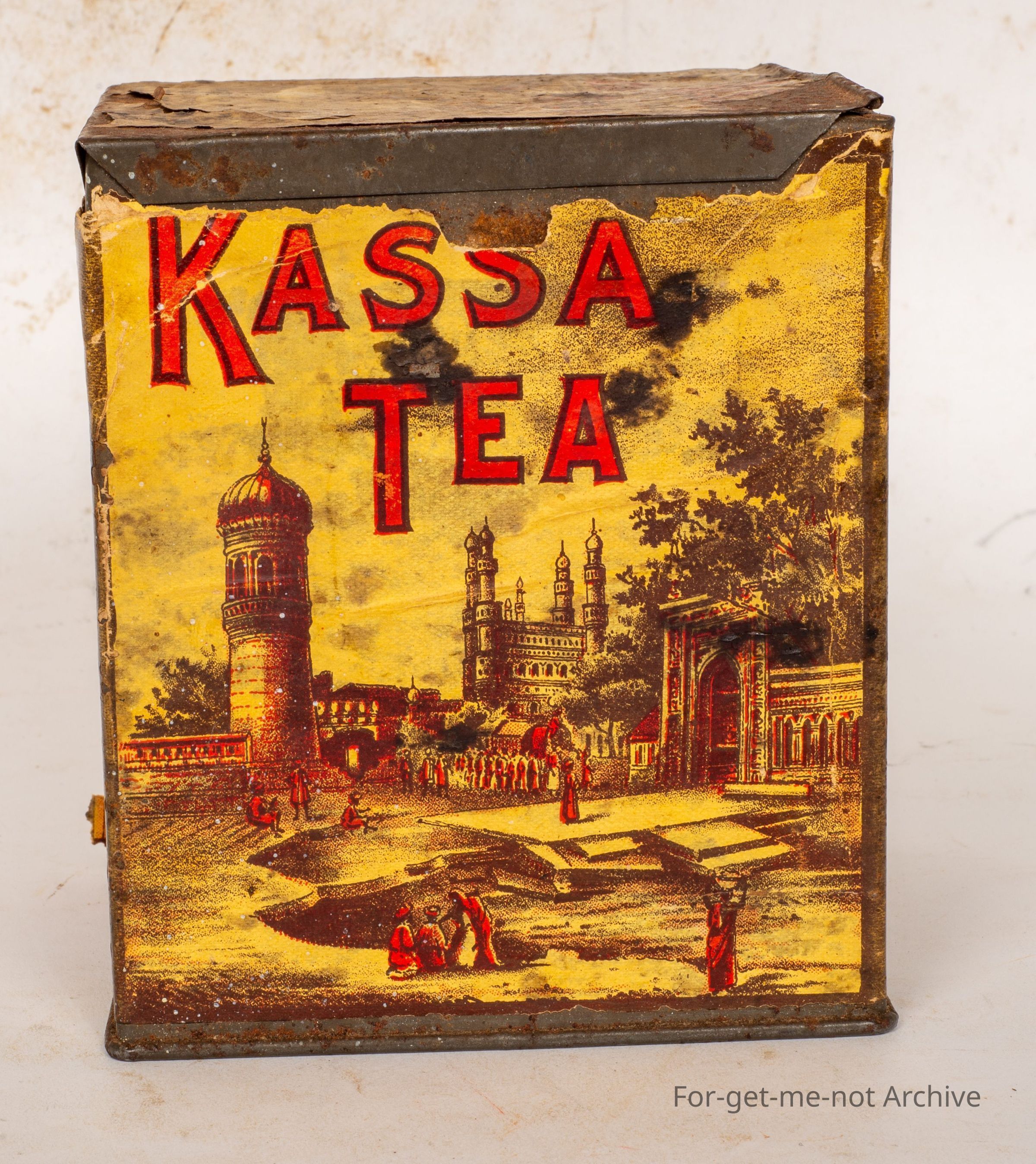 Kasa Tea Tin, This is a paper label tin, with labels intact, in very good order for its age. Has scenes from Aisa on all sides a rare example of an old tin