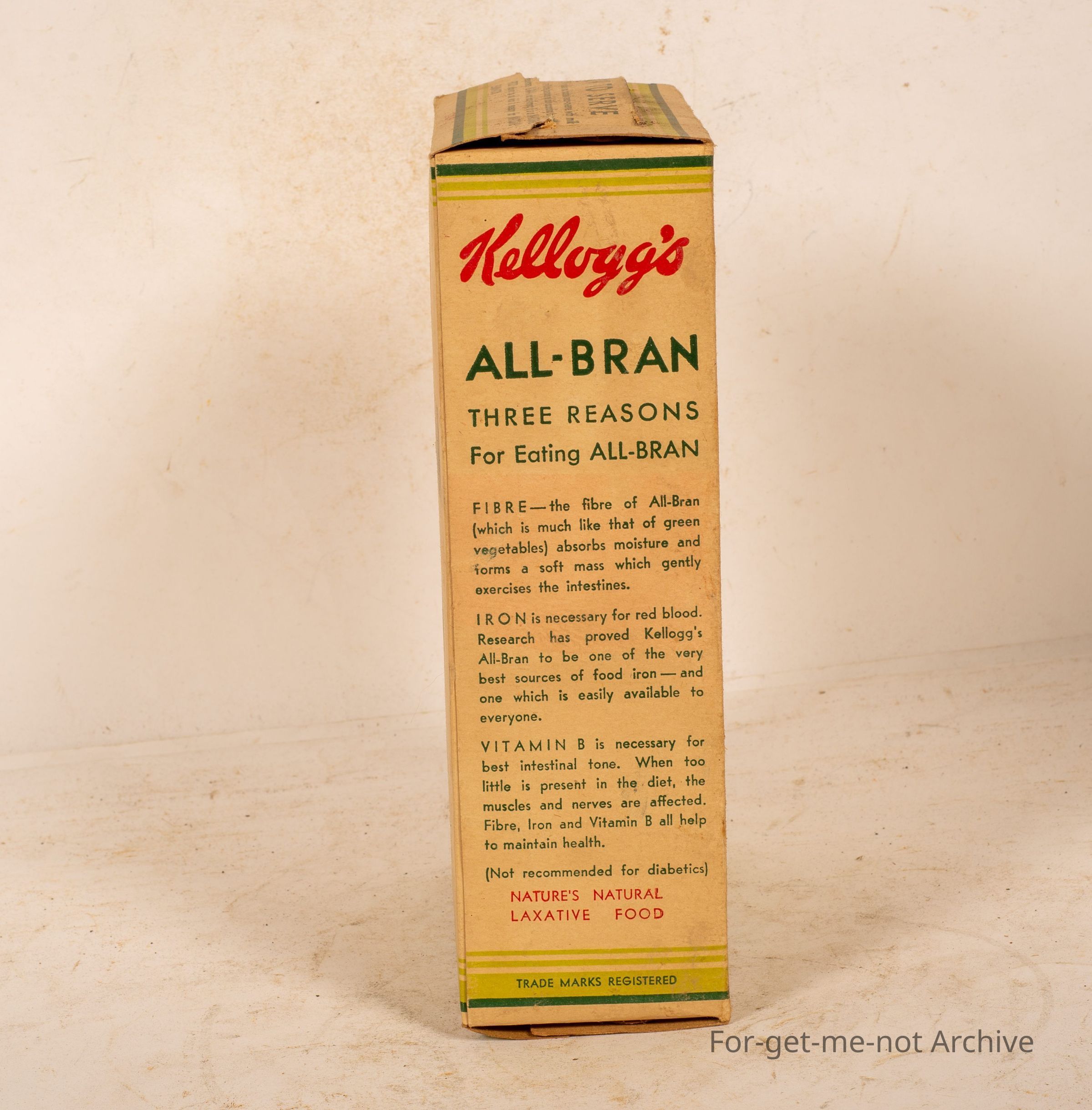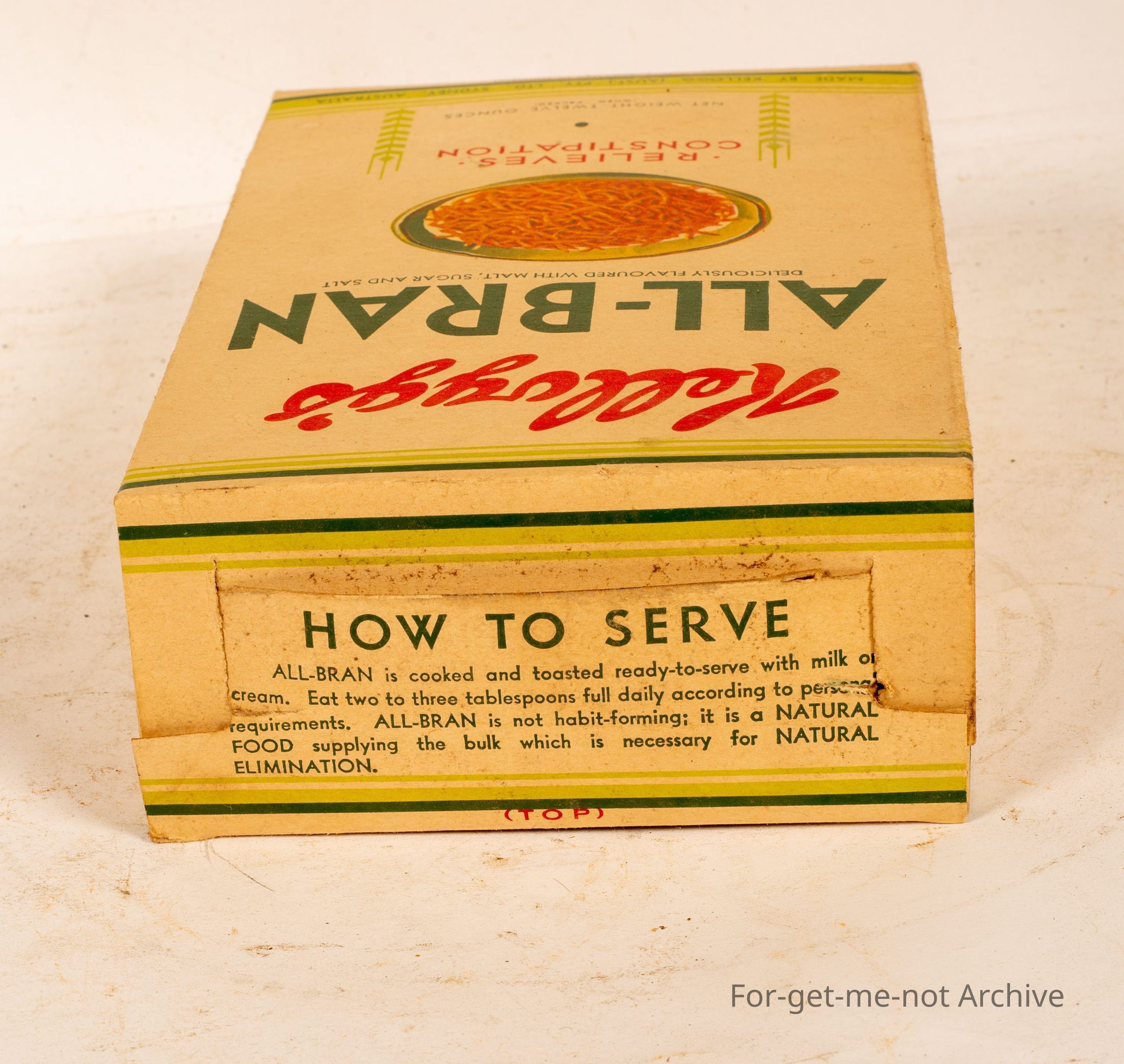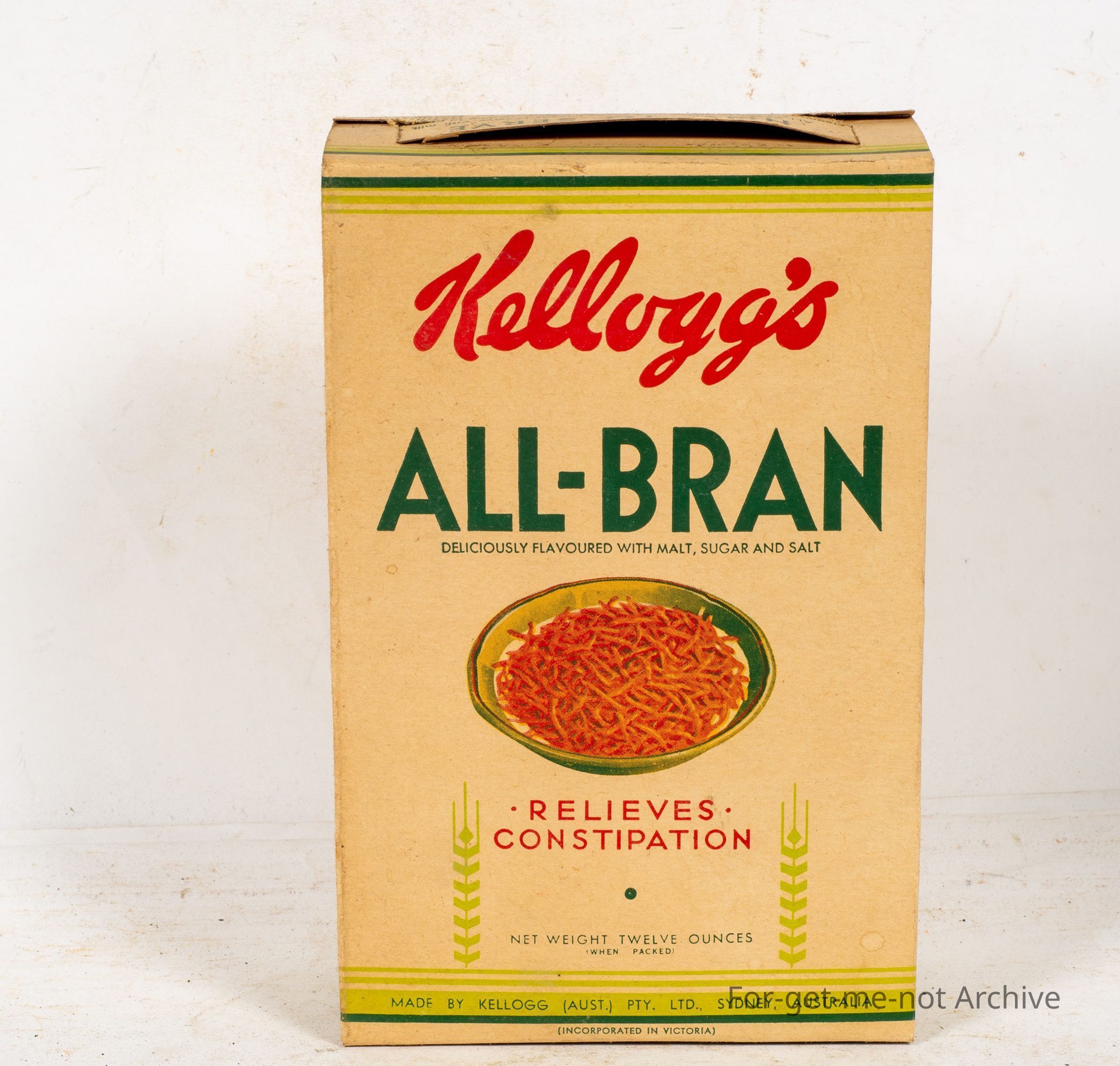 This is a small box of Kellogg's Allbran, in excellent condition. Twelve ounce net weight, diagram of a bowl with all brand in it, which says relieves constipation.