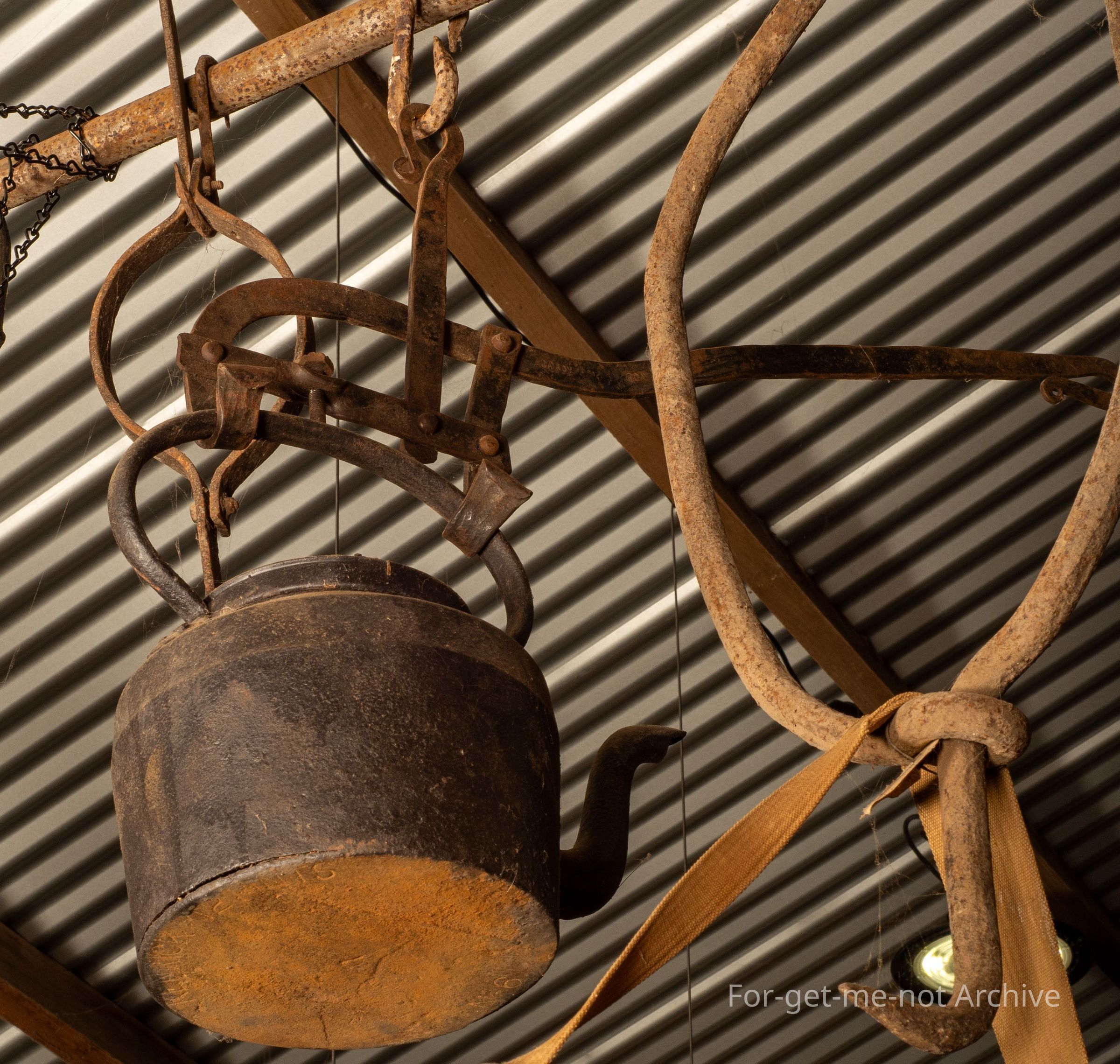 This is a Kendrick kettle, roughly 1 gallon. It is hanging from an easy back, which was a pouring mechanism for women to use making it an easier and safer operation to pour. These hung from a fireplace crane. The handle allowed women to tilt this the kettle over without having to lift the kettle to get boiling waters for whatever use.Collection