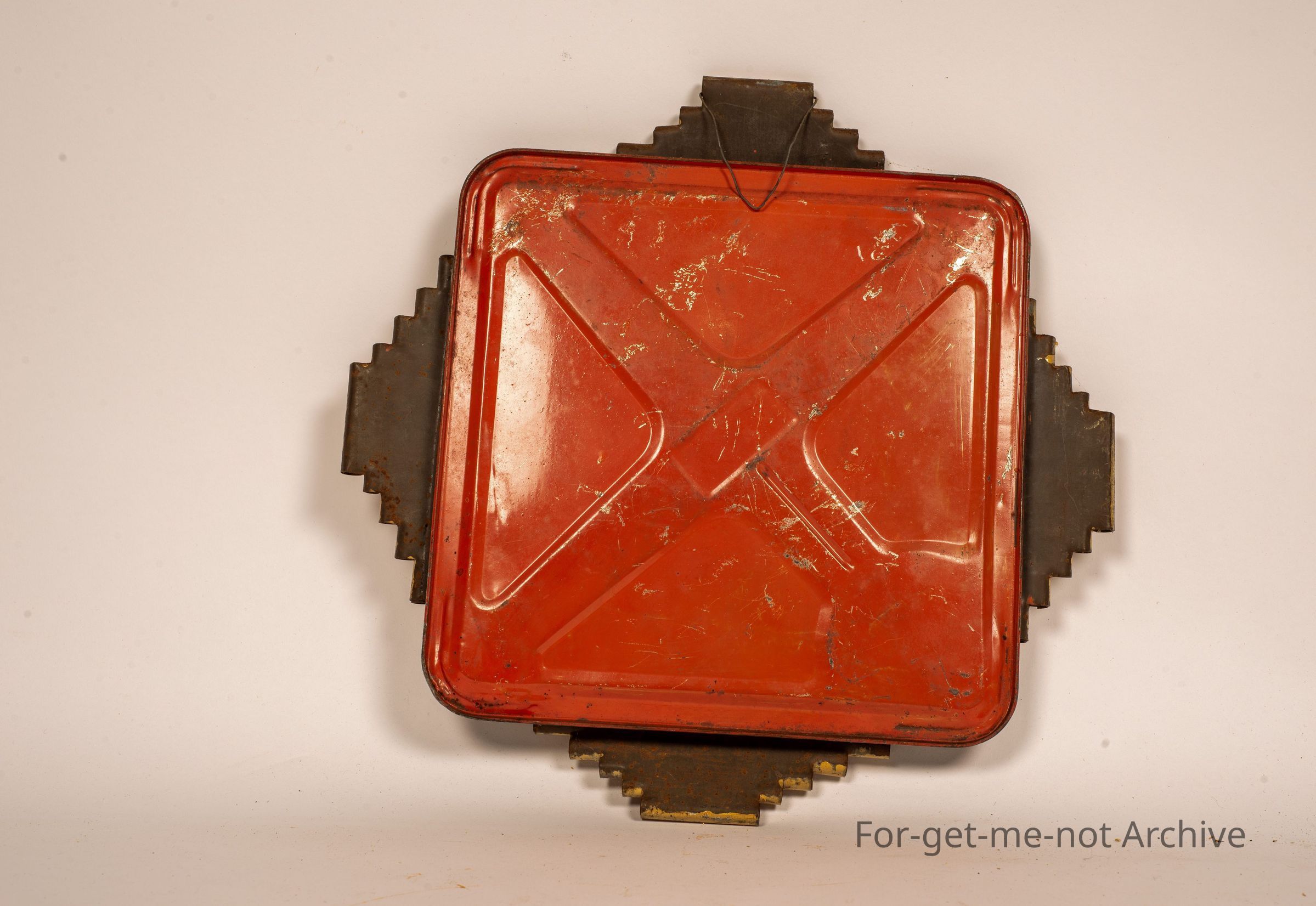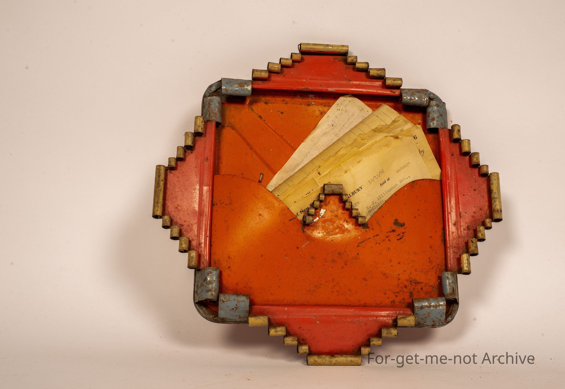 This is, a tinware bill holder constructed from the base of a kerosene tin. A very decorative item, being colourfully painted. This is typical from the Depression era.
