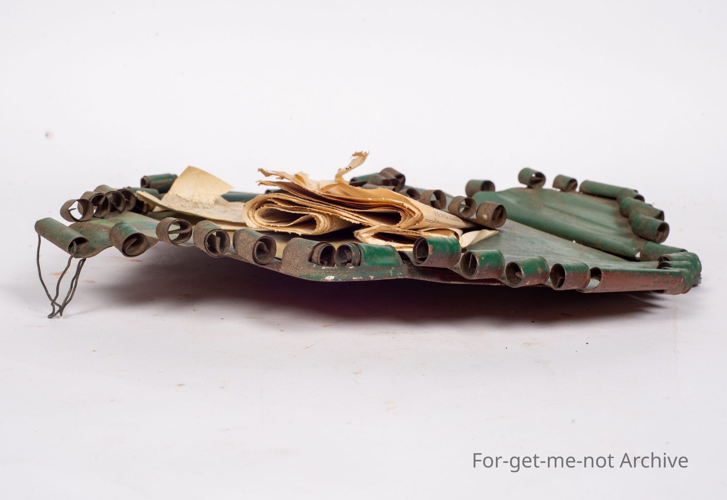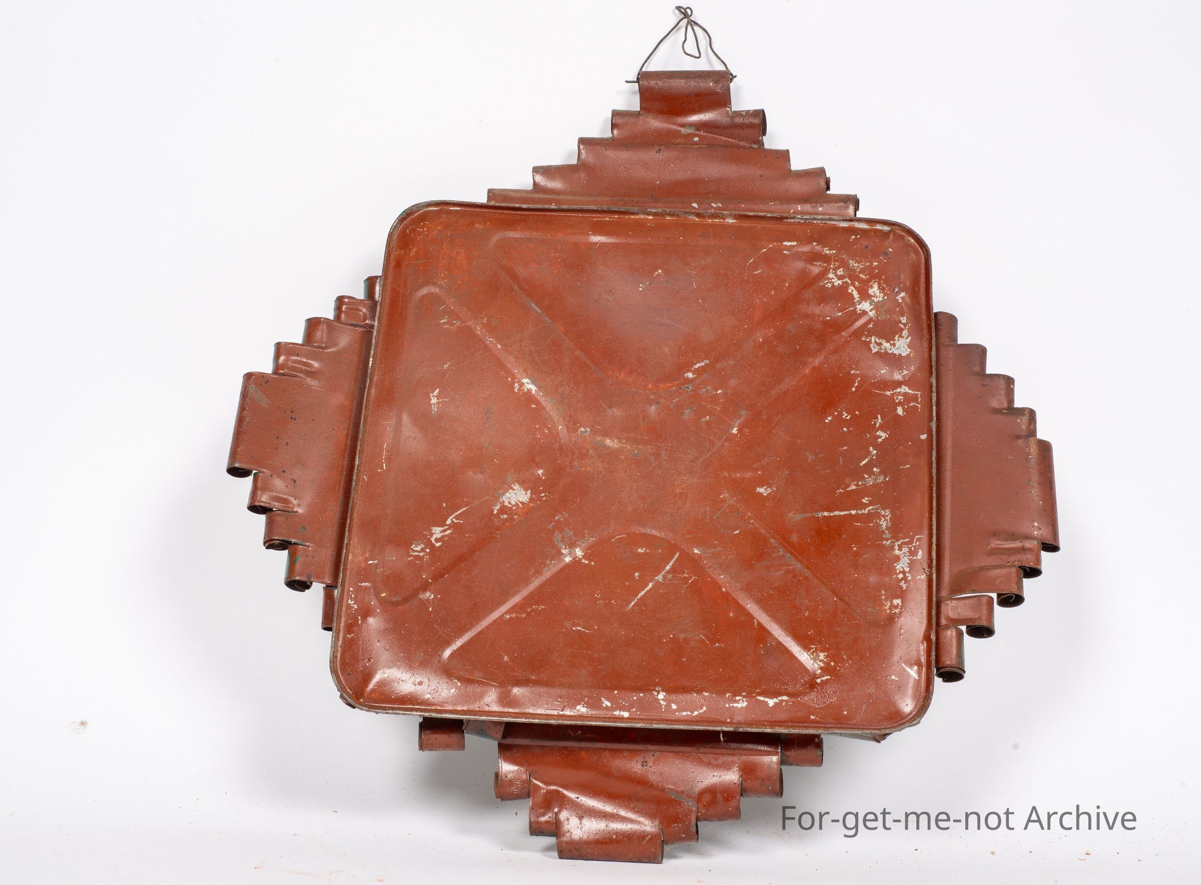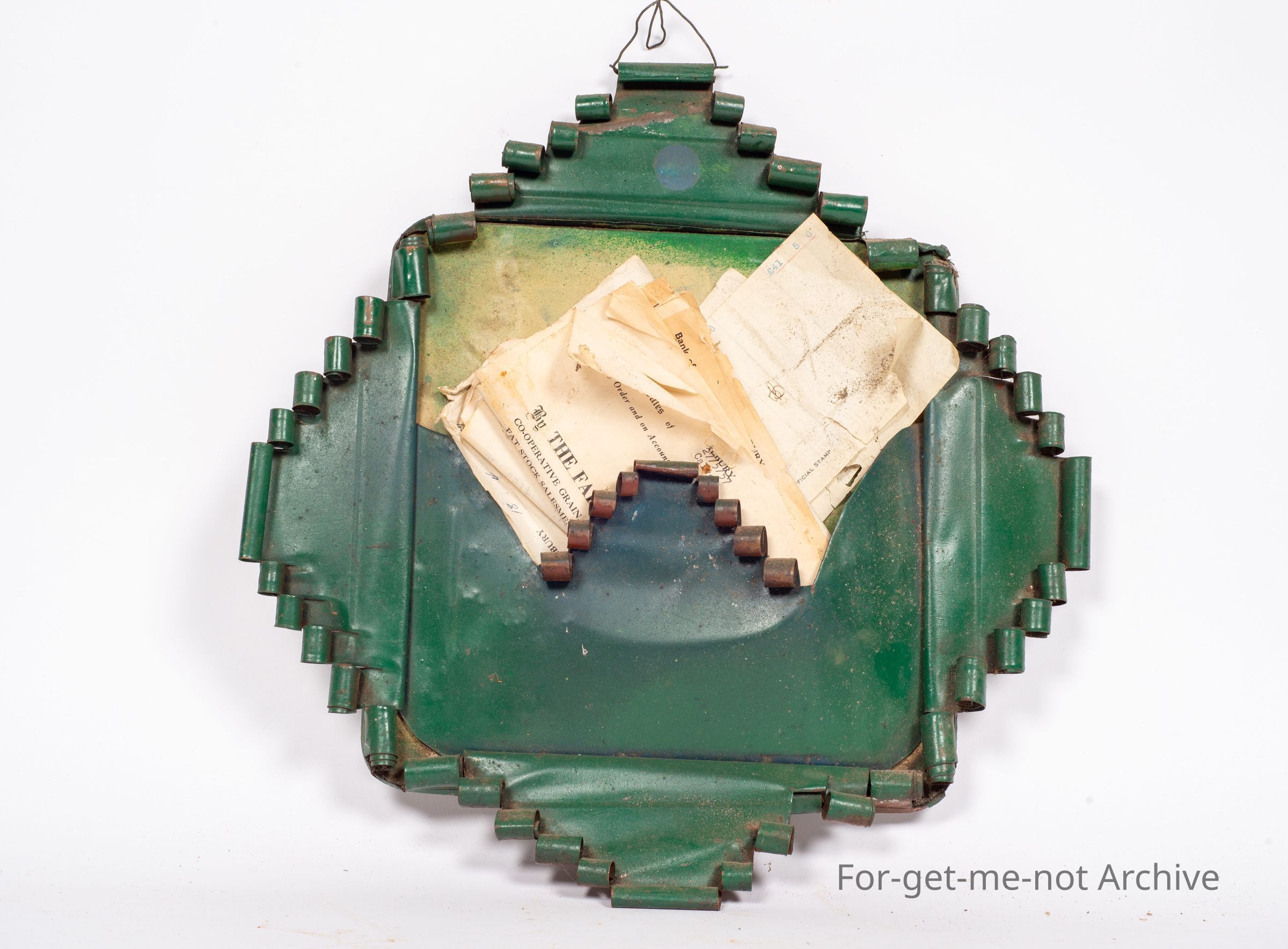 Is another decorative bill holder made from the base of a Kerosene Tin. This one is quite ornate. Painted in green with old bills, from various businesses, tucked into it. These are quite hard to find and lovely pieces from the depression.Collection