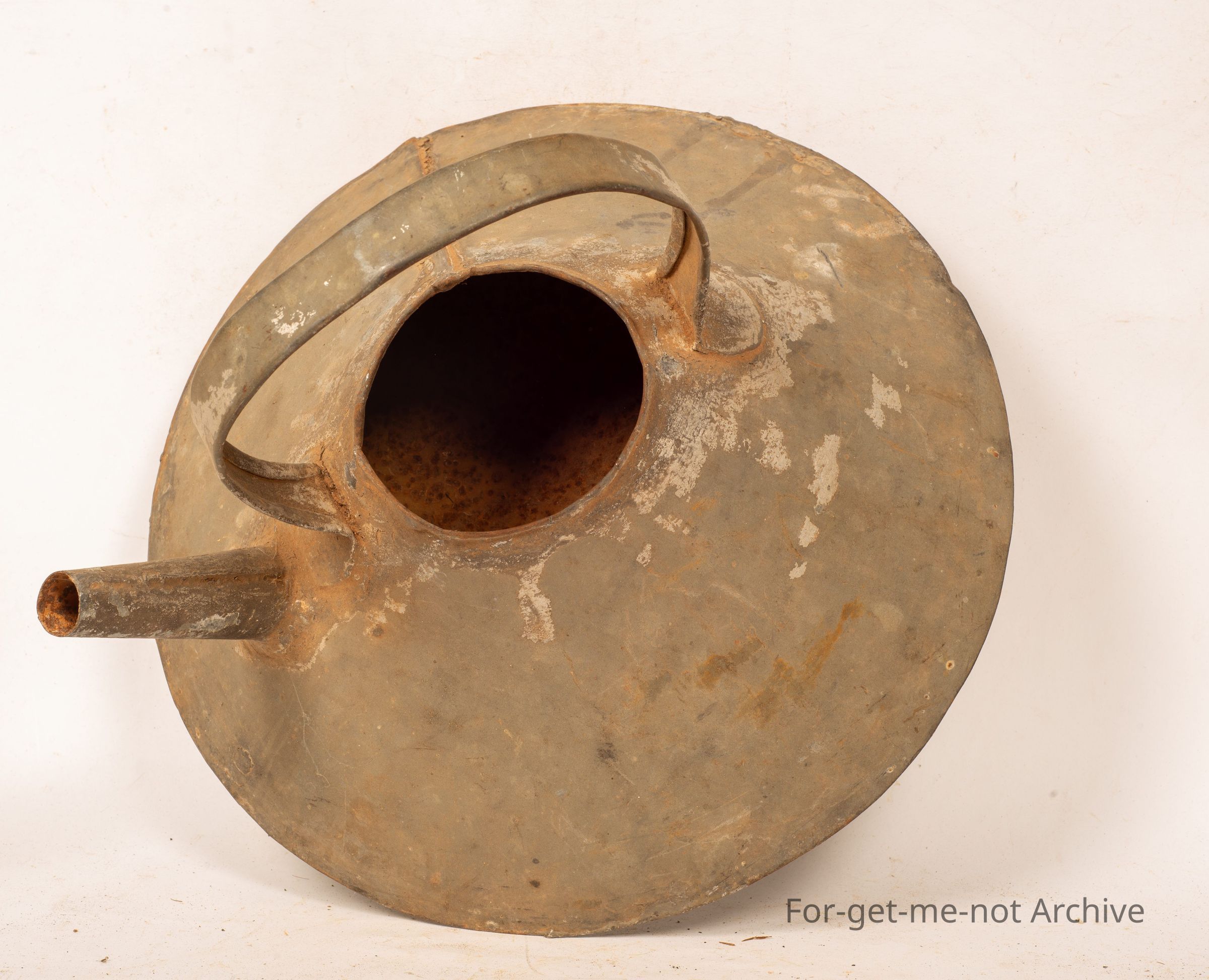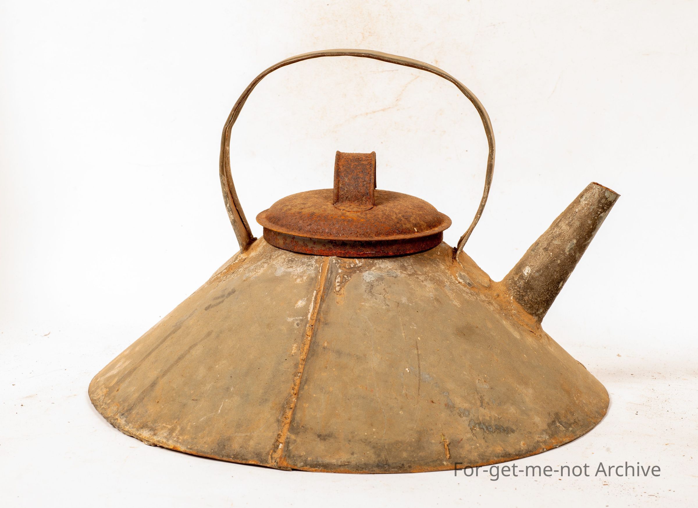 This is another wonderful piece of, improvisation and ingenuity. This kettle has a base roughly 10 inches across. Not a large capacity water, but it would have been very quick to boil because of the area that sits on top of the stove or the fire. Tin handle, tin lid, let, lid with a tin spout. Lovely piece,Collection