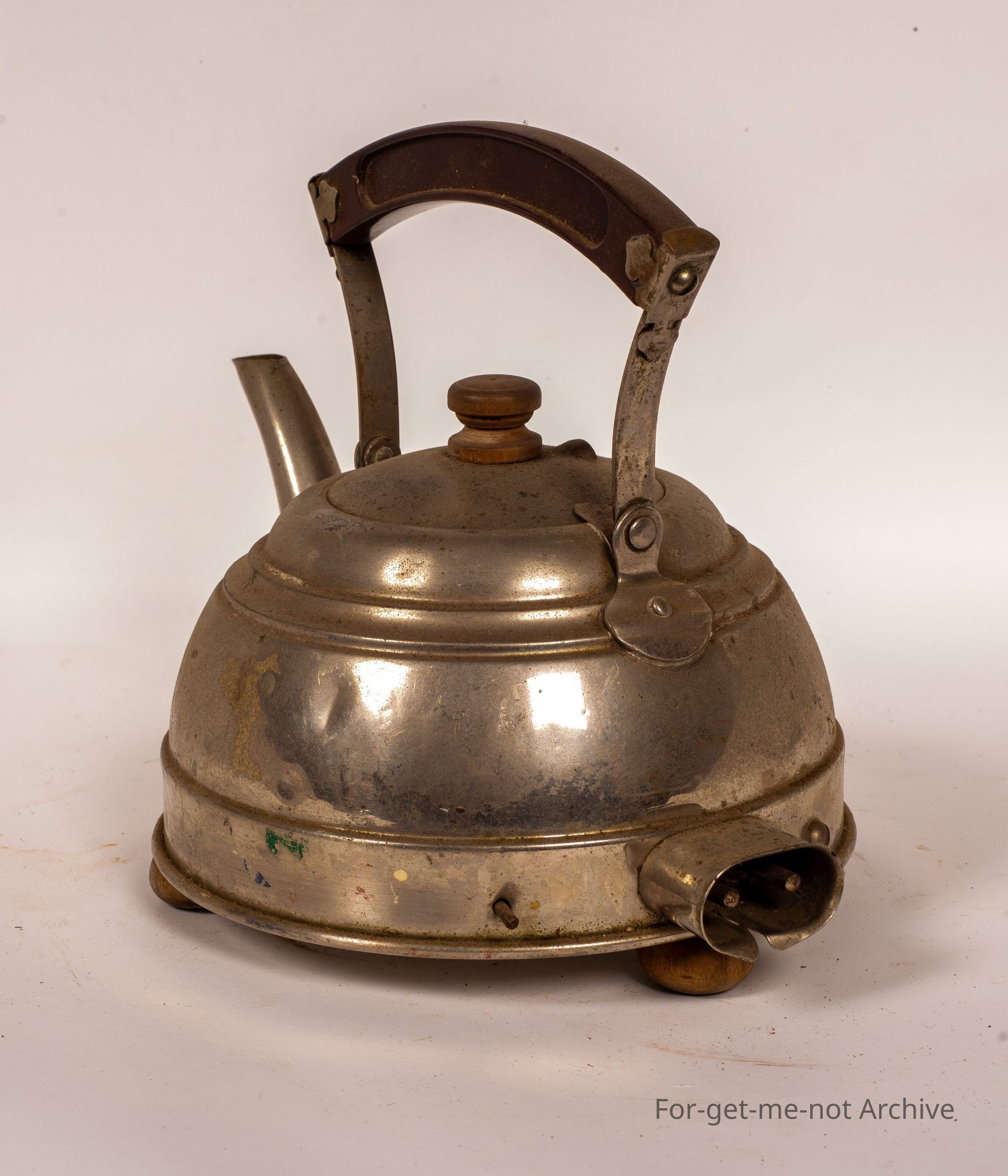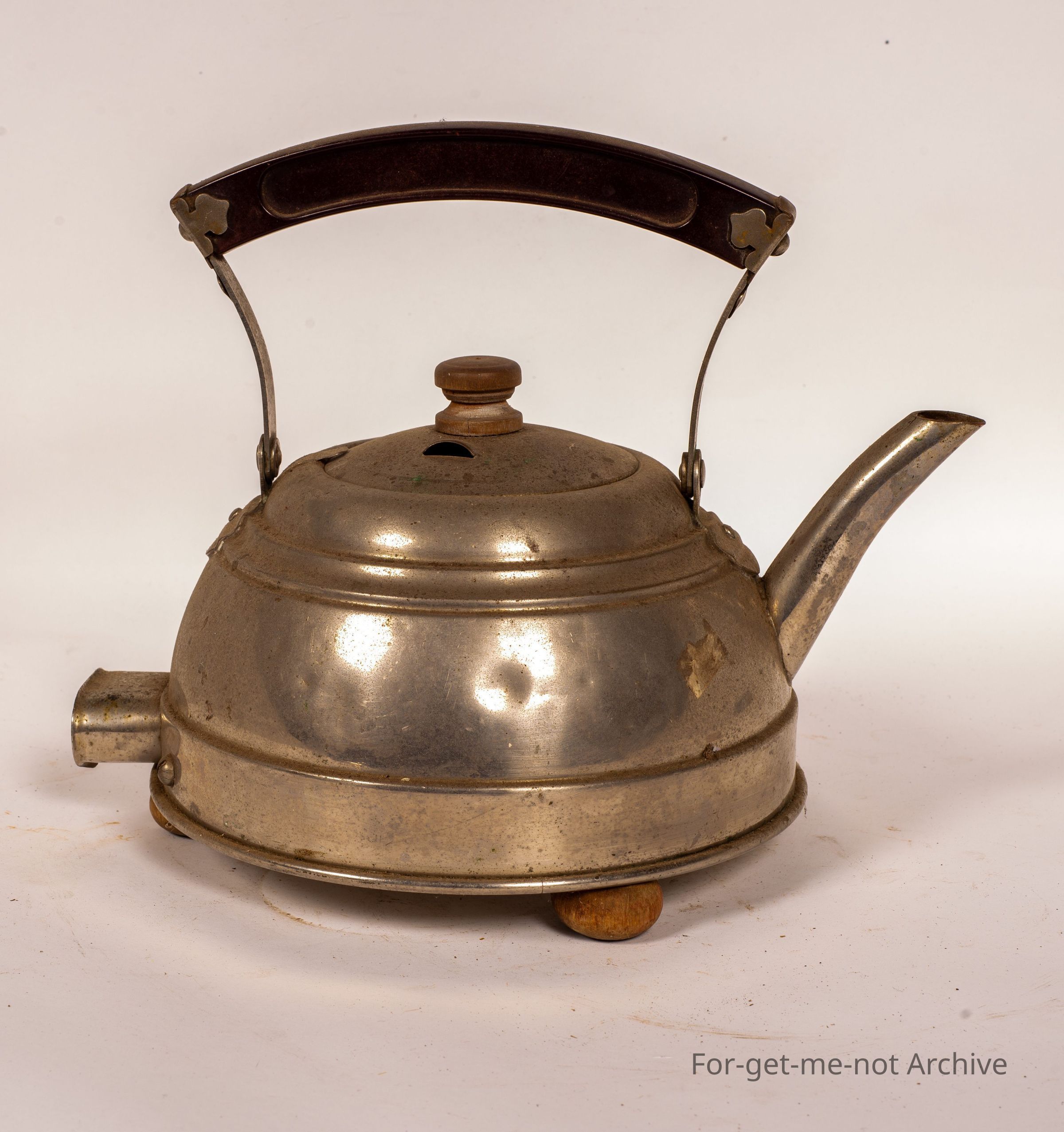 An electric metal jug with a, bakelite handle. This is in reasonable condition. It will probably polish up okay. 3 little stumpy wooden legs and the usual, plug for the electric cord at the base.Collection