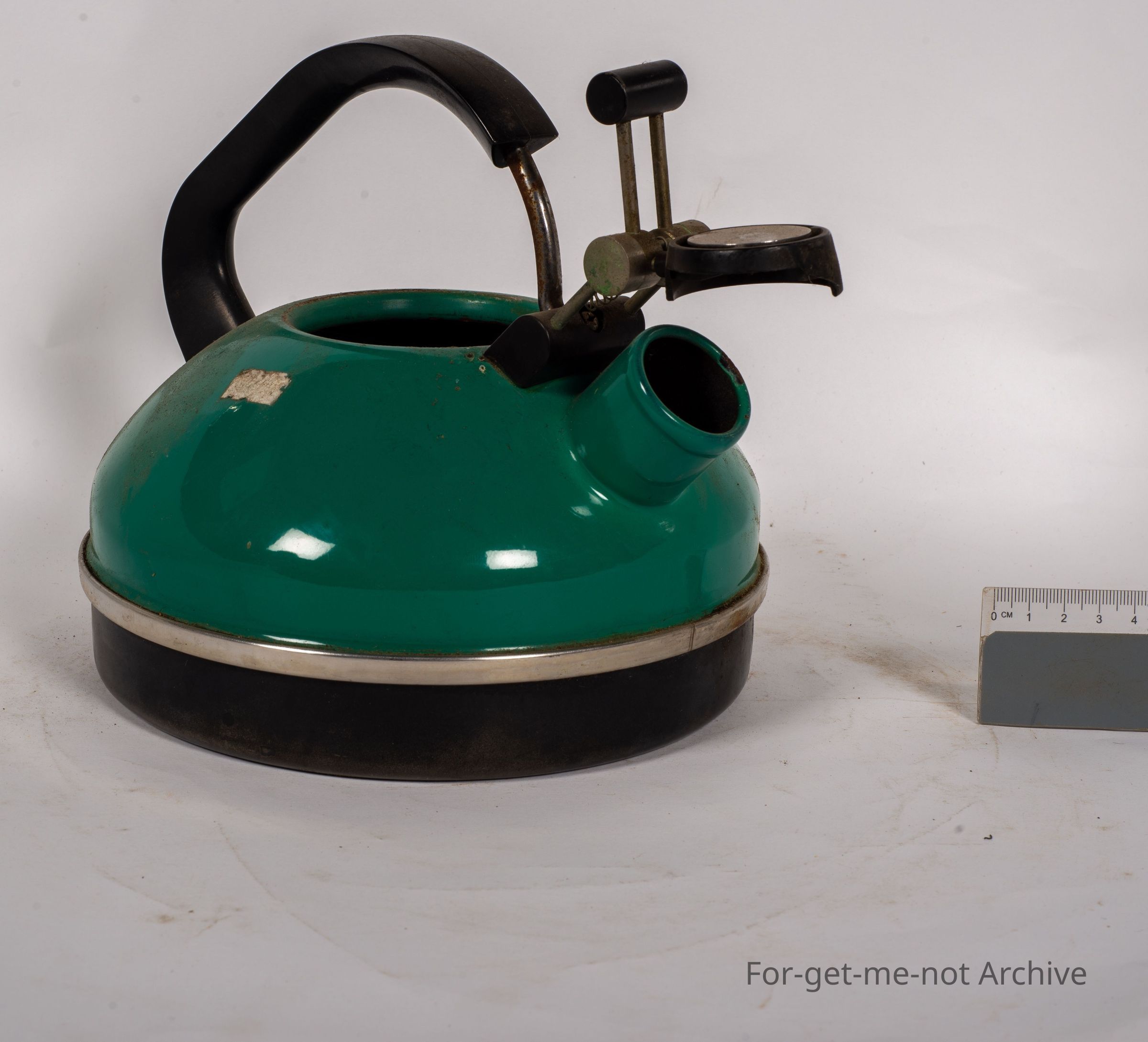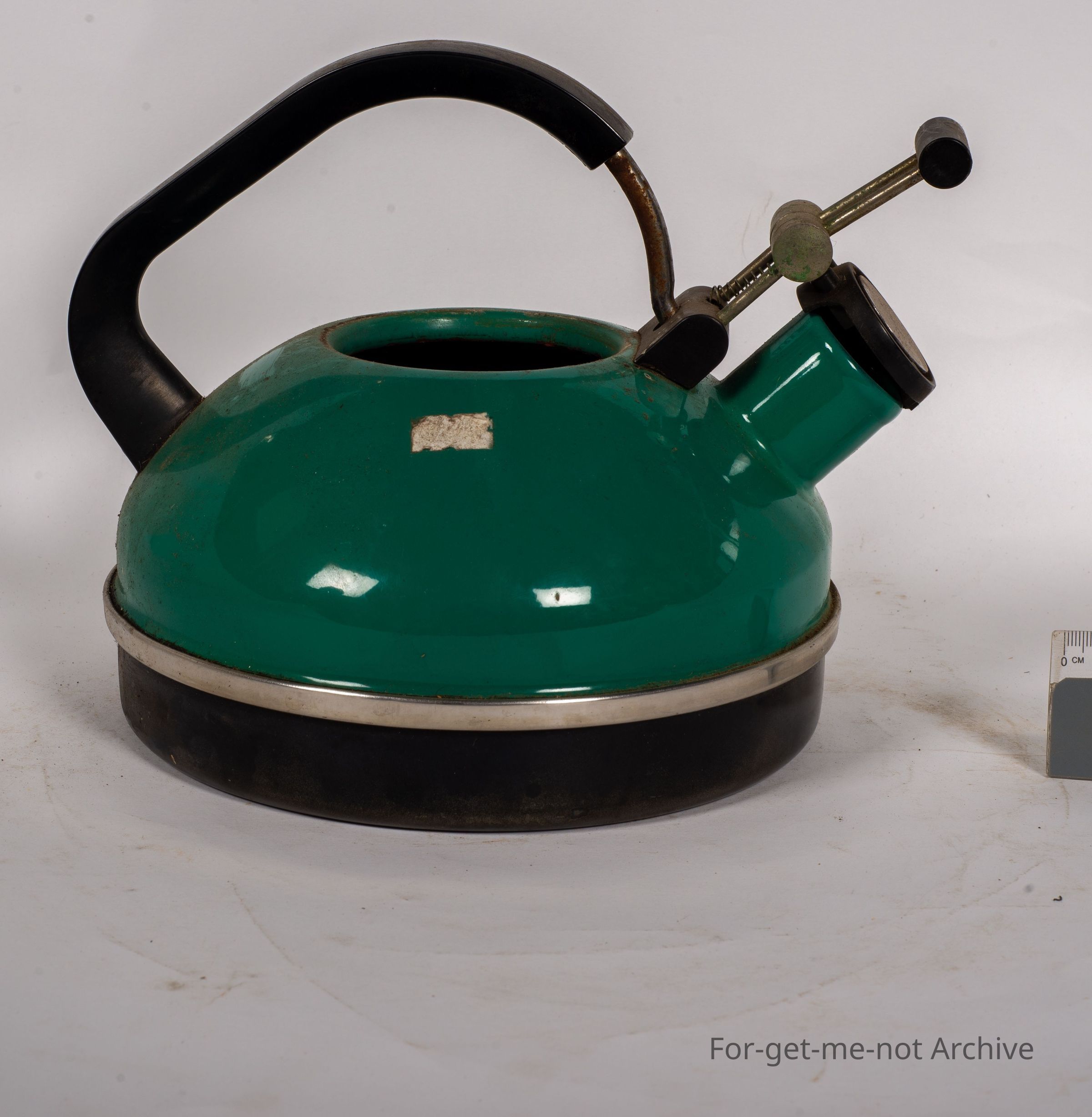 An enamel kettle with a clever opener for the spout which is spring operated. The lid is missing. Other than that, in pretty good condition. Bakelite handle.