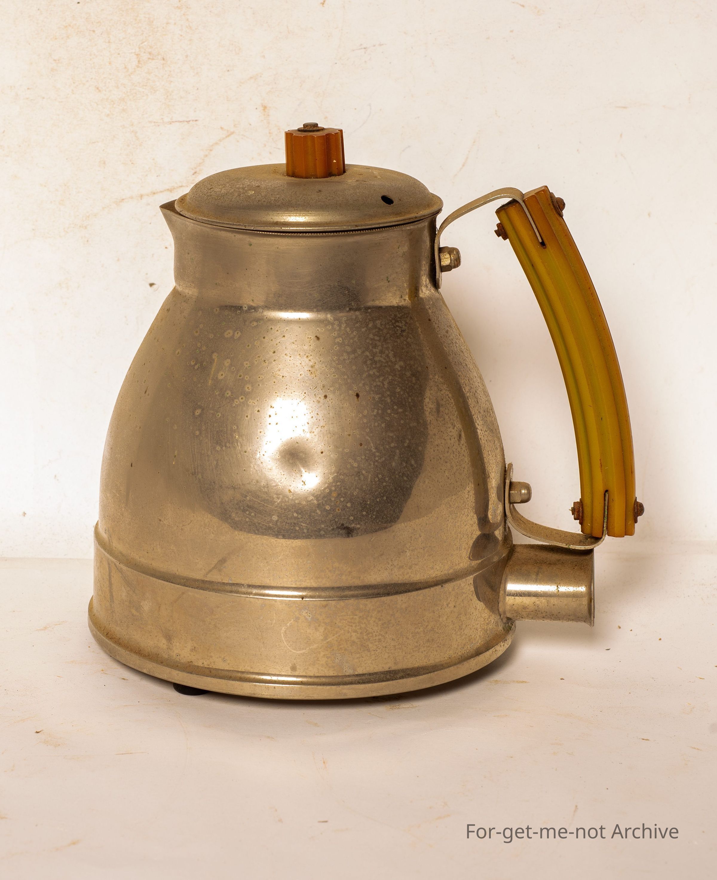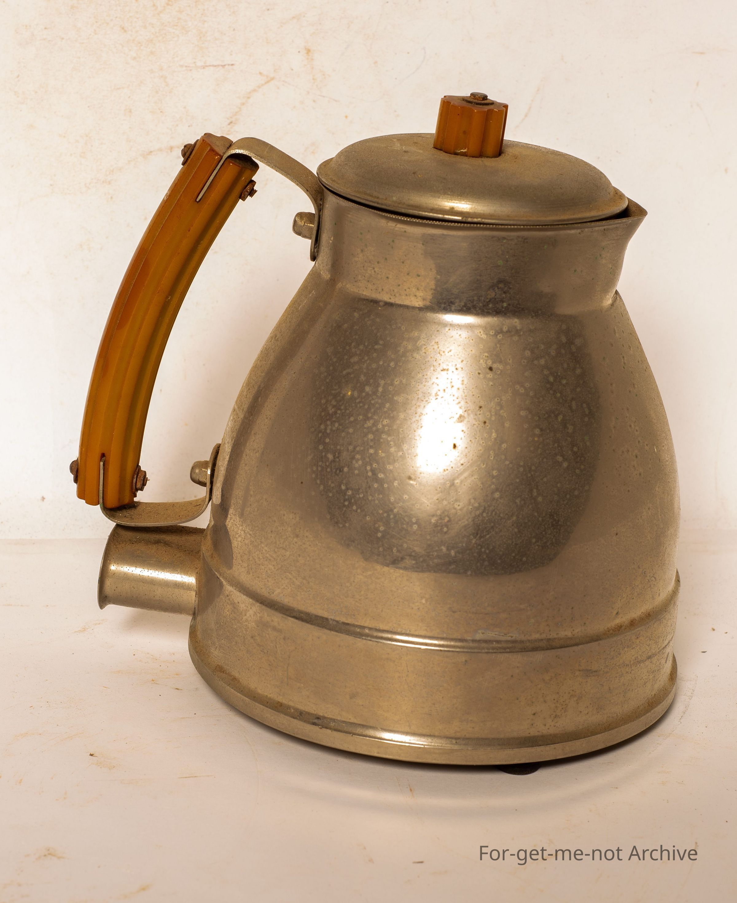 A metal electric kettle. this is an Australian piece from Brevex Manufacturing Company. Effect through this is the beautiful Fenella candle and lid, which is early bakelite.