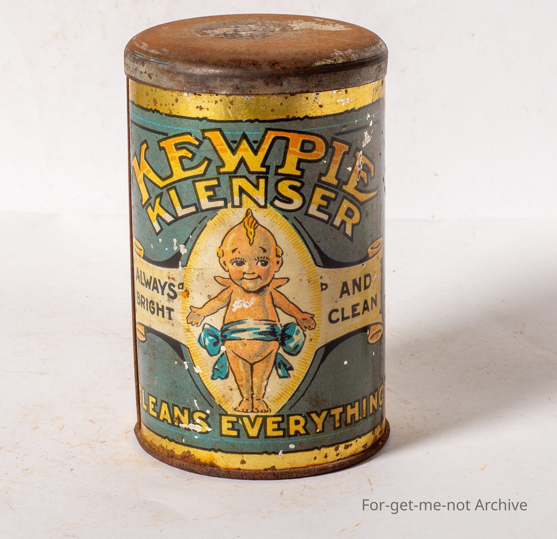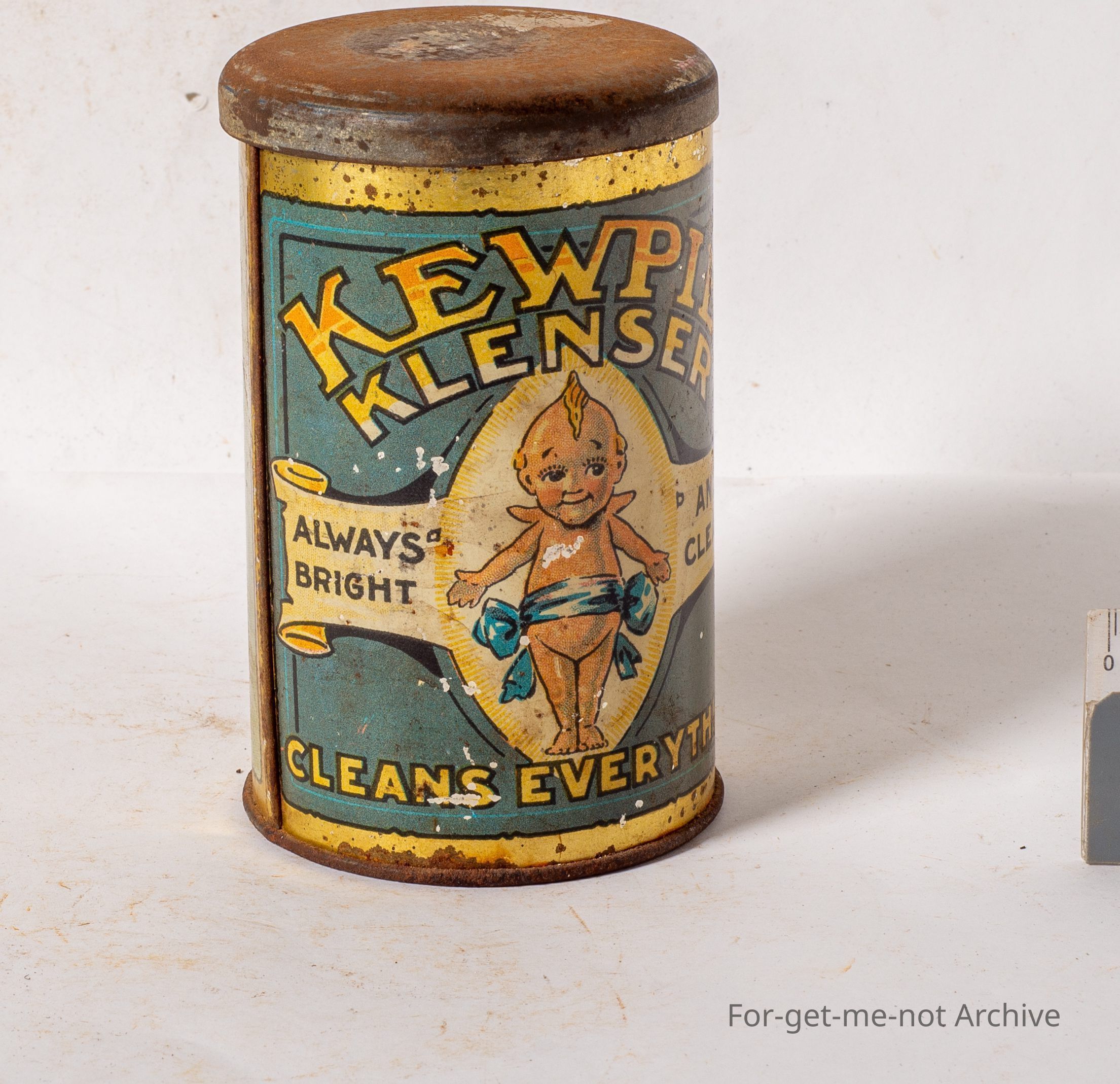 This is a lovely tin from Kewpie cleanser, with the Kewpie image on the front. Cleans everything. This is a South Australian Tin, head office 10 Steamship Building, Currie Street, Adelaide. This is quite an unusual tin.Collection