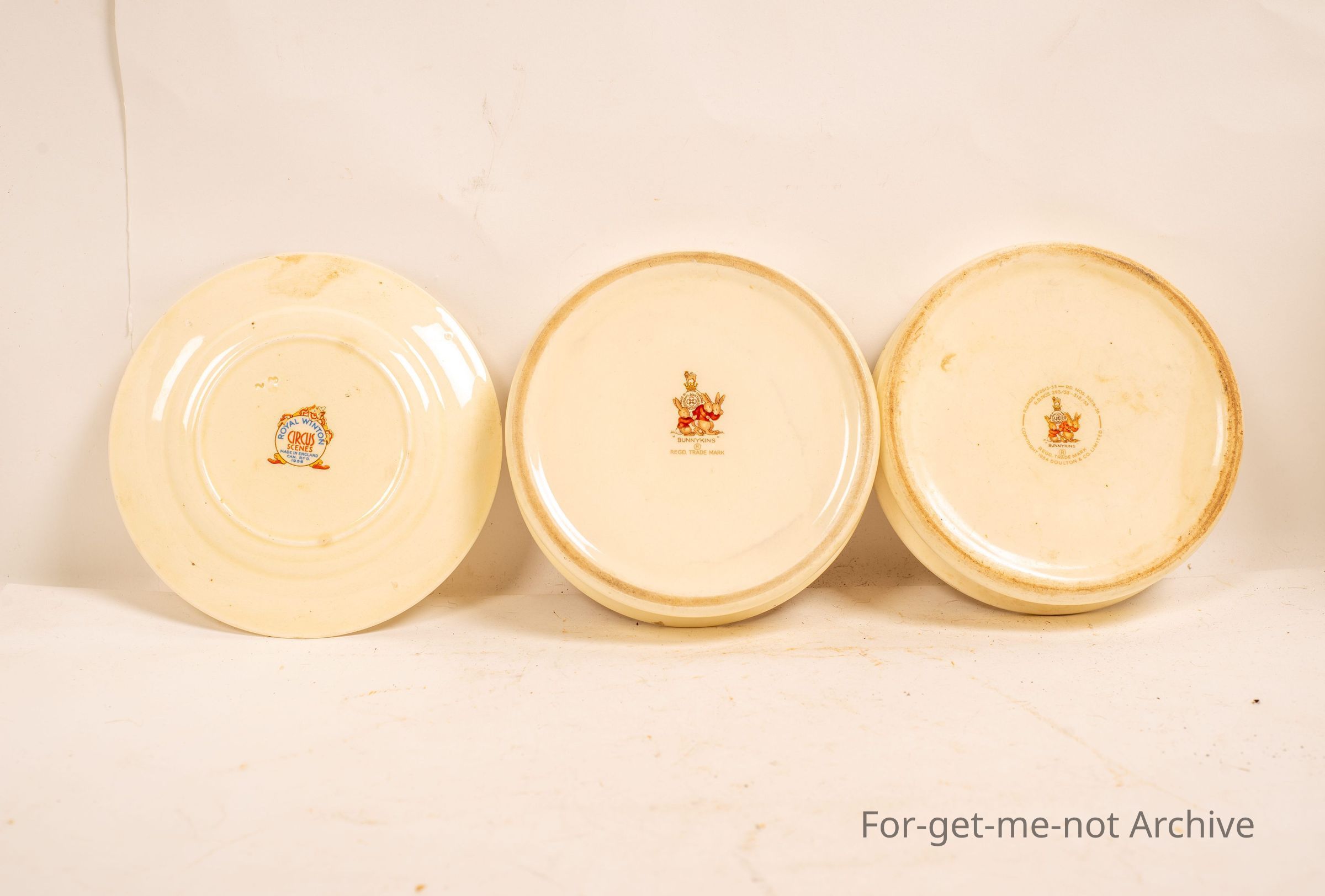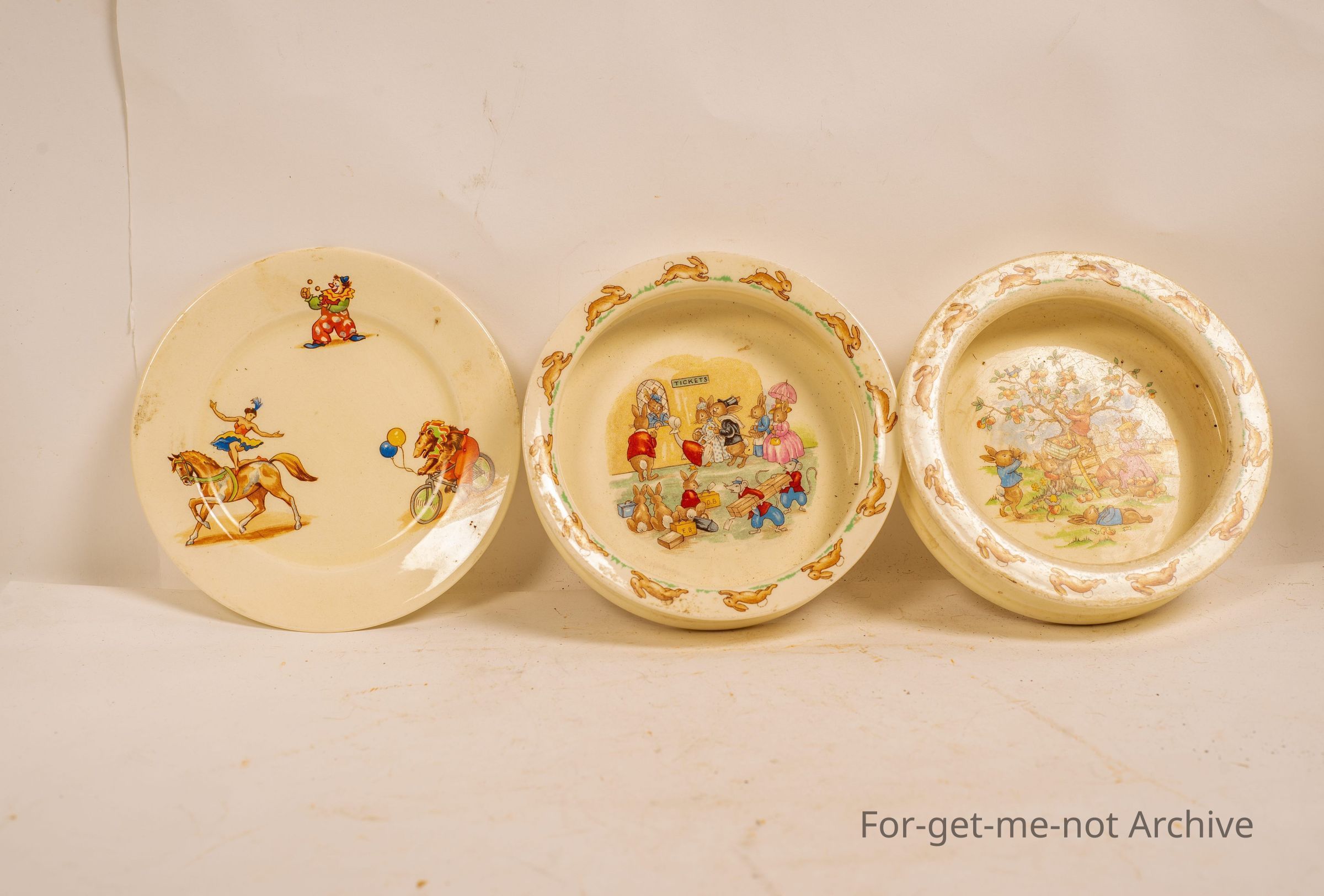 are 3 kids plates of the Bunnican series. 1 with circus figures, the other 2 with nursery rhymes with rabbits surrounding the outsides. This one's Circus Royal Winton Circus on the circus plate, the group.Collection