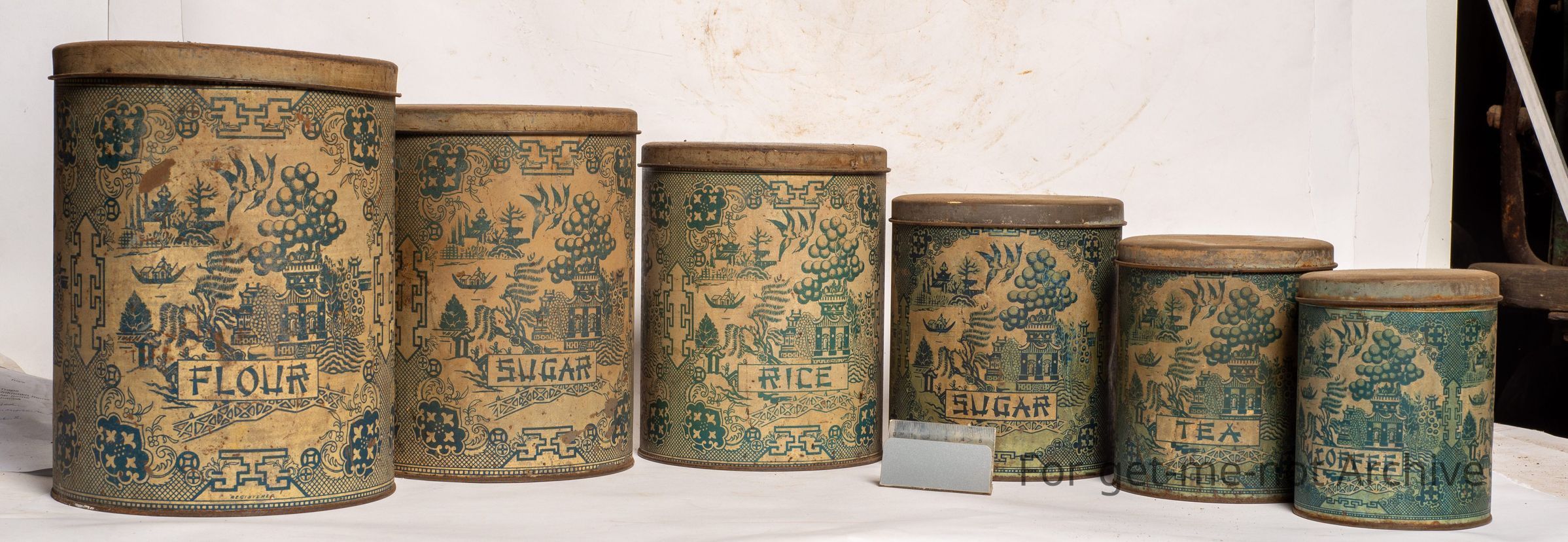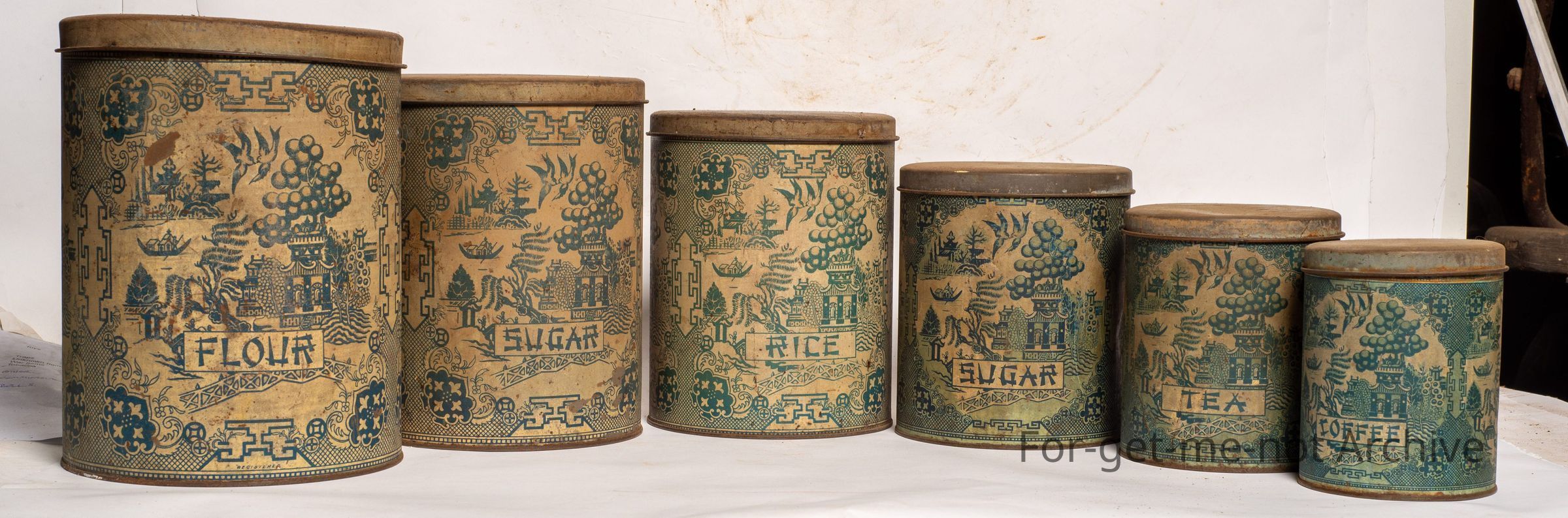This is a group, a full, display group of Willow pattern, canisters of Flour, Sugar, Rice, Sugar, Tea, Coffee made by Willow,