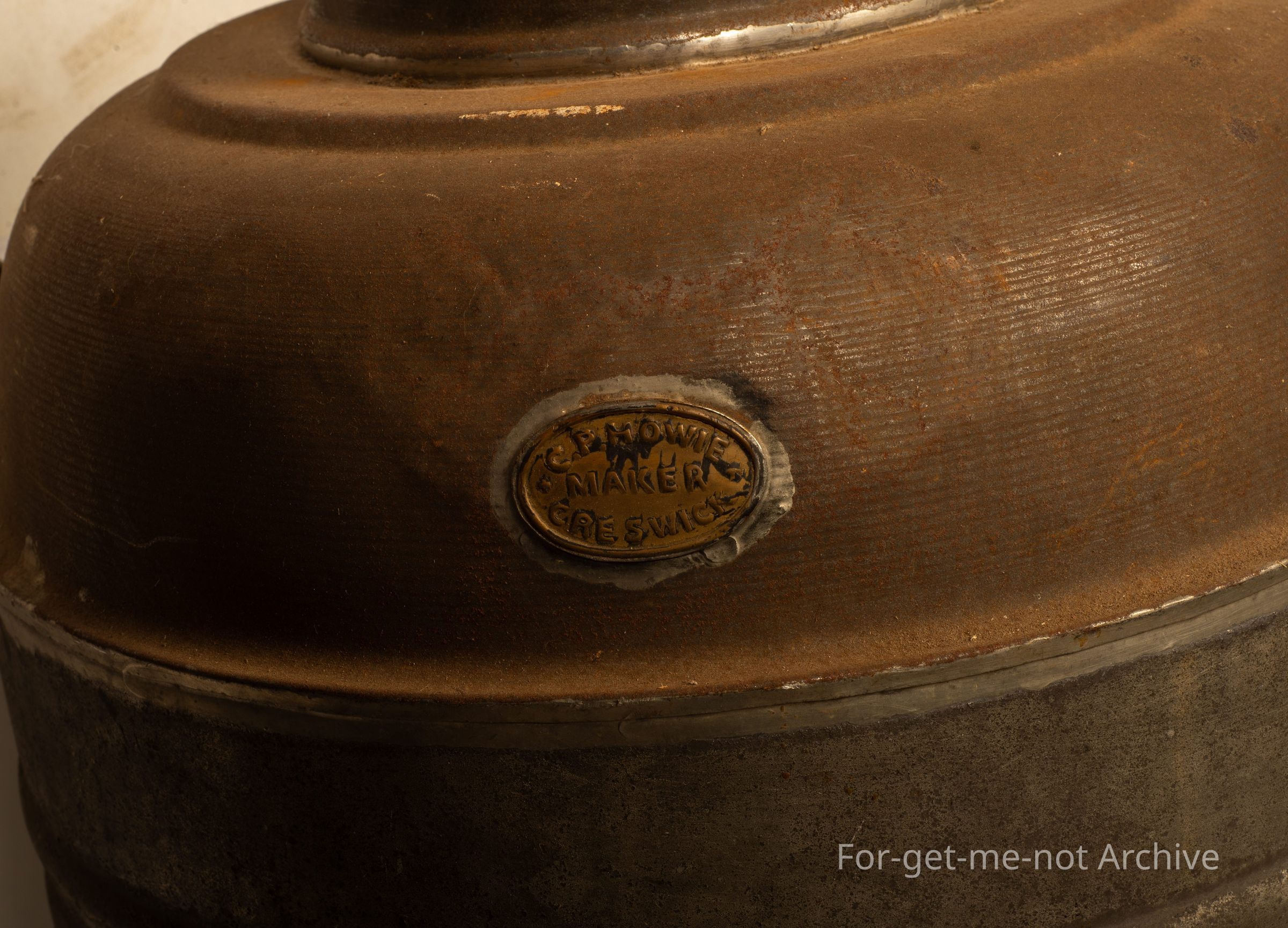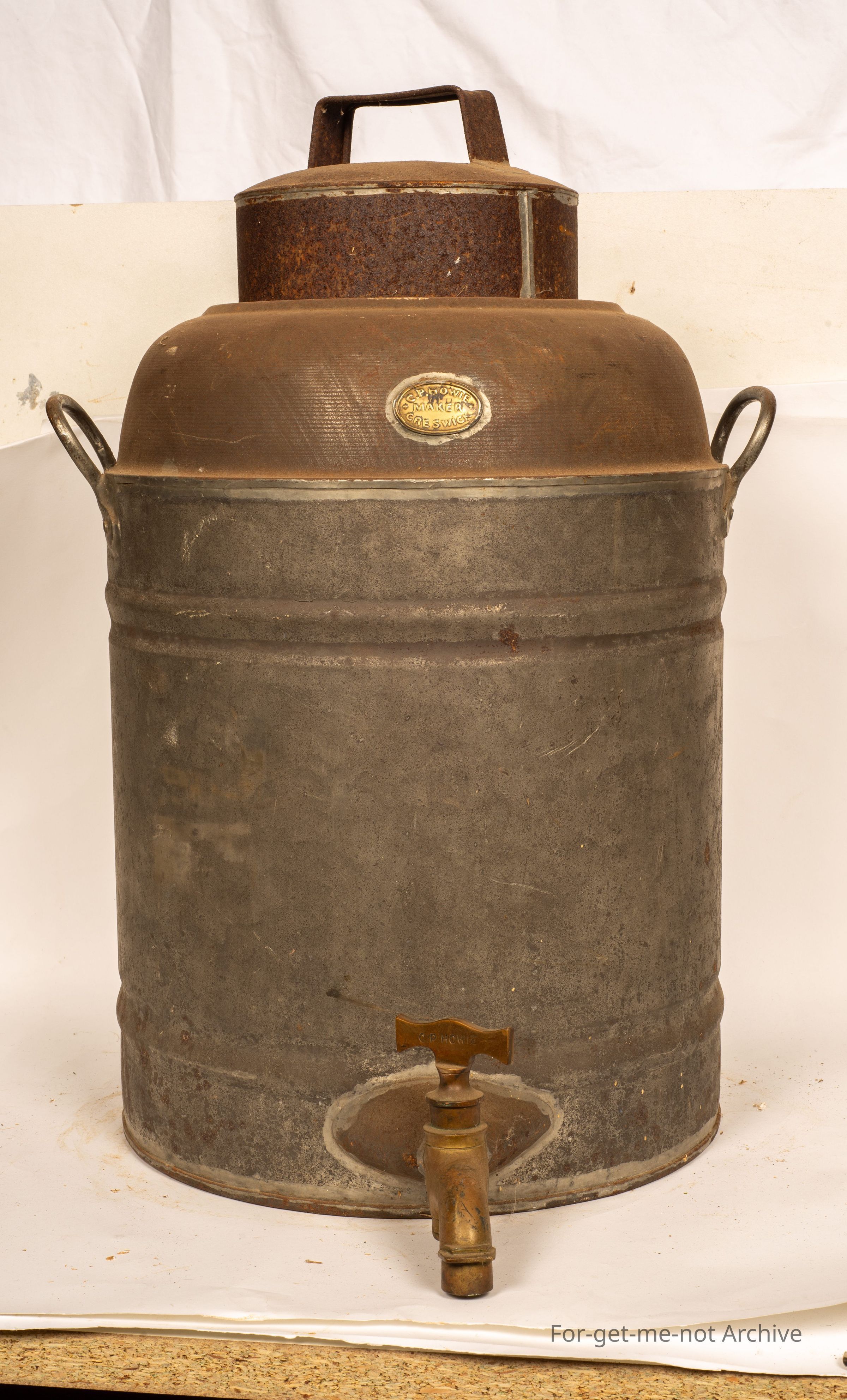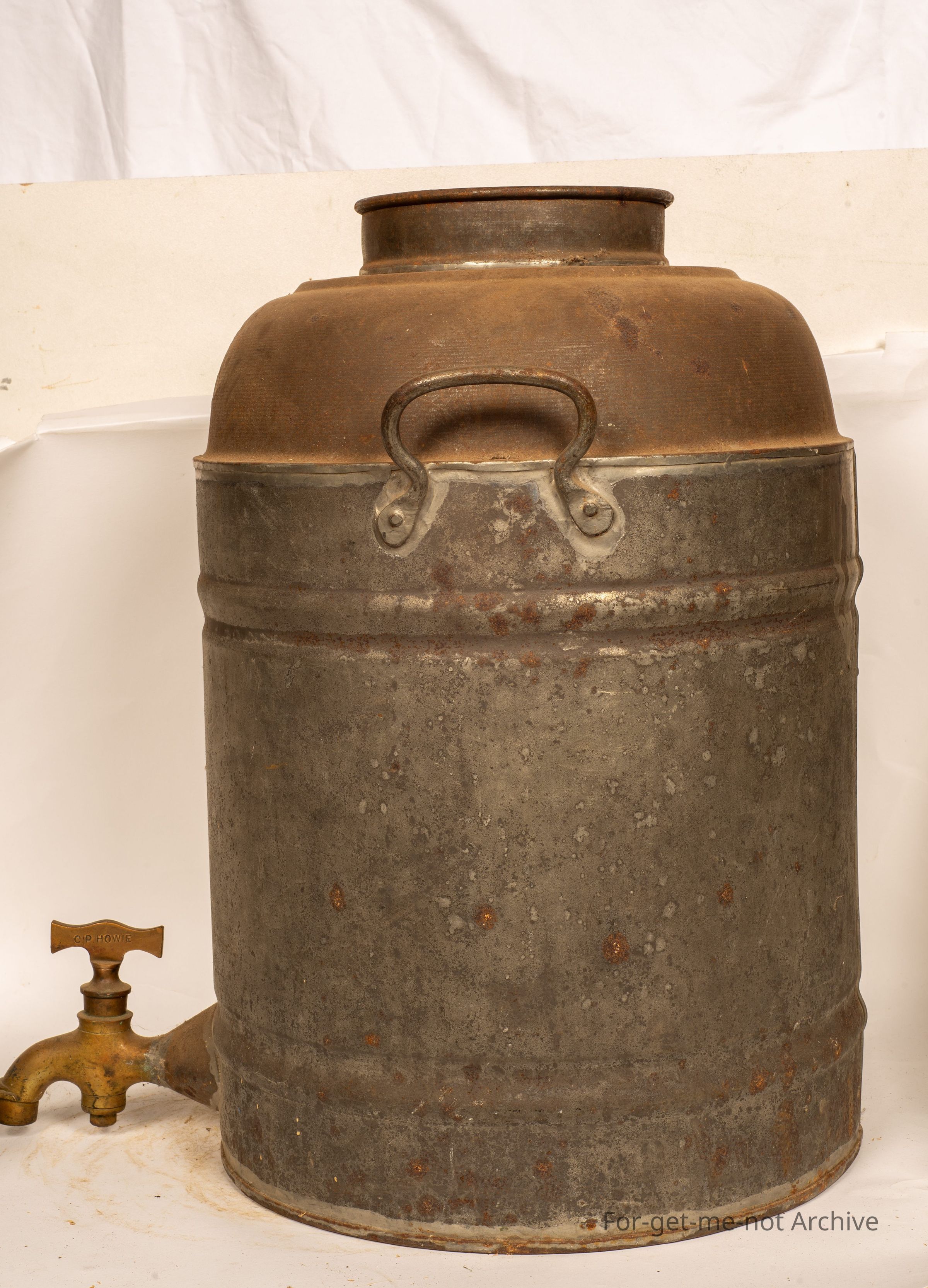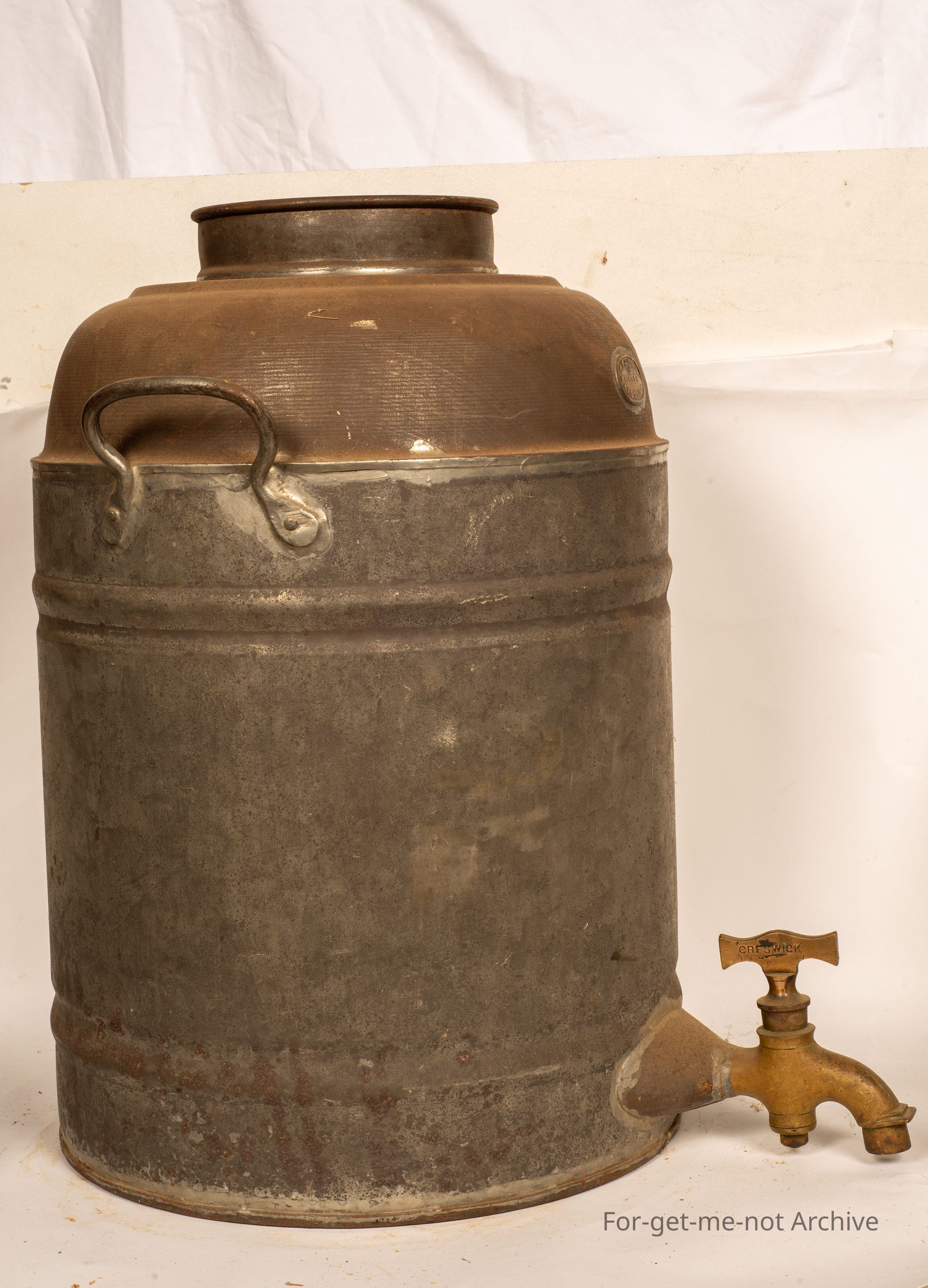 We have a return to kitchen area item. This is a large tin, like I would have found a piece that would have been for storing work, it may be, in a kitchen. Handles on either side, a lid. This has a brass plaque of W Howie Creswick. The tap, is a beautiful brass tap with Howie Creswick stamped into the , turner on the tap as well. A wonderfully early piece,Collection