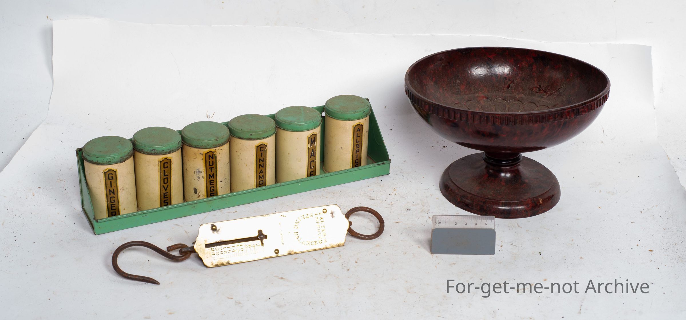 Scales, looks like a Bakelite fruit dish, a small canister set.