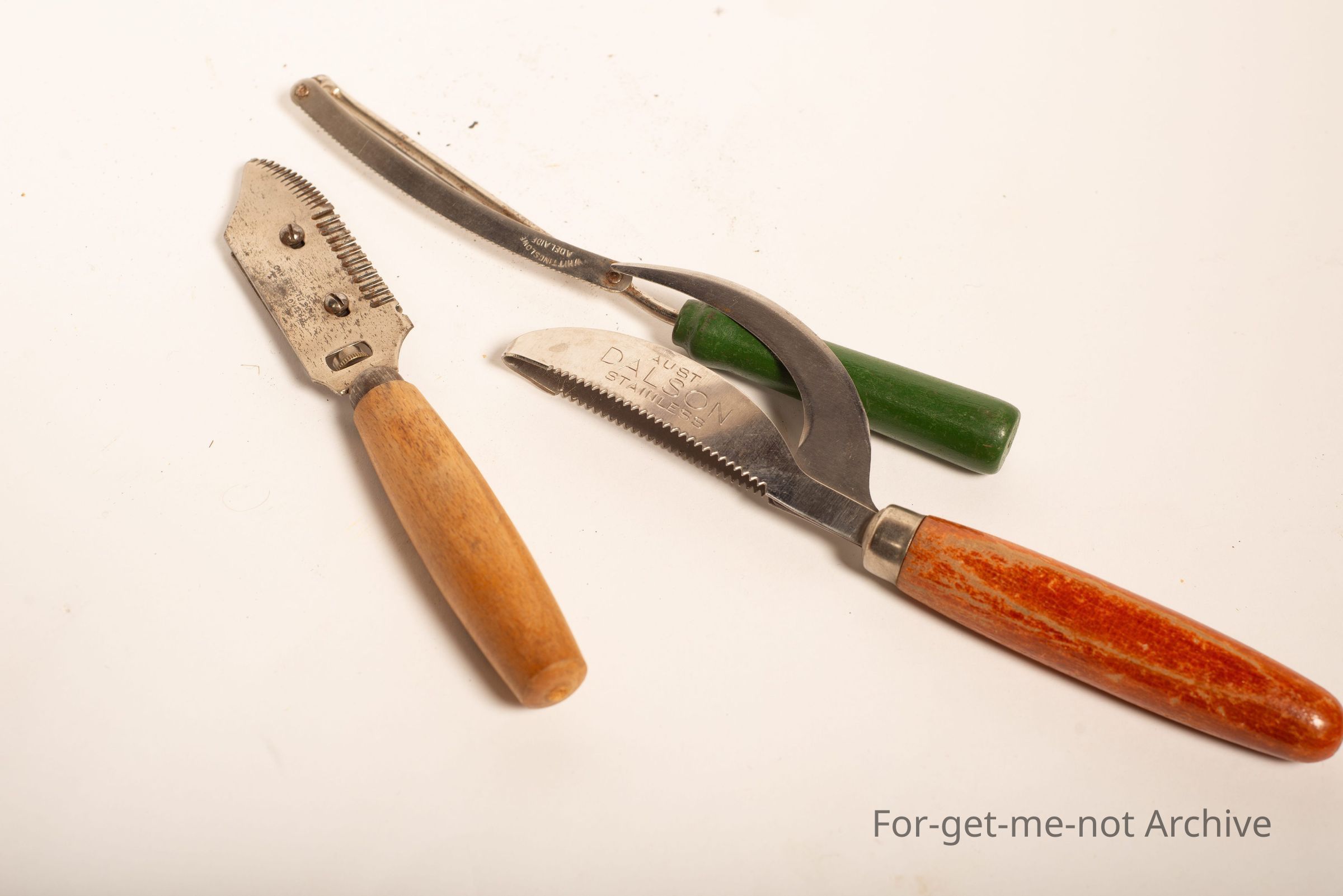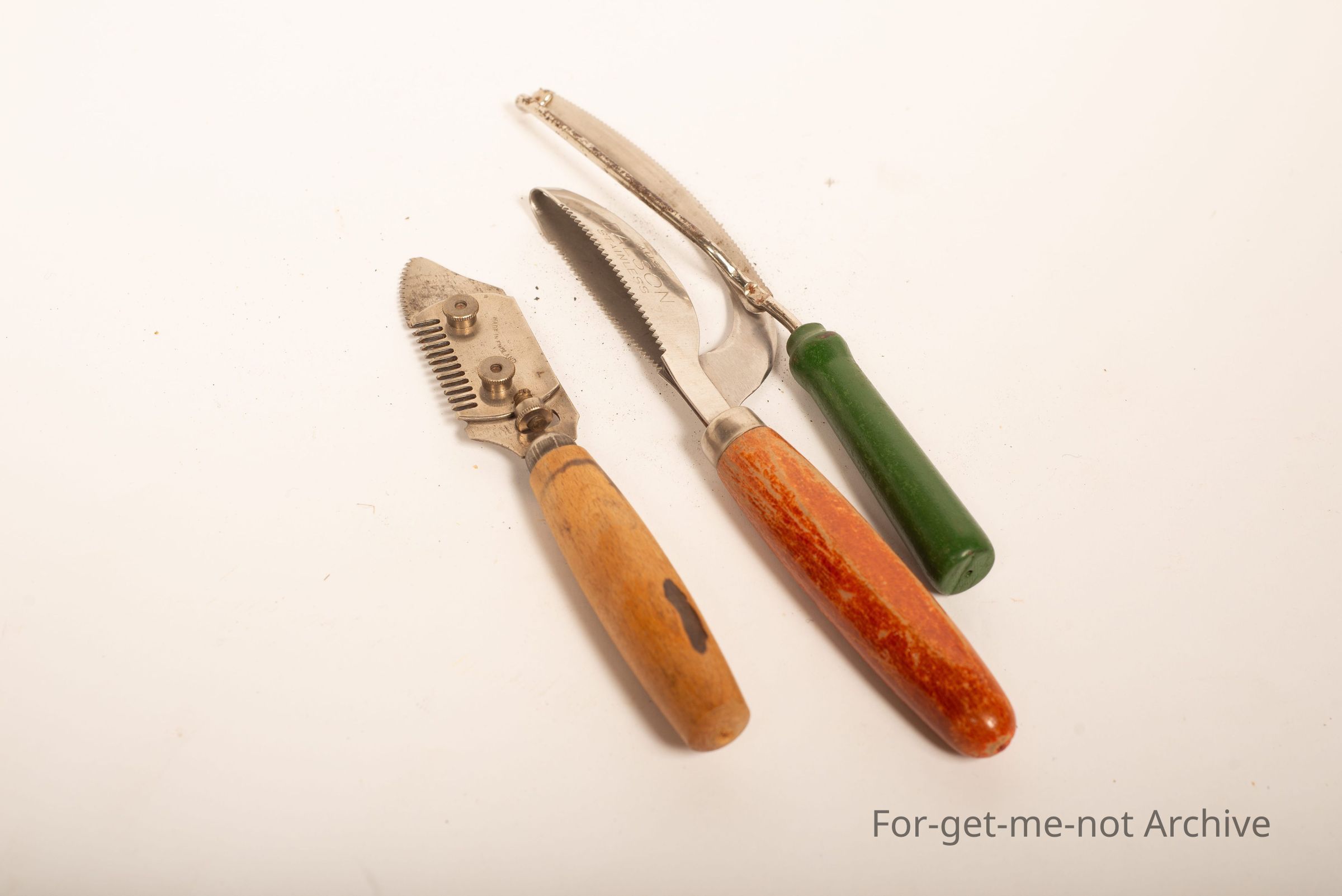 A group of 3 kitchen tools. First one, perhaps a god knows what. Second one is a slicer of some sort. 3rd one, probably a fish scaler, I would imagine. And fillet.