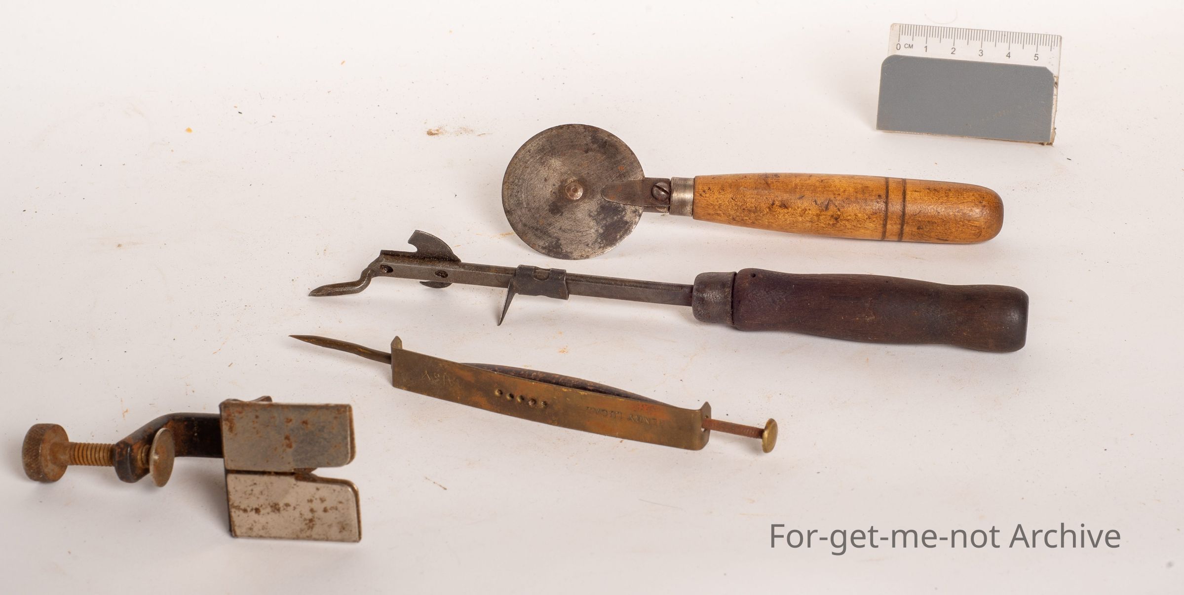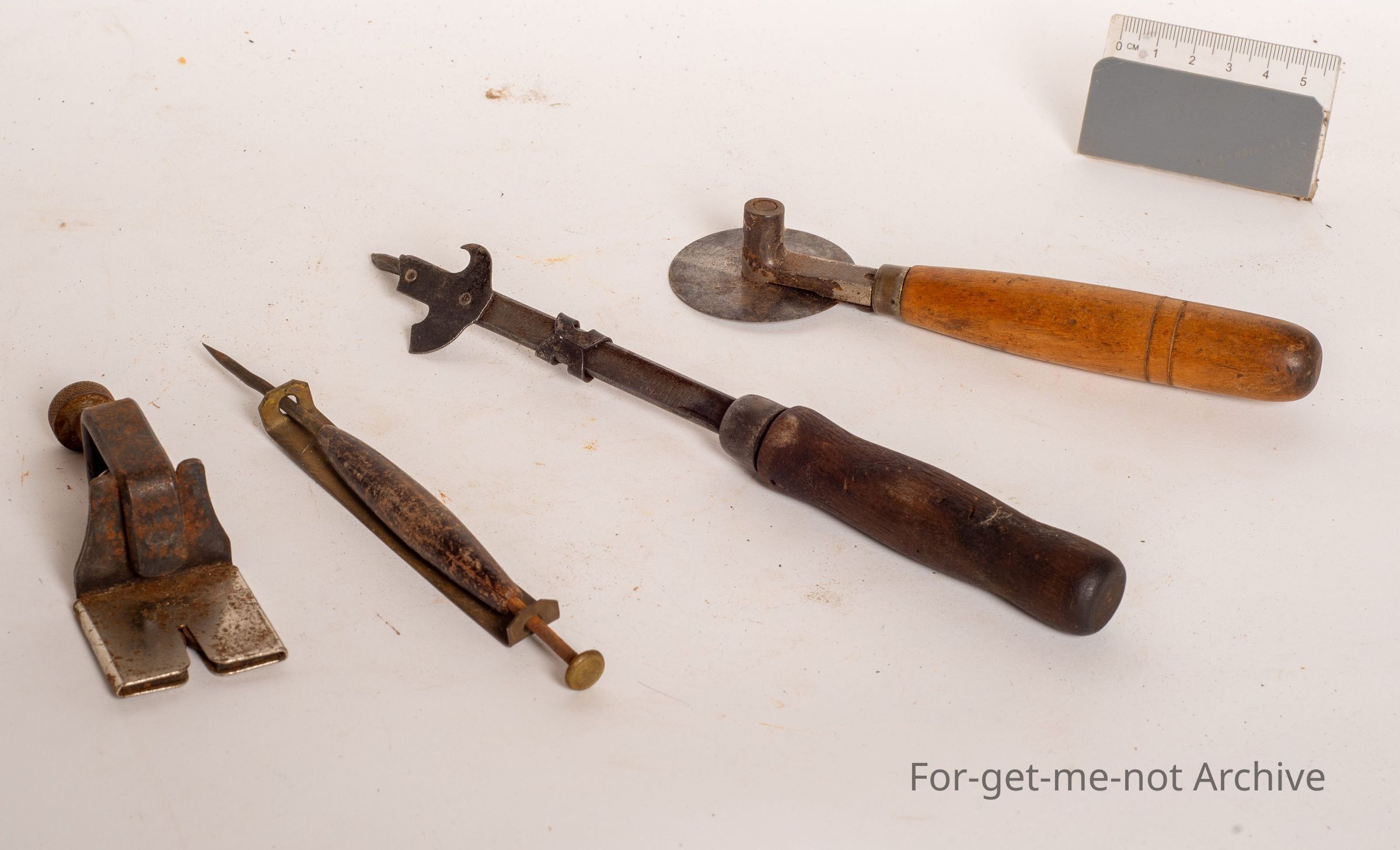 Group of 4 pieces. First one is a bladed cutter, runs in circular fashion, a tin opener, a rug stitching piece made by Daisy, stamped Henry Lucas Daisy, and then a little screw on attachment as a knife sharpener made by Whittingslow Lowe Adelaide.Collection