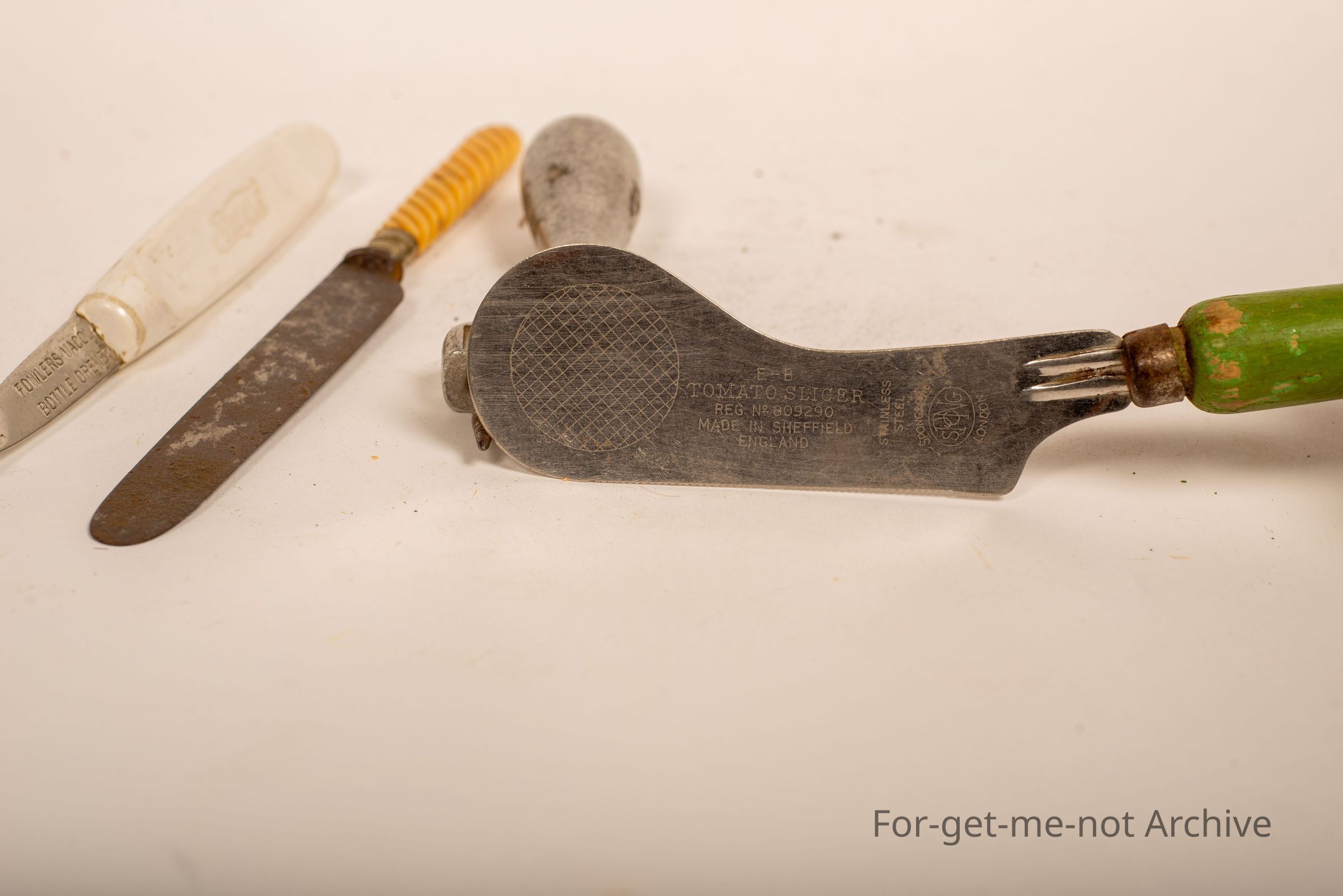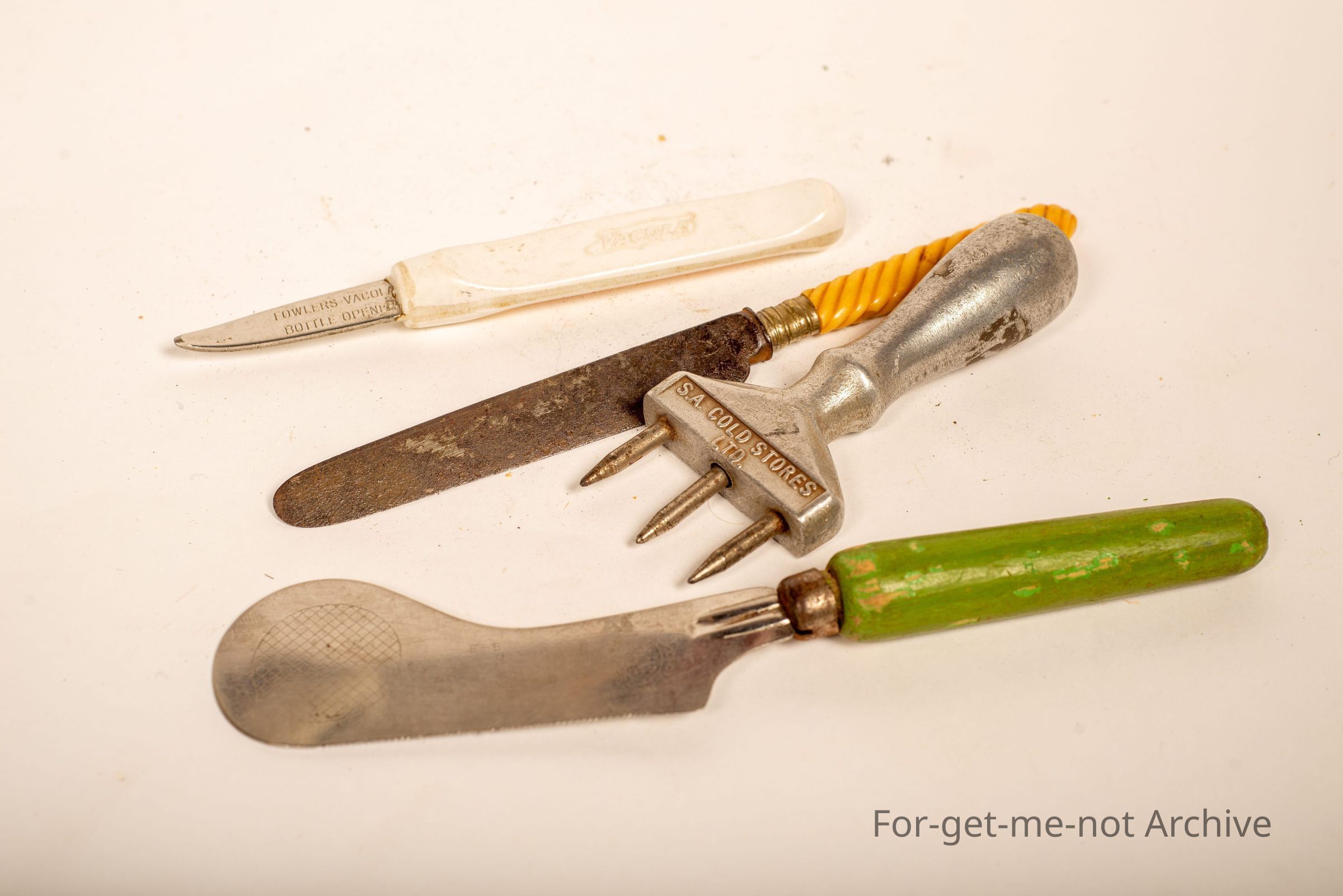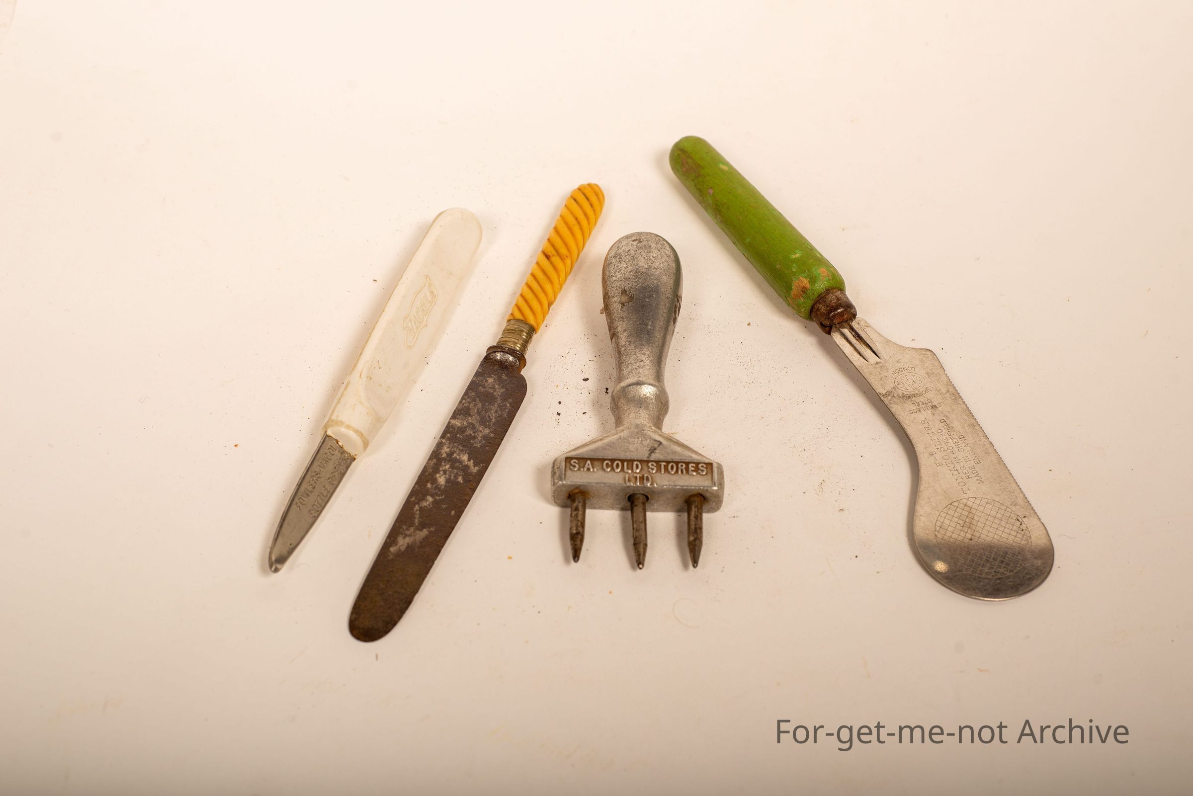 A group of 4 kitchen pieces. The first one, Fowler's for cola bottle opener. 2nd one, SA Cold Stores Ice Pick. 3rd one, just a, bread and butter knife with a barley twist handle. Number 4, tomato slicer made in England.Collection