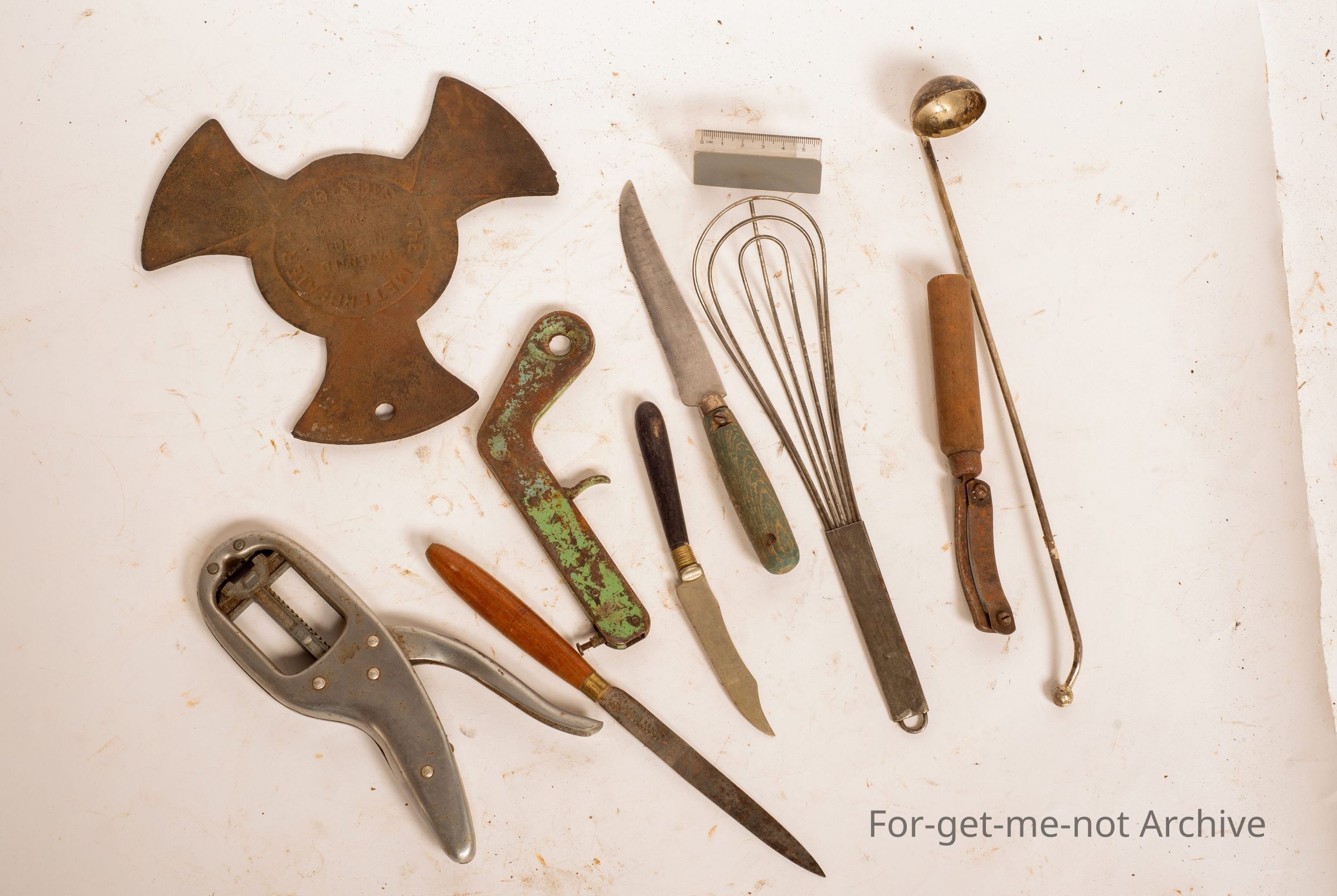 This is a group of small items all related to the kitchen. A gas saver, a nutcracker, a whisk, a few knives and a peeler.