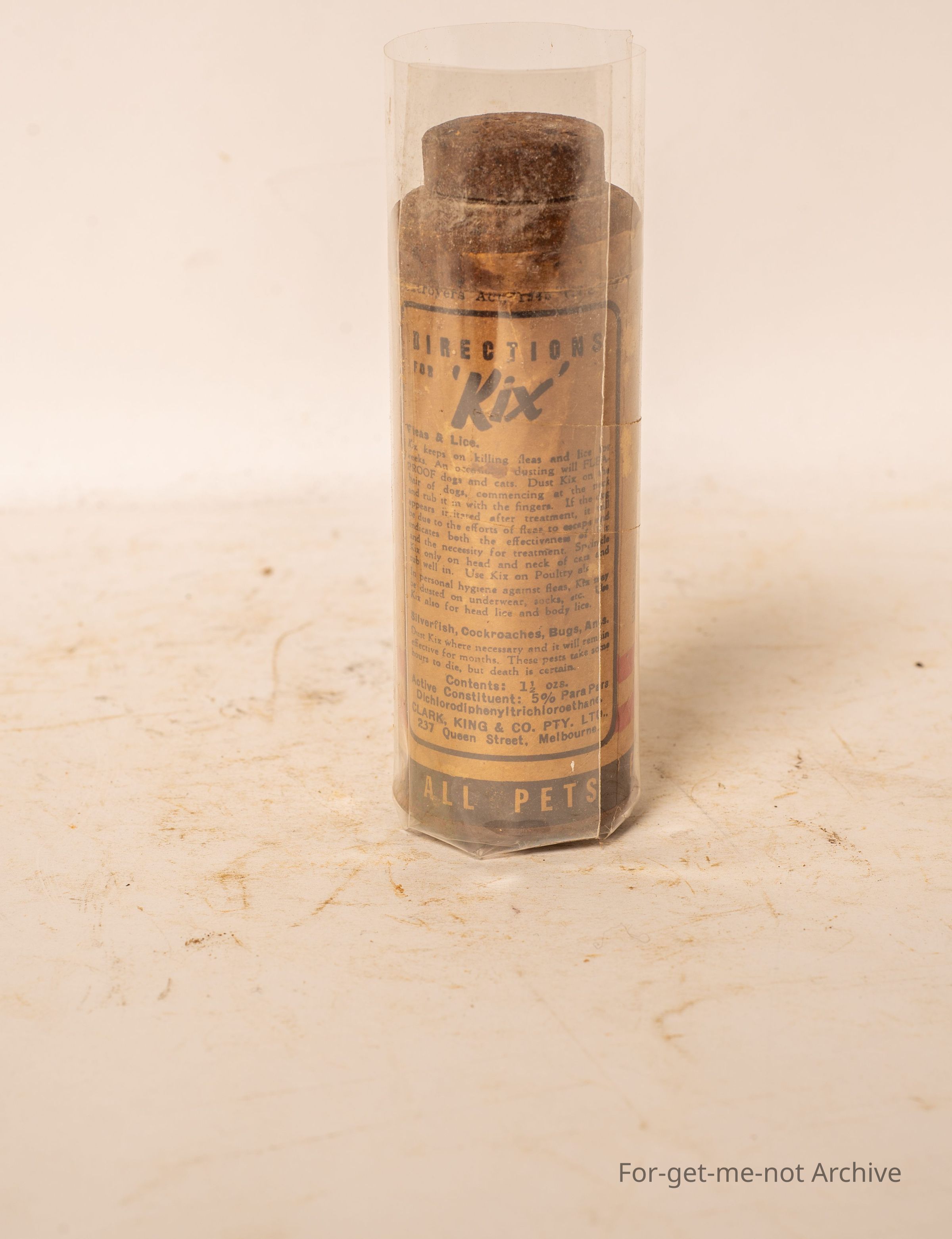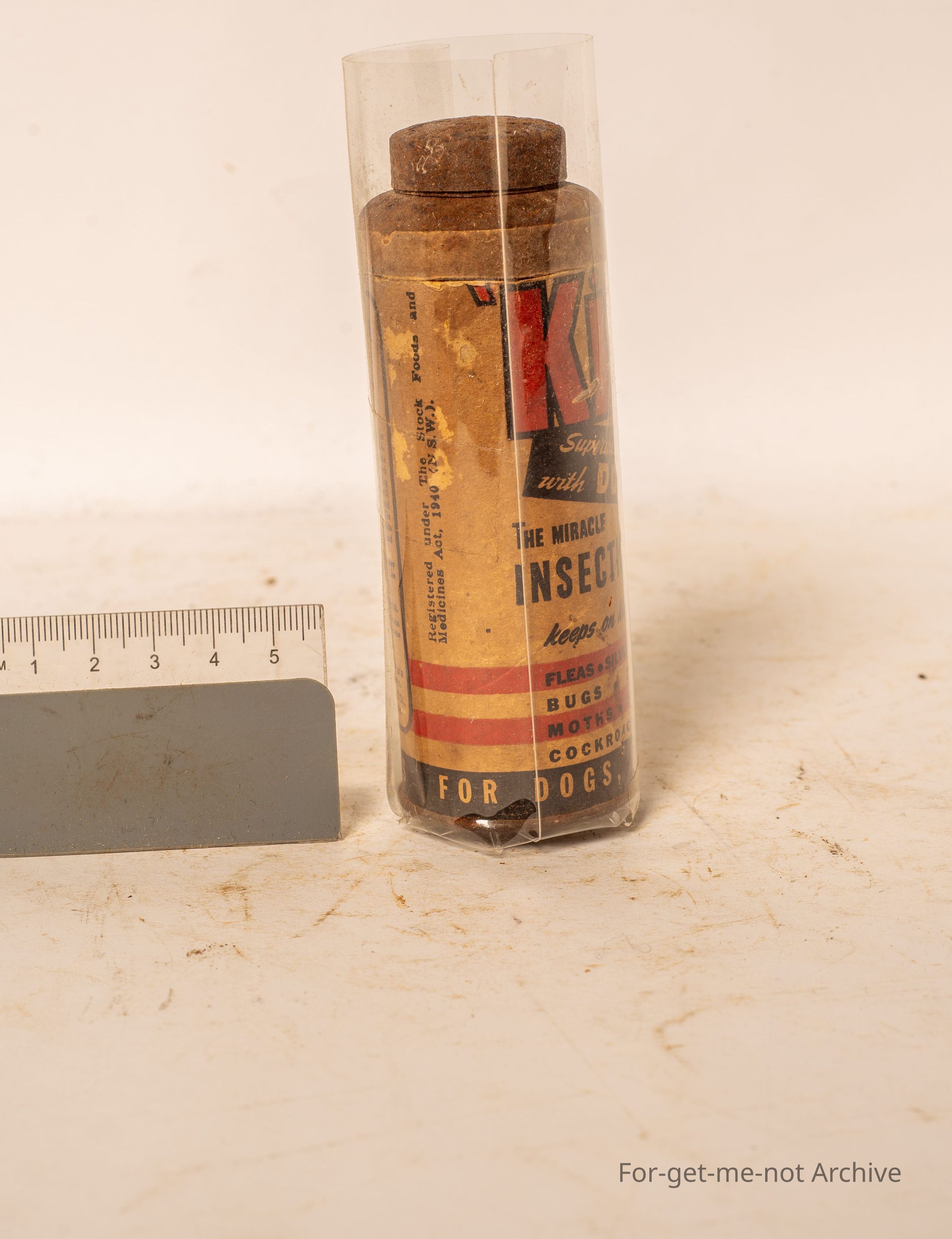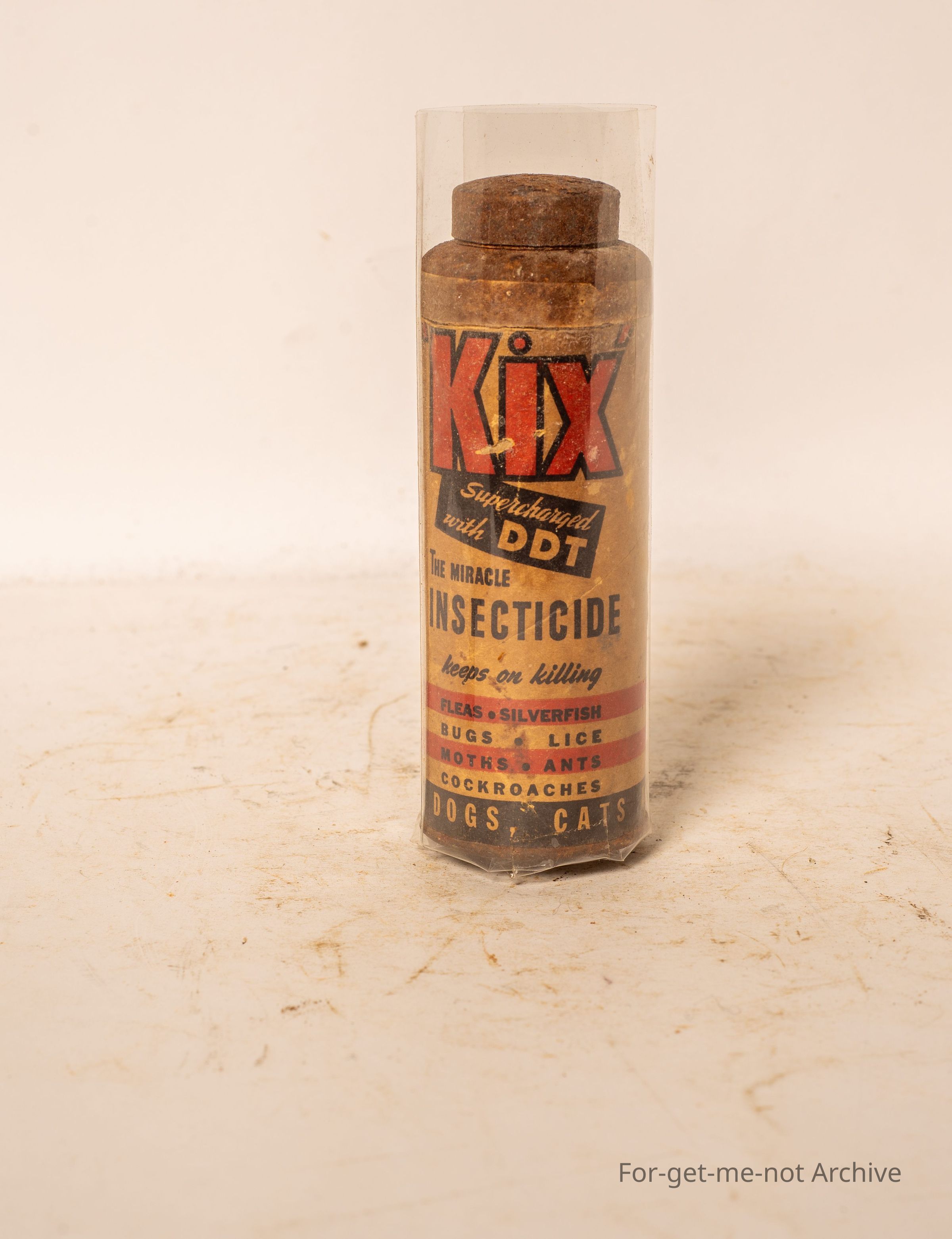 A container of Kix Insecticide. Supercharged with DDT. Kills everything including silverfish, bugs, lice ants, cockroaches, whatever it gets in contact with.